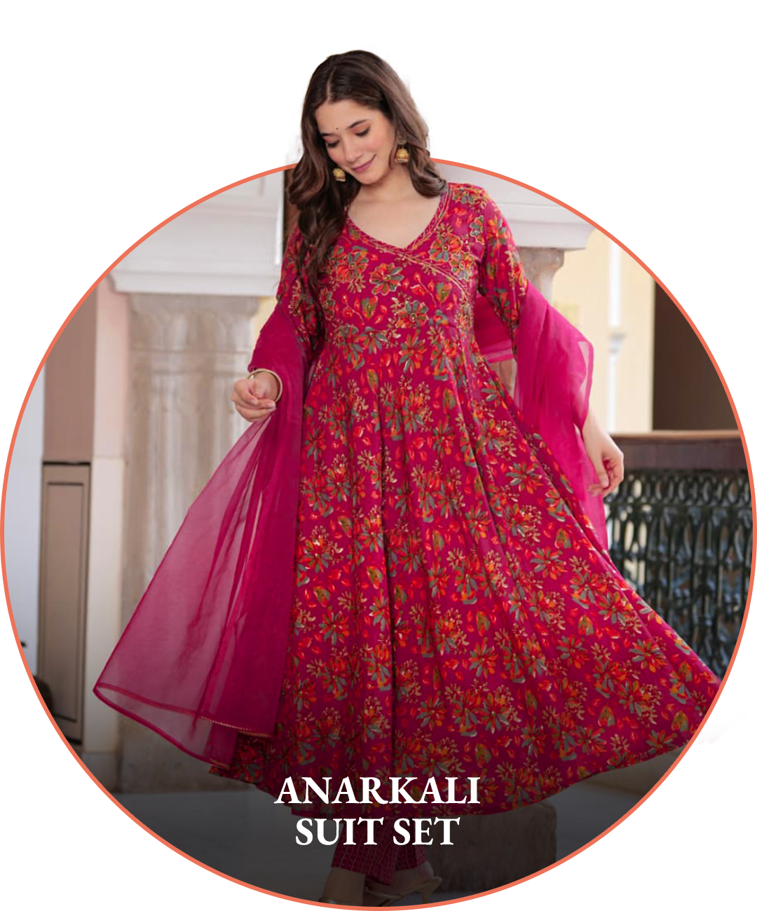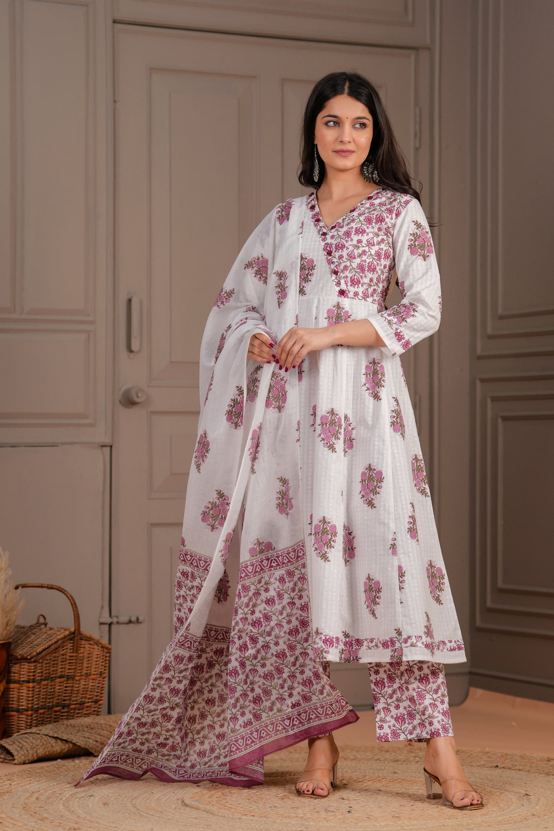 WHITE AND PINK FLORAL ANGRAKHA ANARKALI SUIT SET