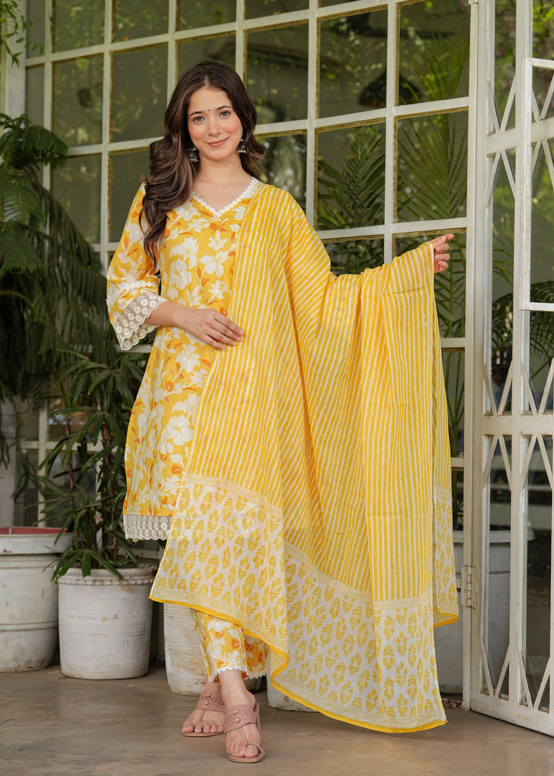 Step into elegance with this beautifully crafted yellow lace kurta pant set, designed to add...
