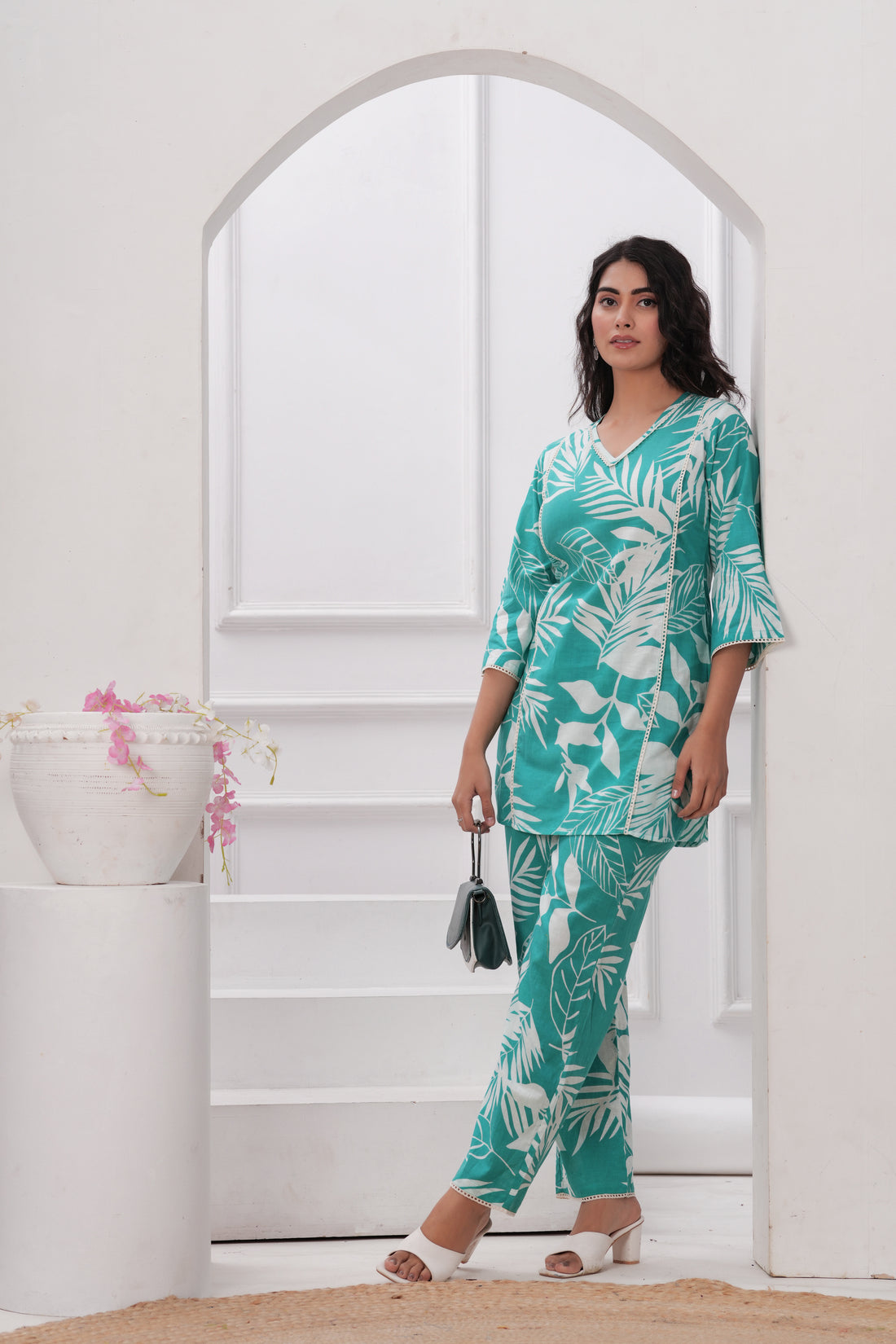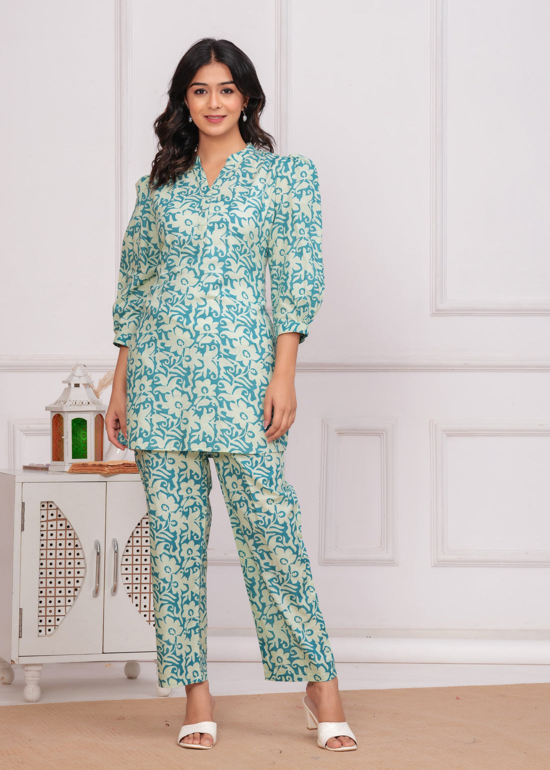 Step into subtle elegance with this pastel sea green floral cotton co-ord set, perfect for...
