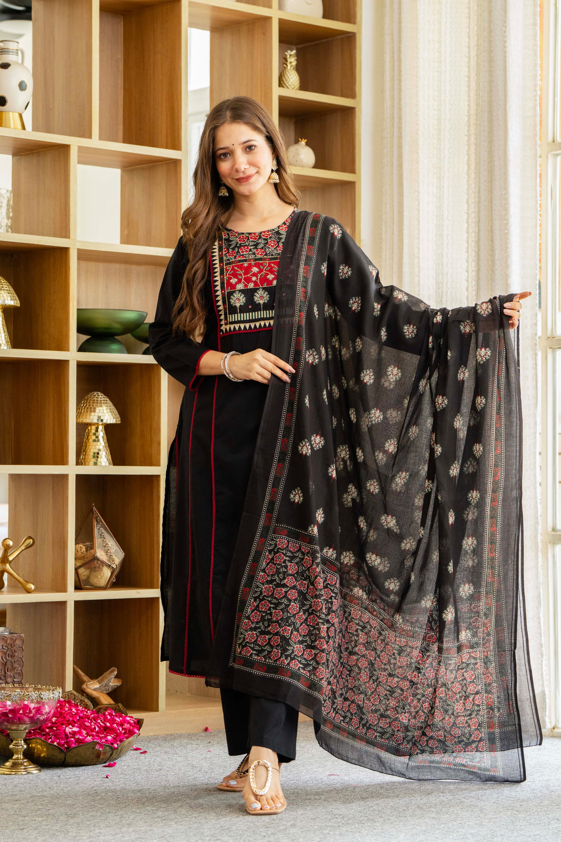 Embrace timeless elegance in this stunning solic black suit set, adorned with intricate printed yoke...