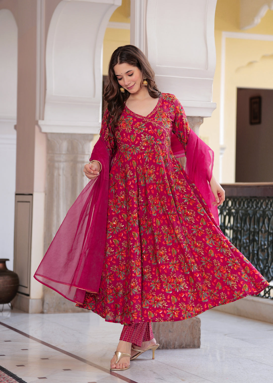 Elevate your ethnic wardrobe with this stunning fuchsia pink Anarkali suit set, featuring intricate floral...