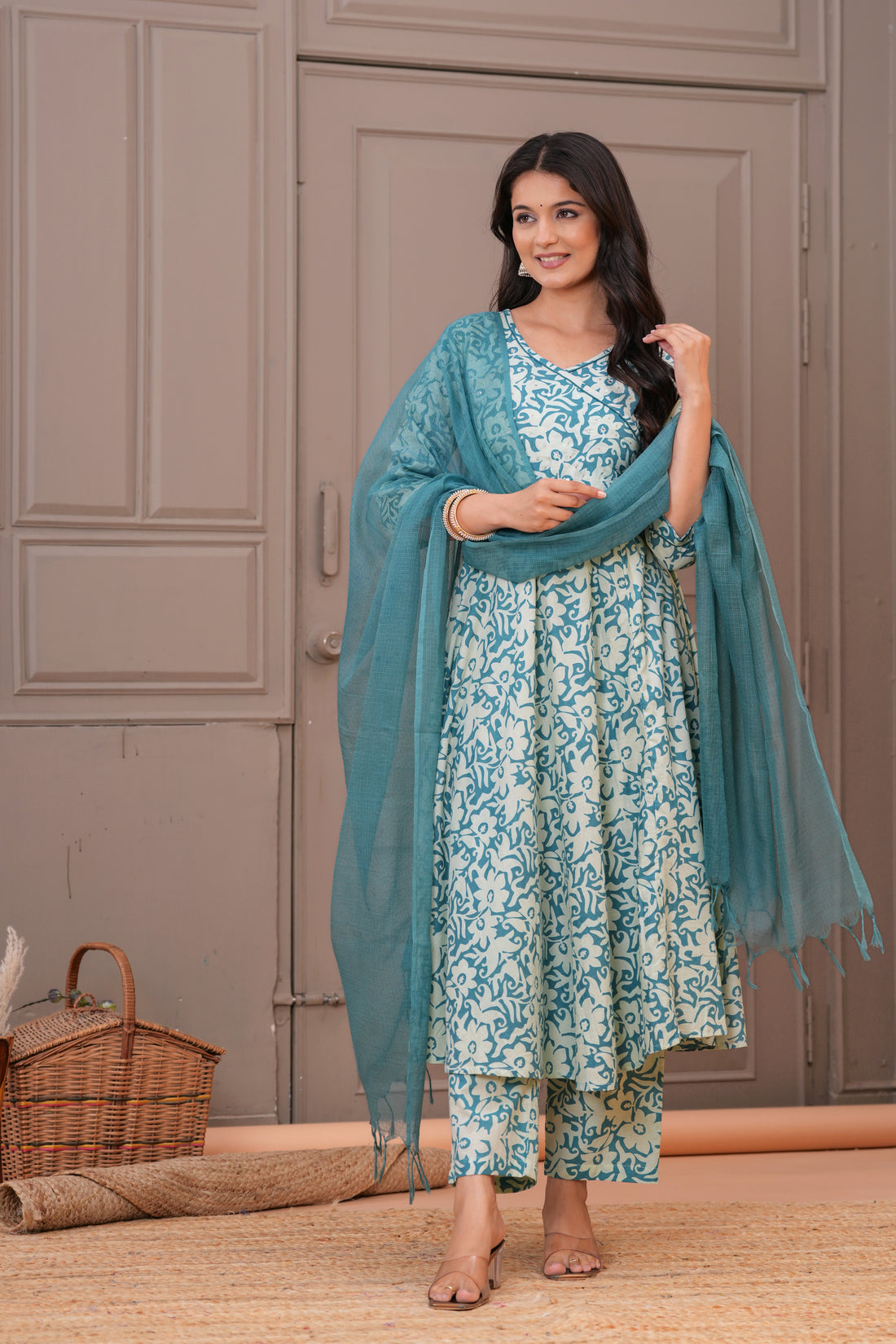 Embrace elegance with our soothing sea green Anarkali suit set, crafted in soft cotton for...