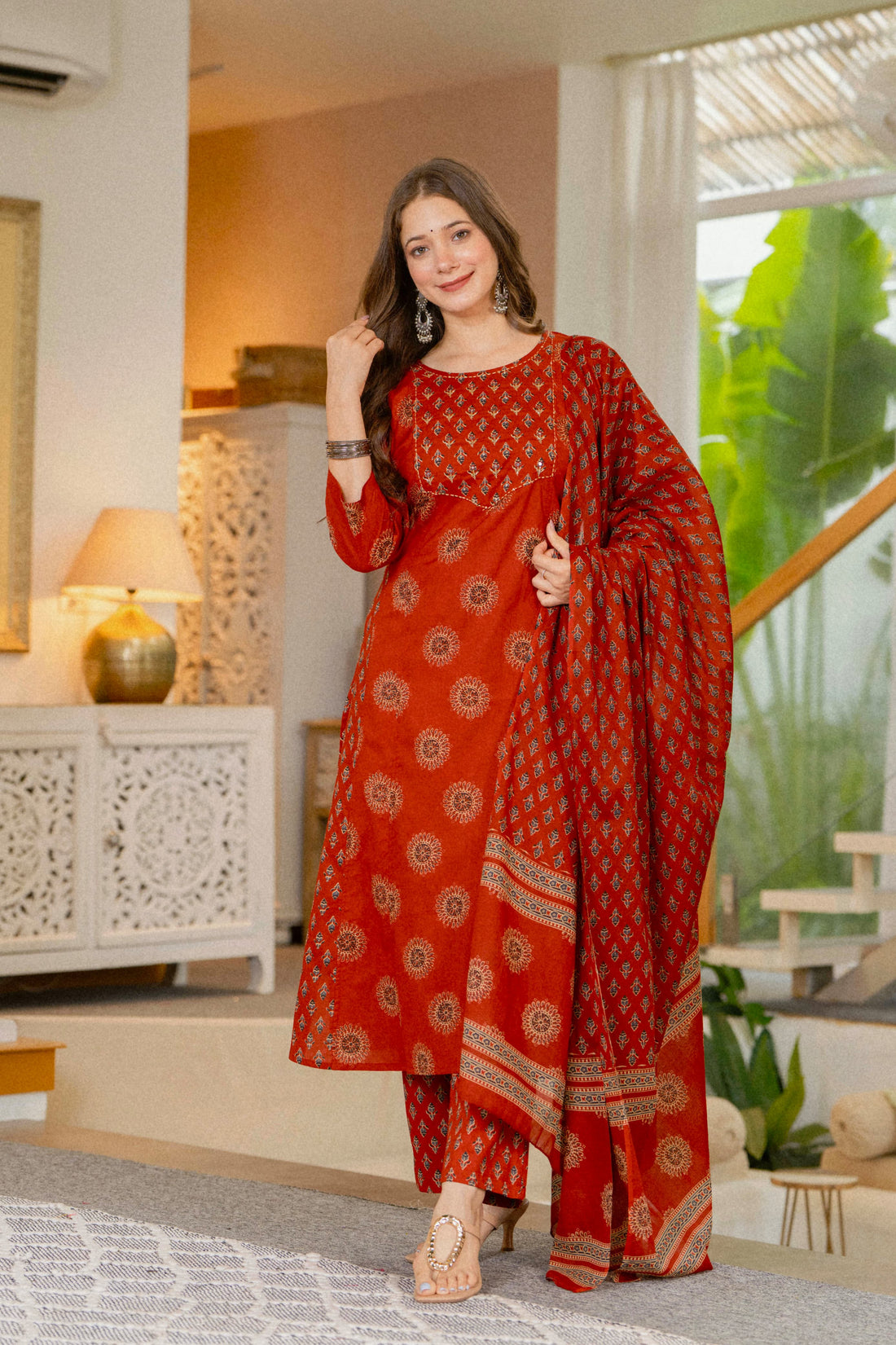 RUST ORANGE BLOCK PRINT STRAIGHT SUIT SET