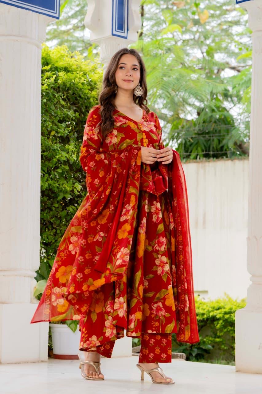 Experience timeless elegance with our Sunset Bloom Anarkali Suit Set, crafted in a rich Rust...