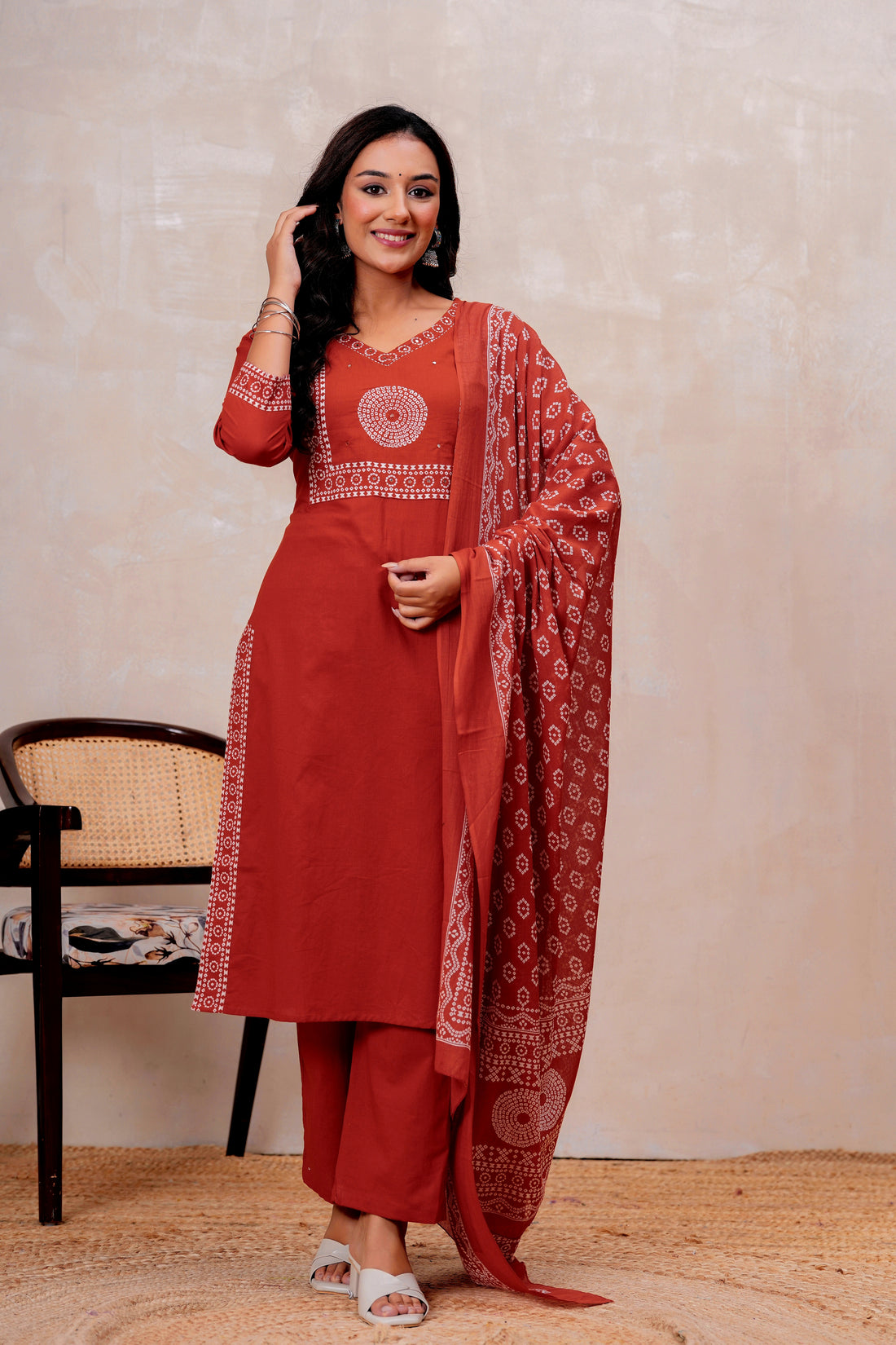 Elevate your ethnic style with this elegant Rust orange Handblock Printed Cotton Suit Set. The...
