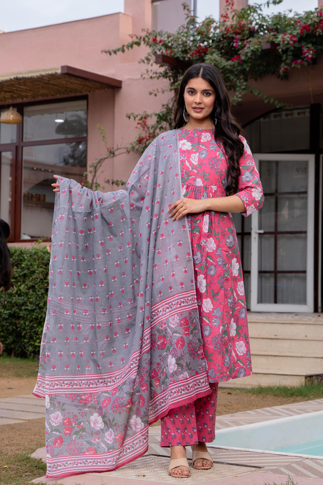 Radiate elegance in our Pink Grey floral A line cotton suit set of 3. This...
