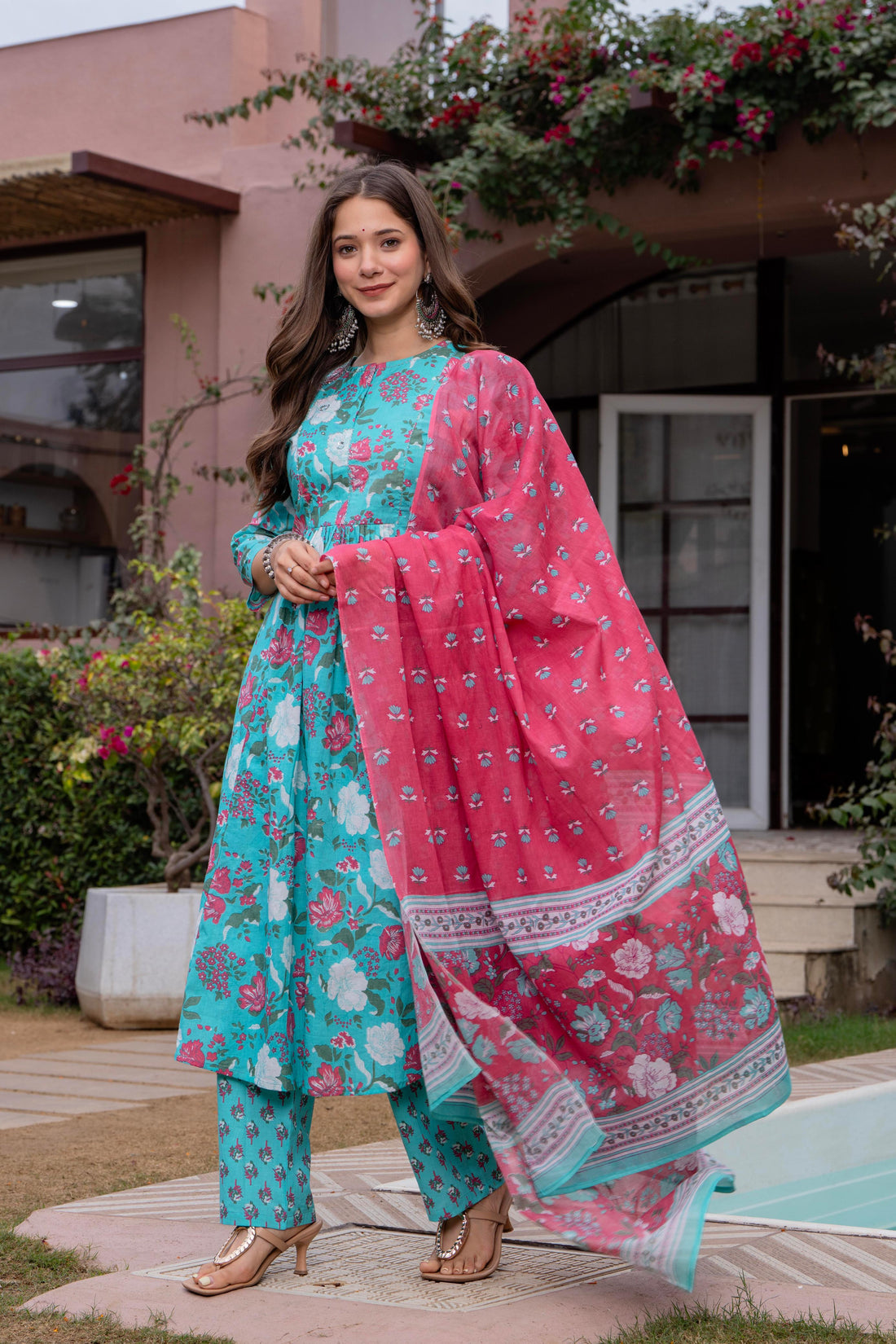 Radiate elegance in our Light Blue Pink floral A line cotton suit set of 3....