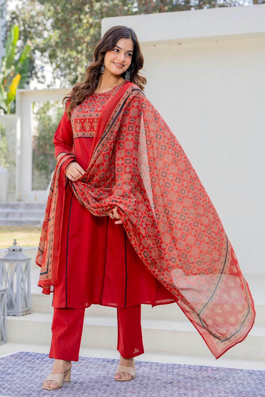 Embrace timeless elegance in this stunning solid Coral suit set, adorned with intricate printed yoke...