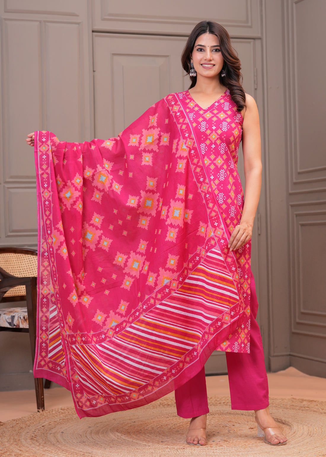 Brighten up your wardrobe with our Fuchsia Bloom Sleeveless Kurti, featuring a vibrant pink base...