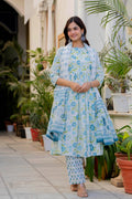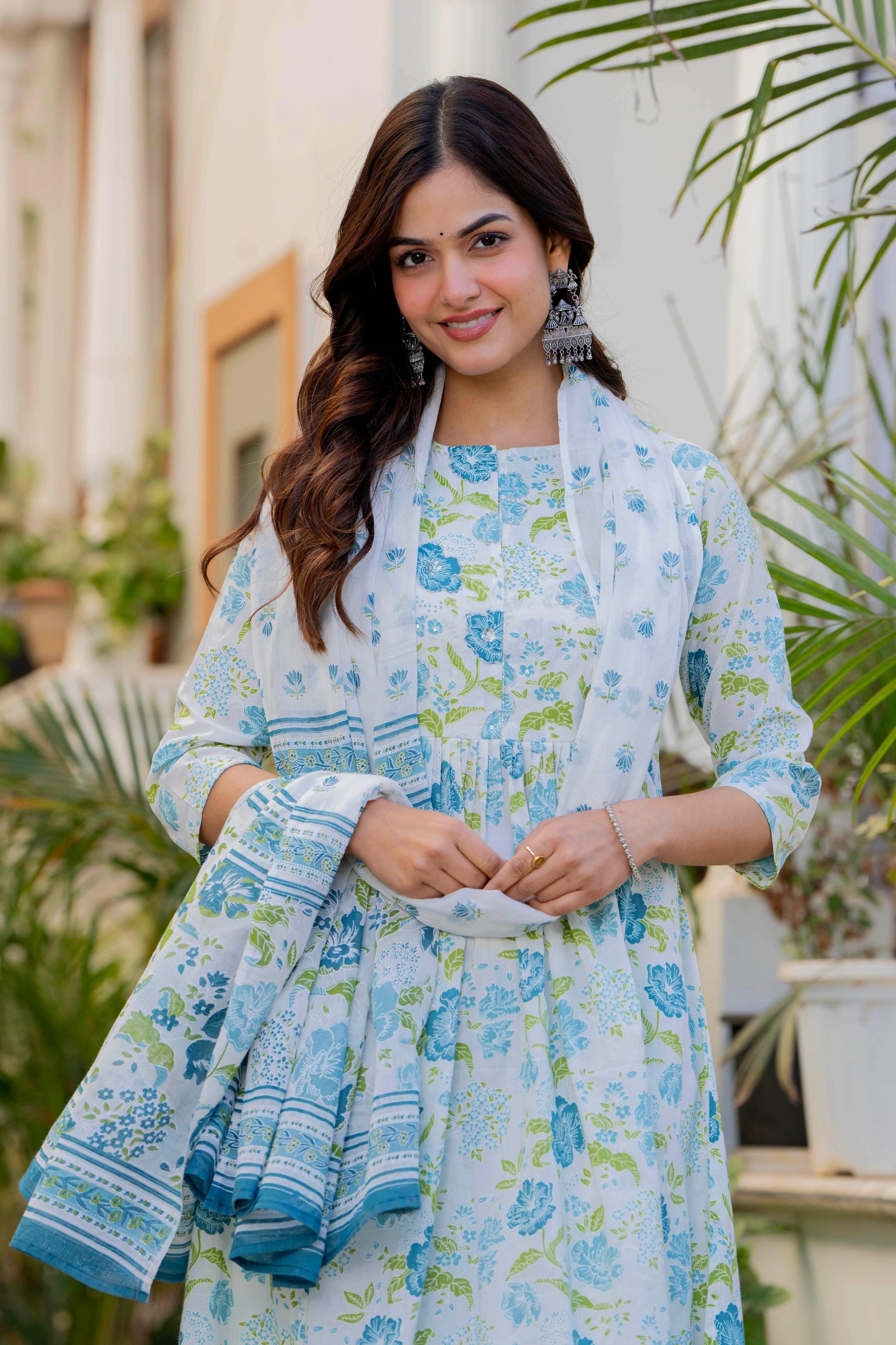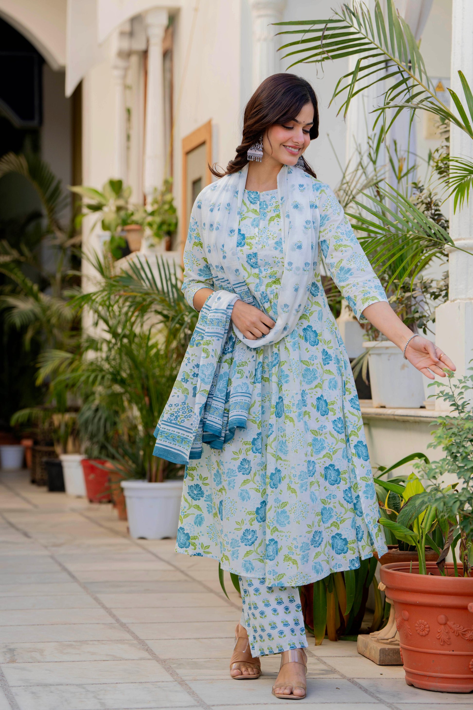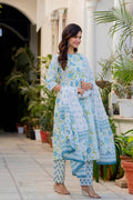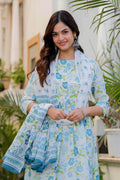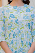 An effortless blend of grace and comfort, this pleated suit set is crafted in a soothing white base adorned with delicate rose and leaf motifs in blue and green tones. The kurta features gentle front pleats that add fluid movement and a flattering fall, while the intricately printed yoke and sleeves bring a touch of artisanal charm. Paired with coordinated printed straight pants and a graceful dupatta, this set is perfect for daytime festivities, intimate gatherings, or elegant everyday wear. Light, breathable, and timeless—this ensemble celebrates understated beauty with every detail.