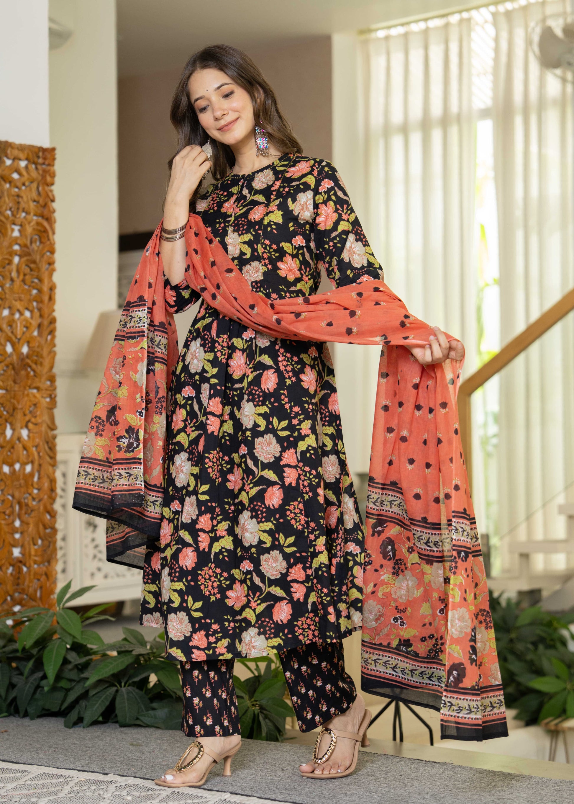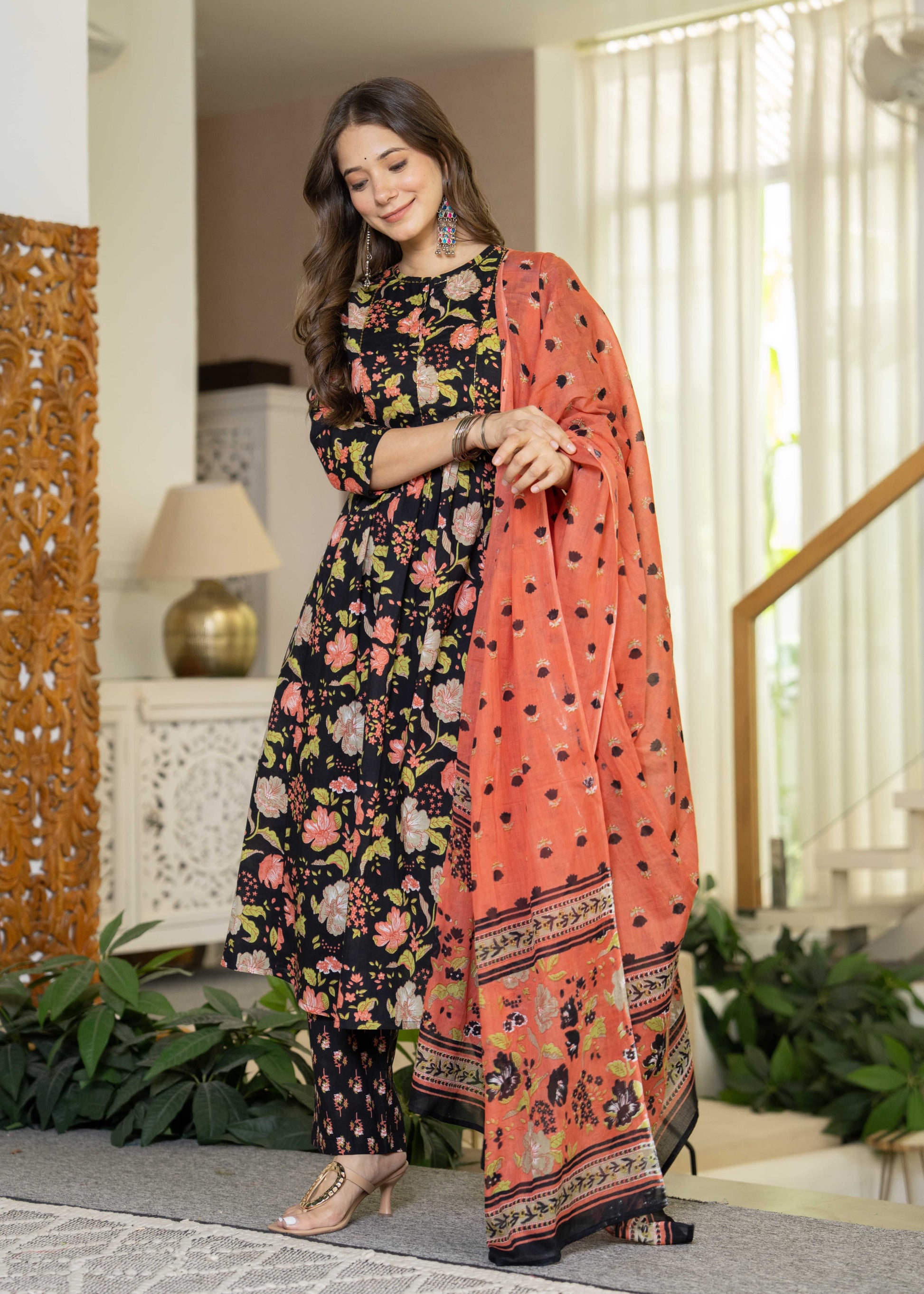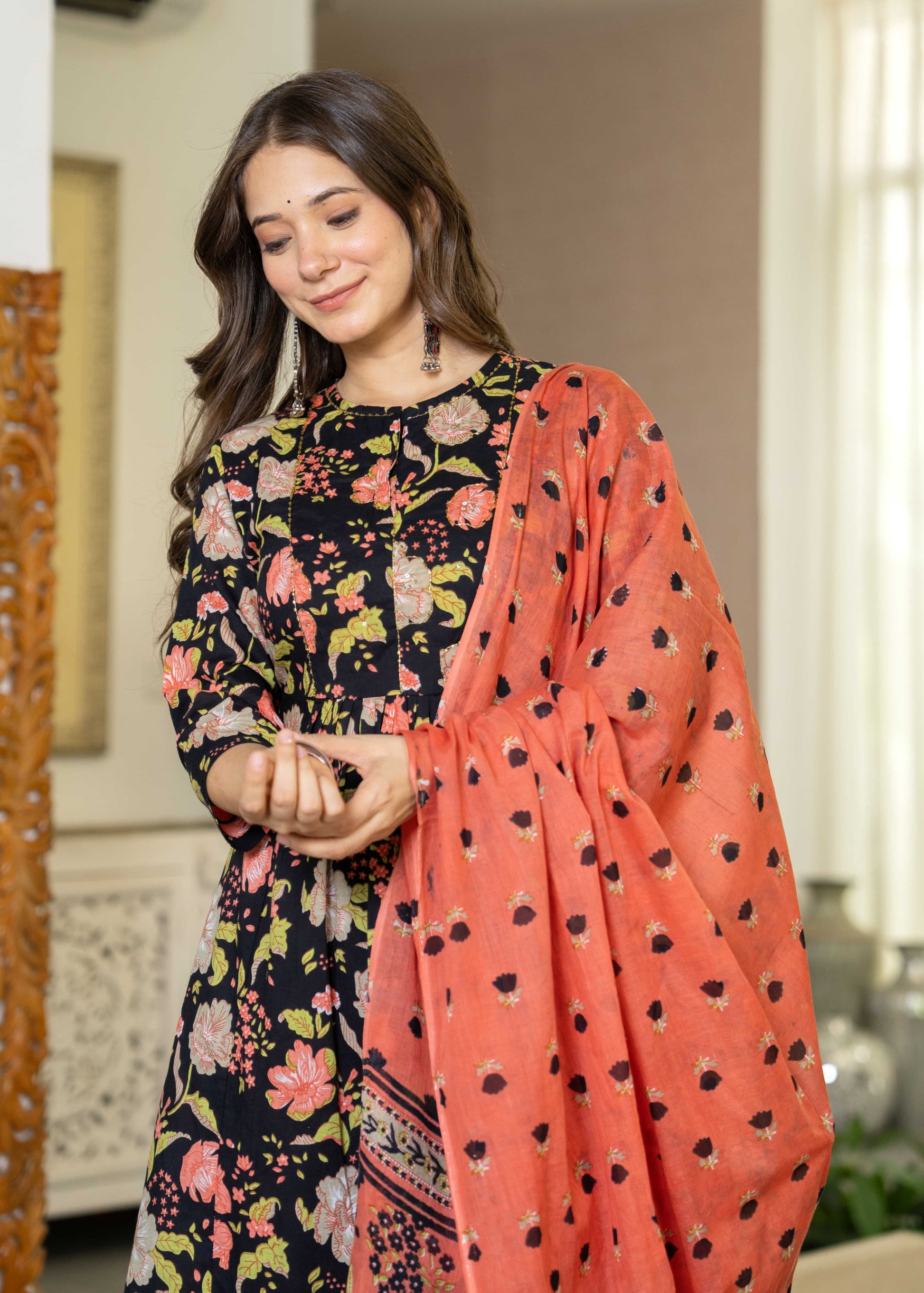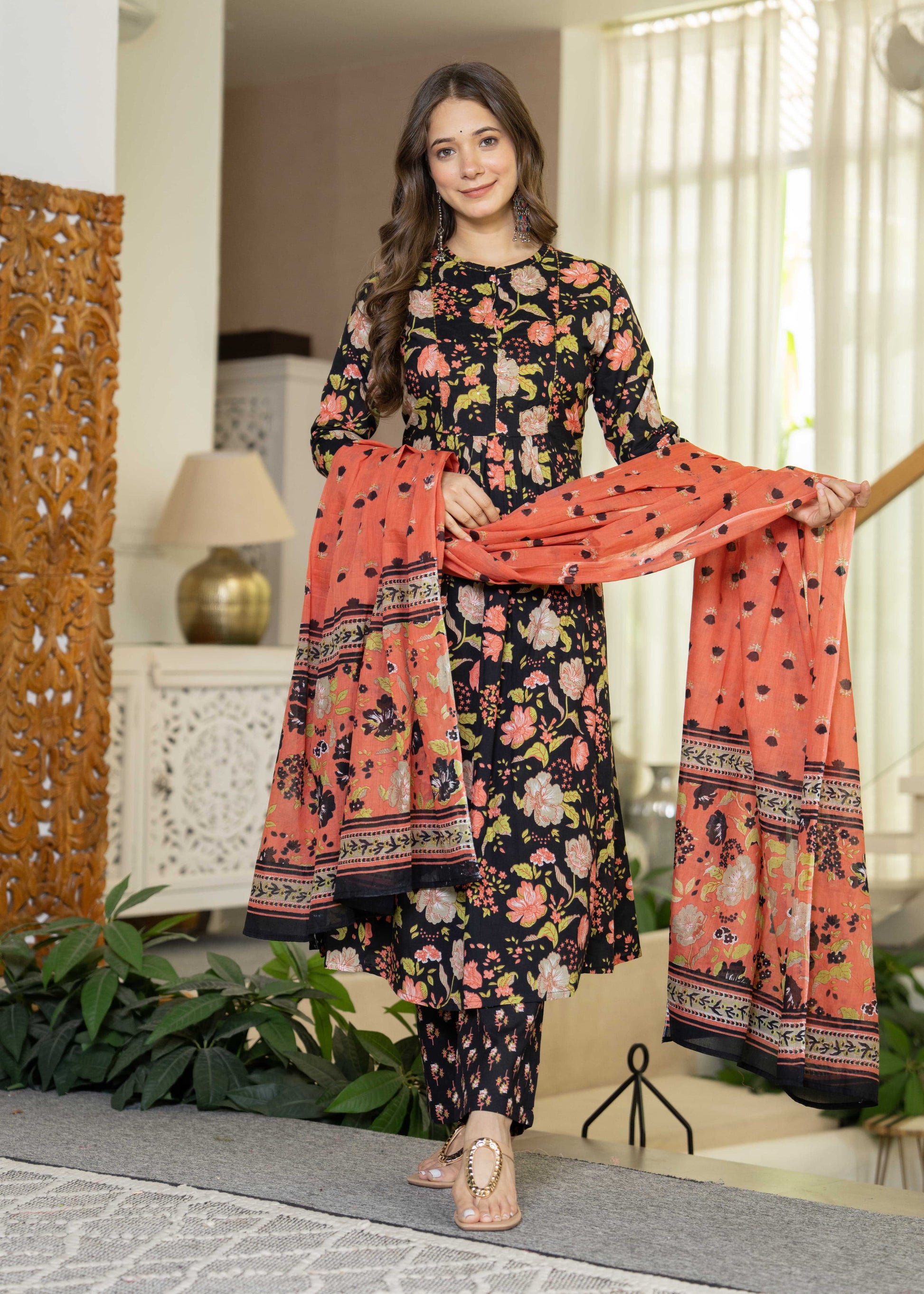 Radiate elegance in our Black peach floral A line cotton suit set of 3. This exquisite suit set is Crafted with breathable cotton features a black floral round neck kurta with Beautiful hand embroidery given on yoke, black pant with small soothing print, a peach dupatta which gives a unique style to your look. A perfect outfit for your casual outing or for any special ocassion.