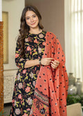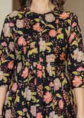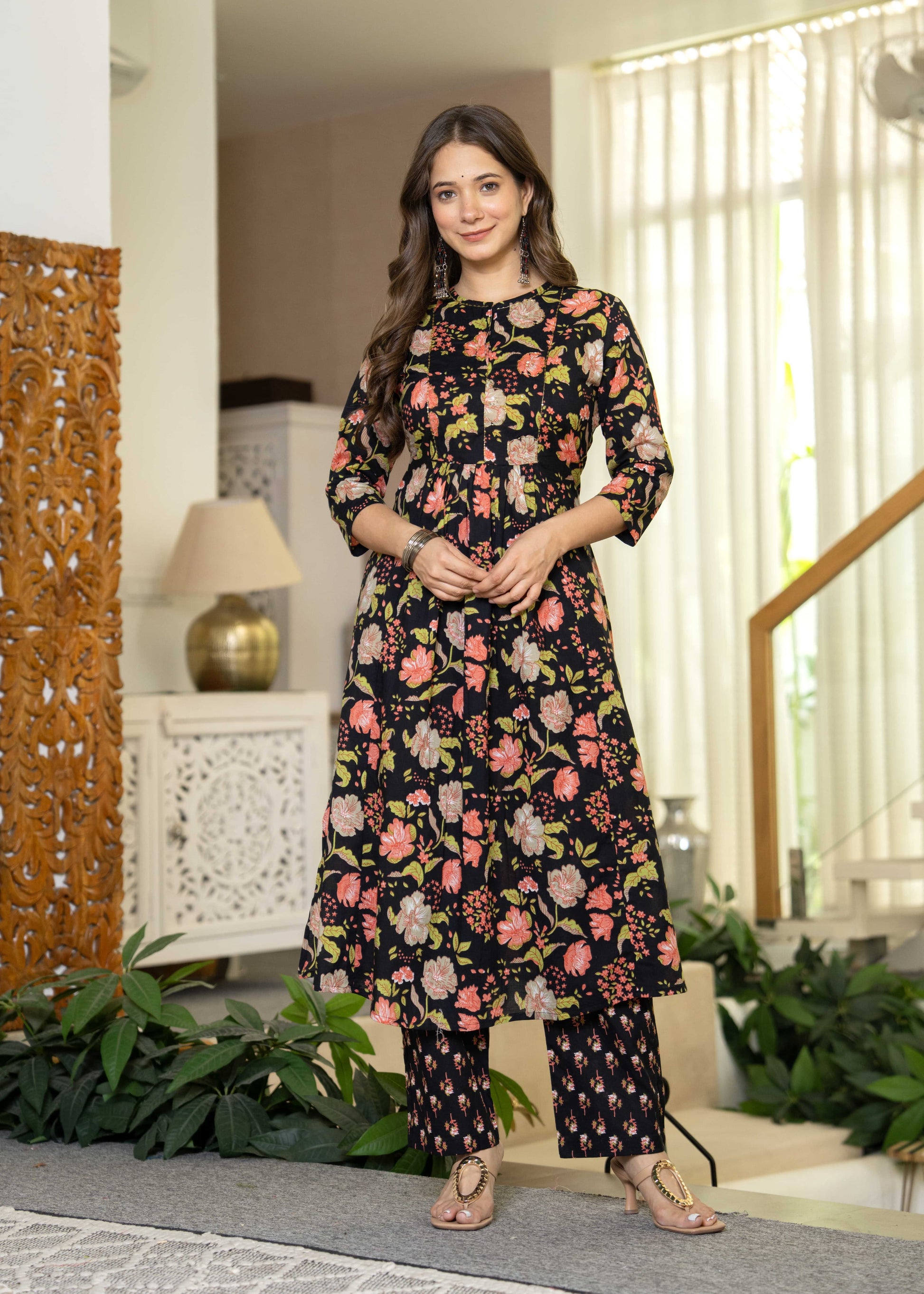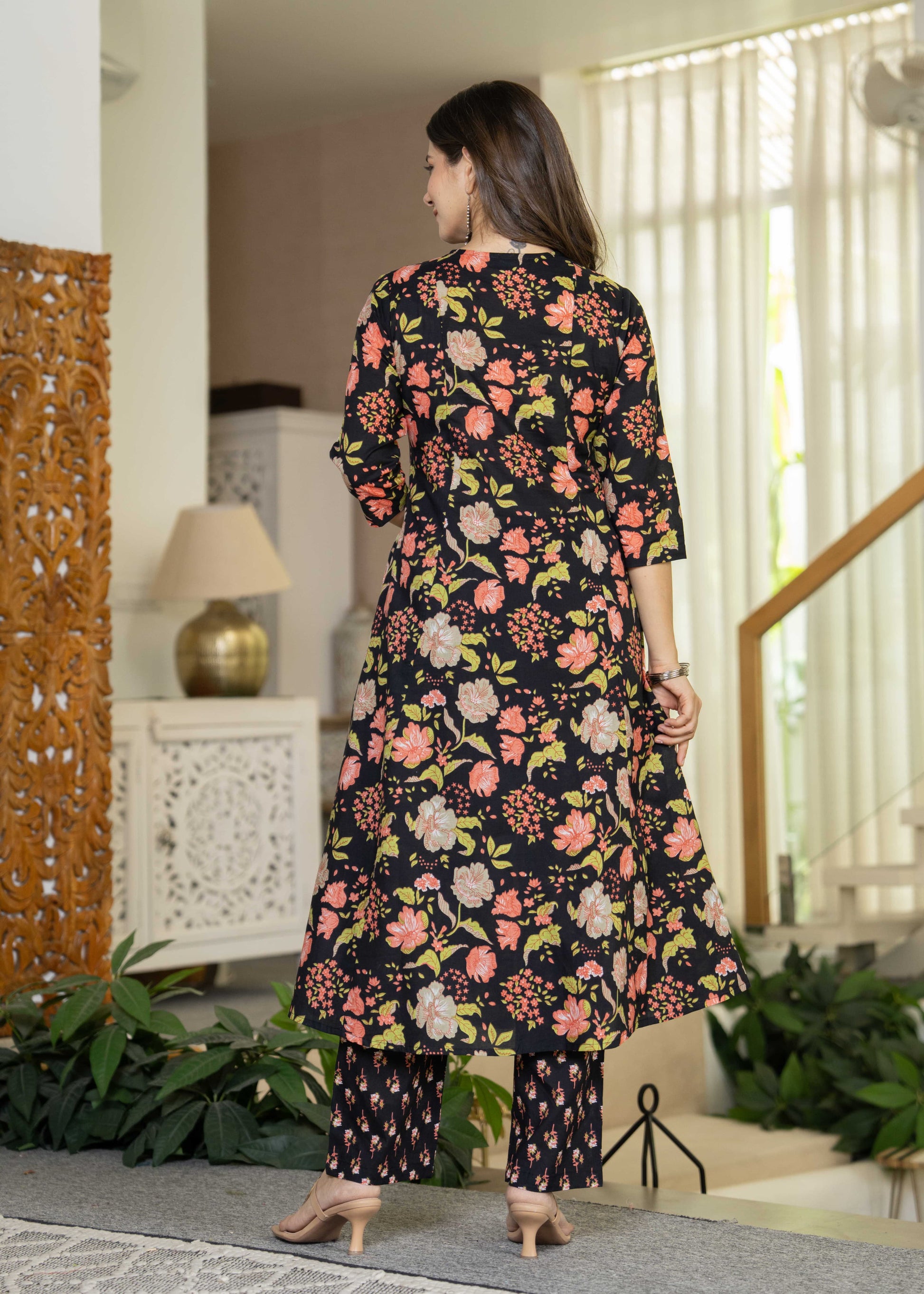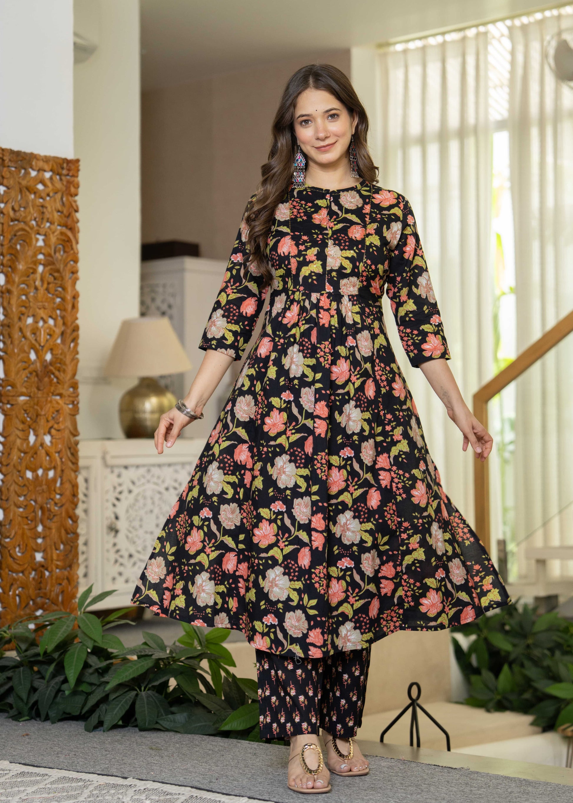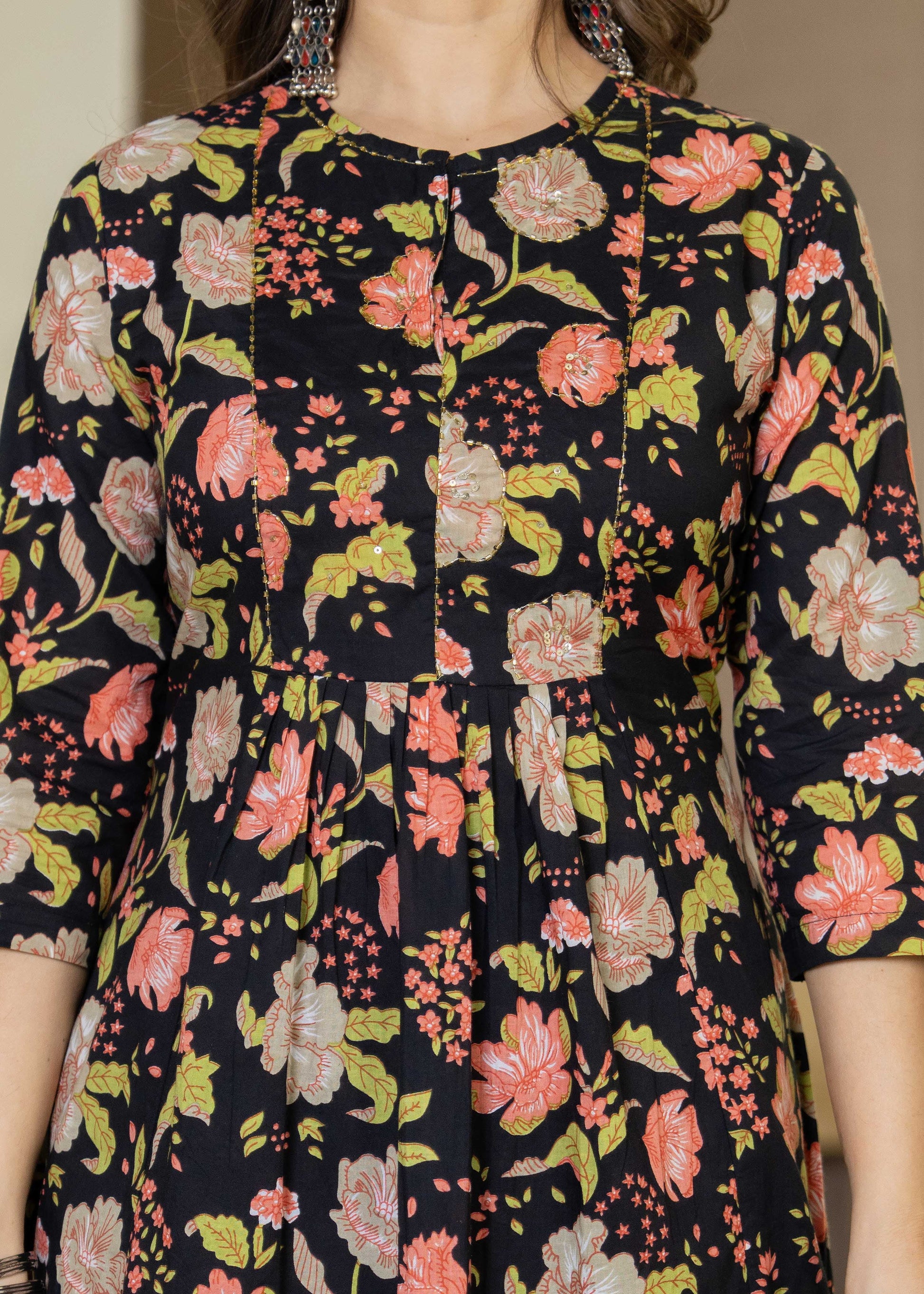 Radiate elegance in our Black peach floral A line cotton suit set of 3. This exquisite suit set is Crafted with breathable cotton features a black floral round neck kurta with Beautiful hand embroidery given on yoke, black pant with small soothing print, a peach dupatta which gives a unique style to your look. A perfect outfit for your casual outing or for any special ocassion.