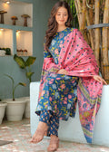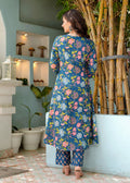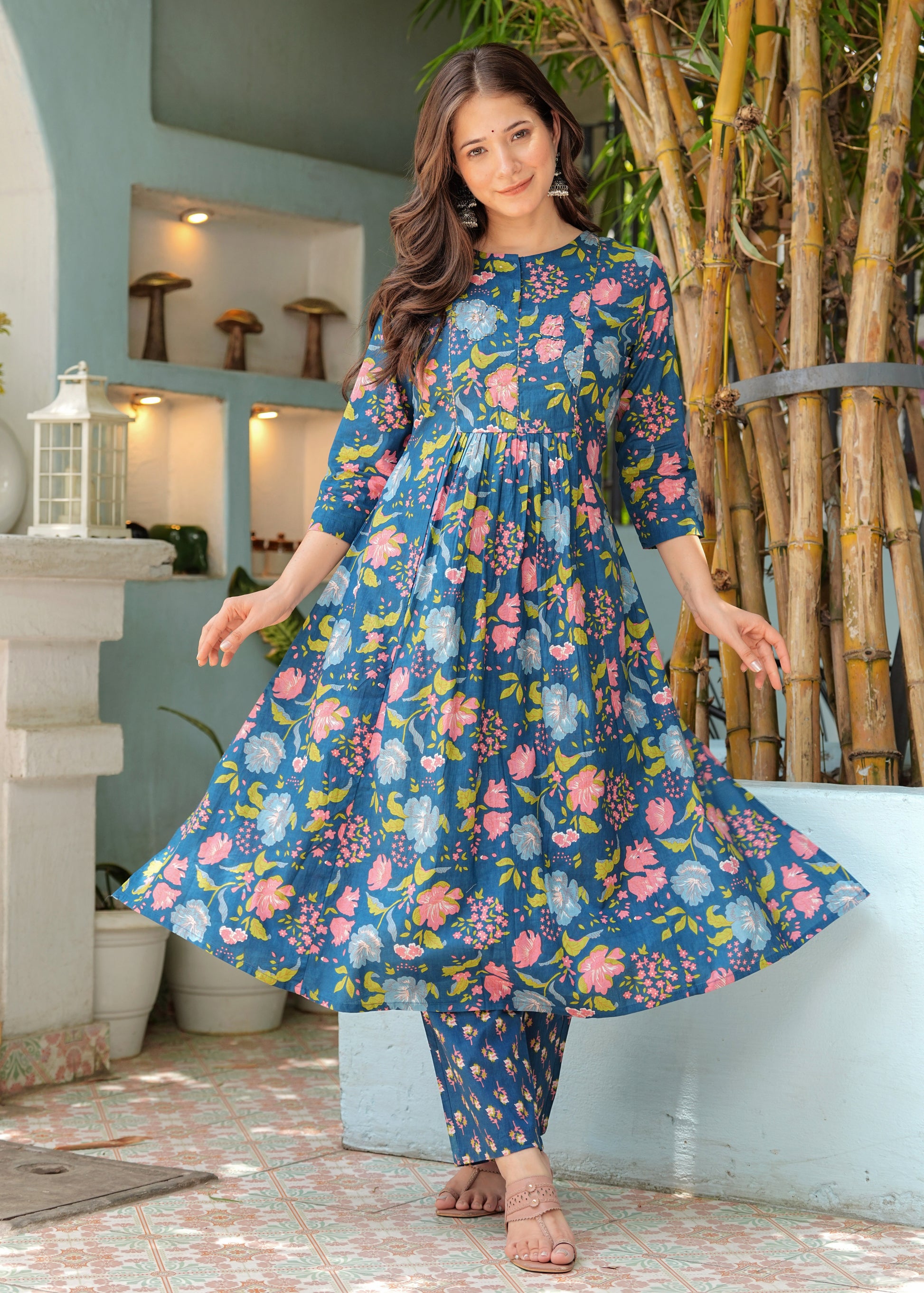 Radiate elegance in our Blue Pink floral A line cotton suit set of 3. This exquisite suit set is Crafted with breathable cotton features a blue floral round neck kurta with Beautiful hand embroidery given on yoke, blue pant with small soothing print, a pink dupatta which gives a unique style to your look. A perfect outfit for your casual outing or for any special ocassion