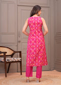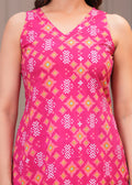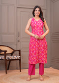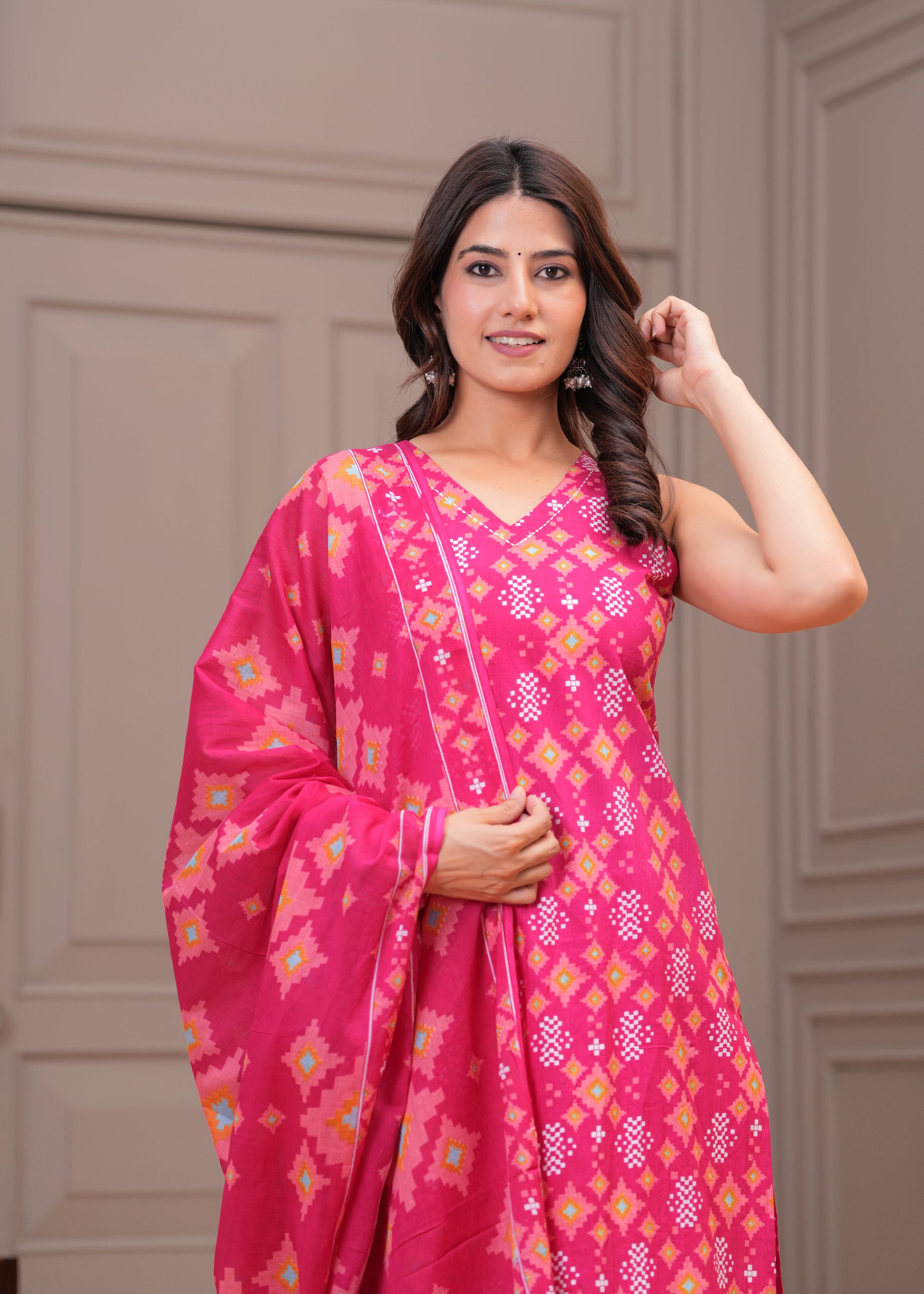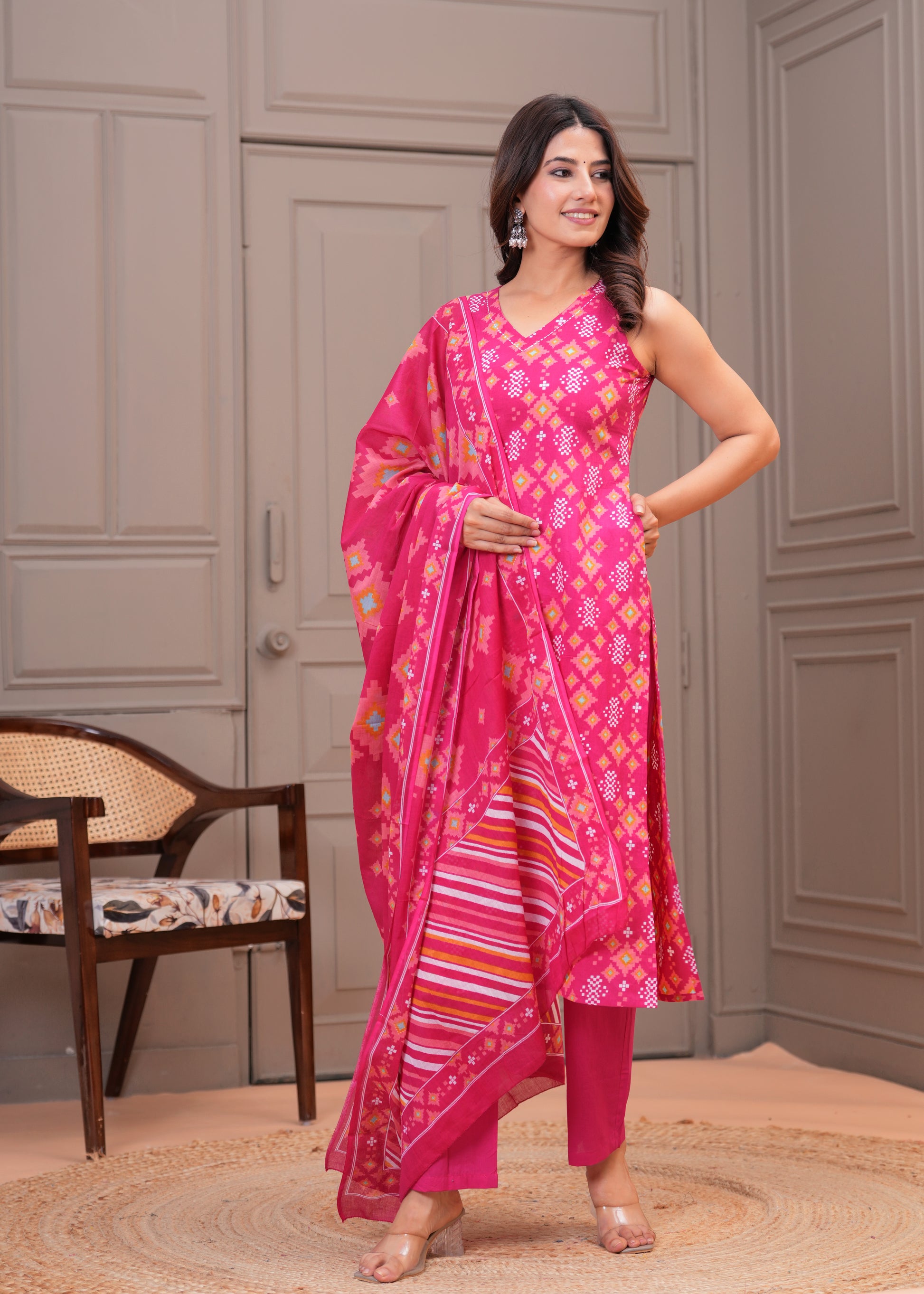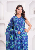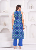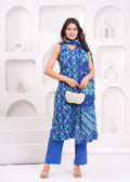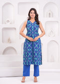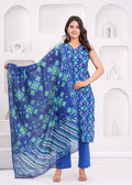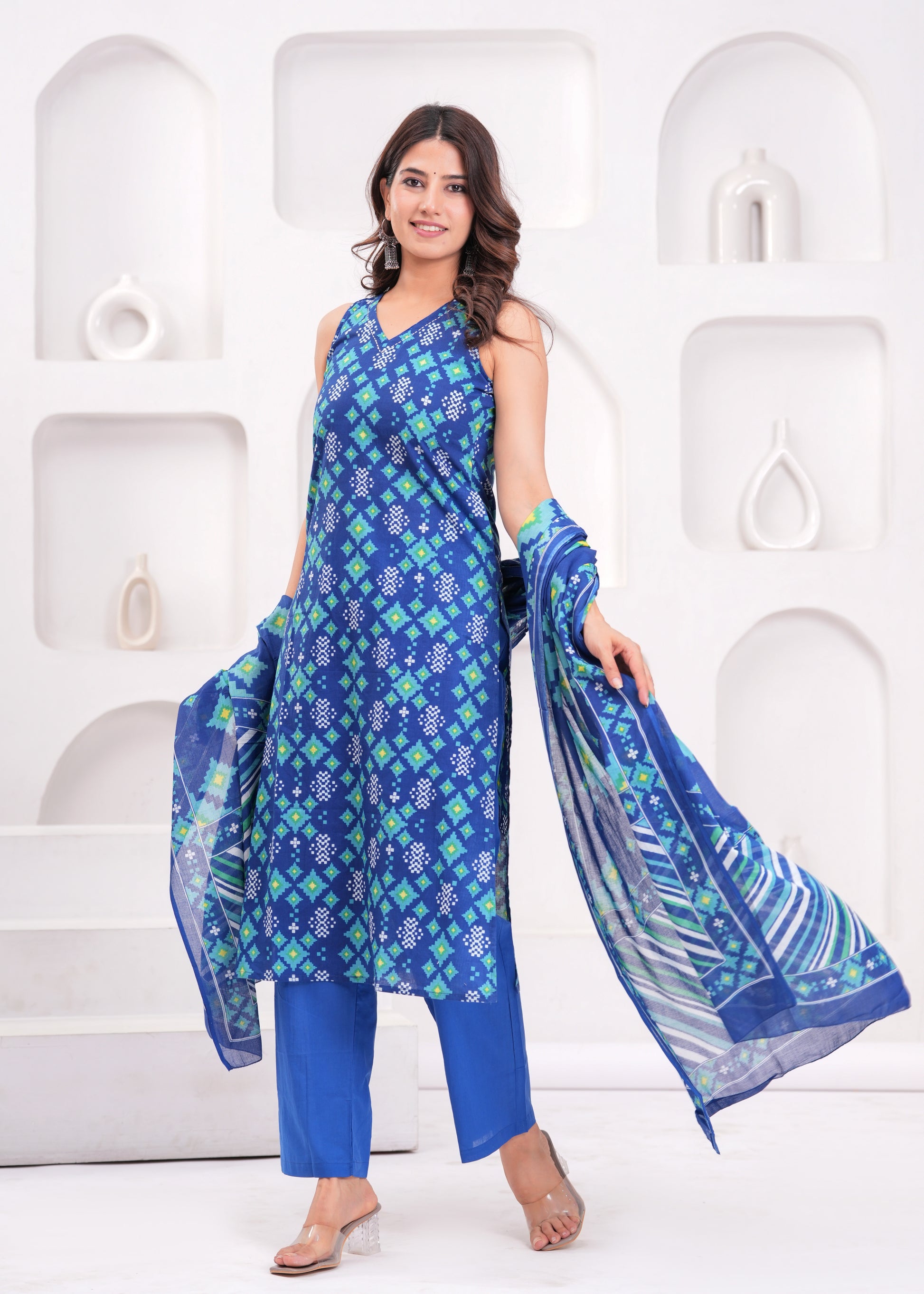Step into elegance with this beautiful blue printed suit set. This set features:Kurta: Sleeveless, straight-cut kurta with a V-neckline and an all-over geometric print in shades of green and white on a rich blue base. Designed for comfort and style, it drapes effortlessly and enhances your silhouette.Pants: Solid blue straight pants made with a matching cotton blend, offering both structure and ease.Dupatta: Lightweight printed dupatta with complementing patterns and stripes, adding a touch of grace and flow to the overall look.This vibrant suit set is perfect for daytime outings, festive gatherings, or casual office wear.