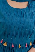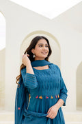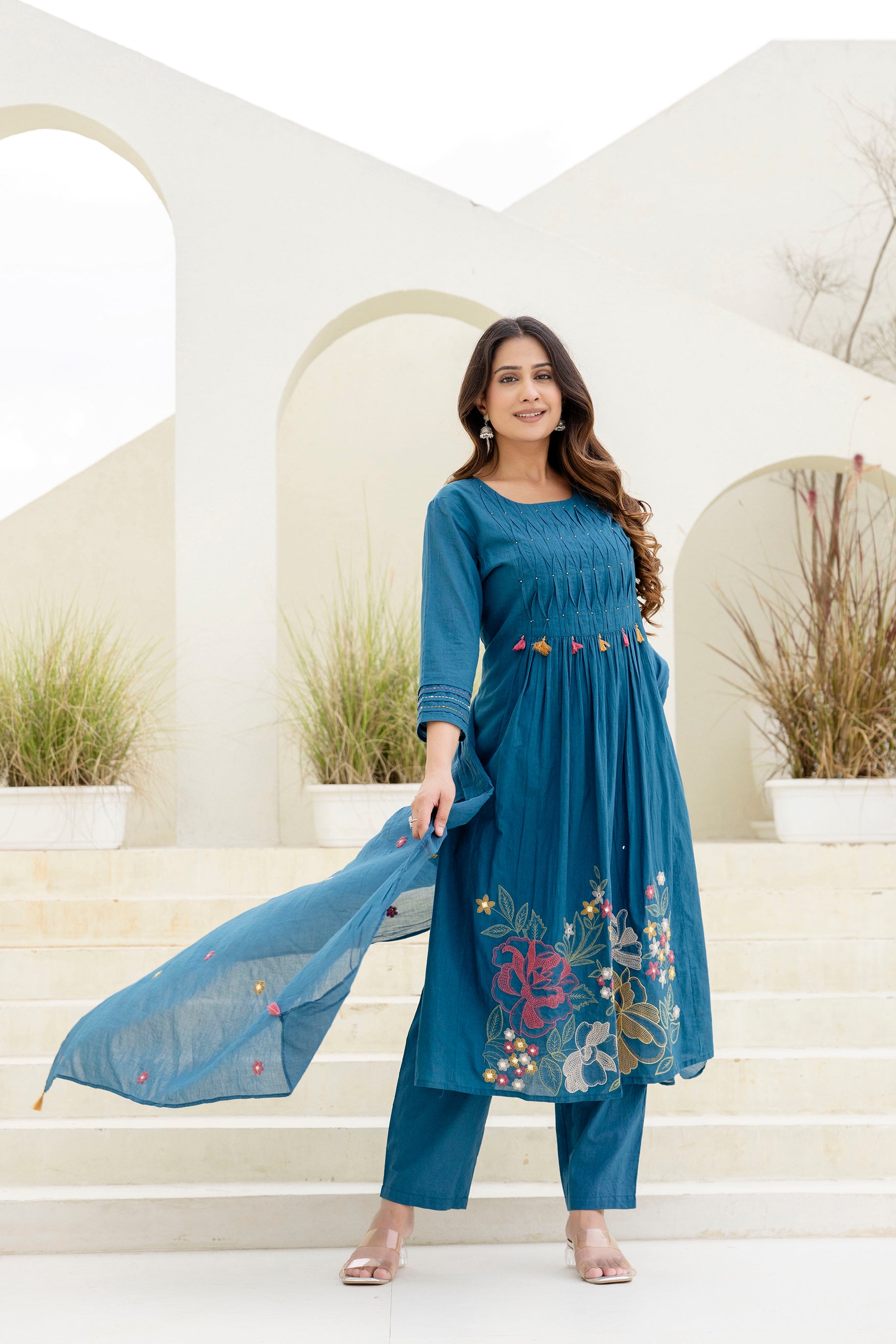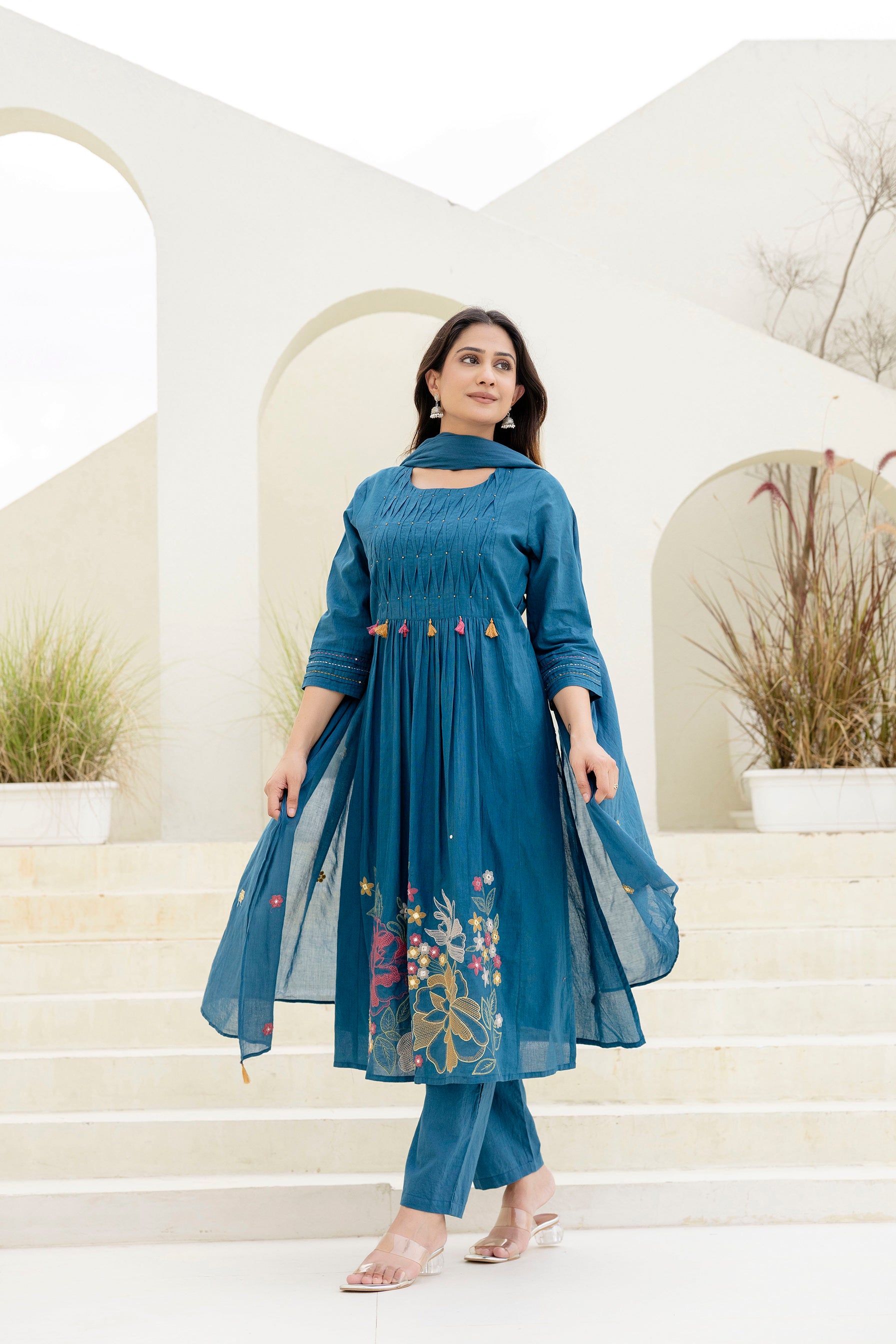 Radiate festive elegance in this stunning Blue suit set, featuring delicate thread embroidery of floral motifs. The gathered kurta is paired with matching straight pants and a soft dupatta adorned with dainty tassels and embroidered details. Perfect for daytime celebrations or festive evenings, this ensemble blends vibrant charm with graceful sophistication.