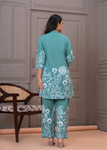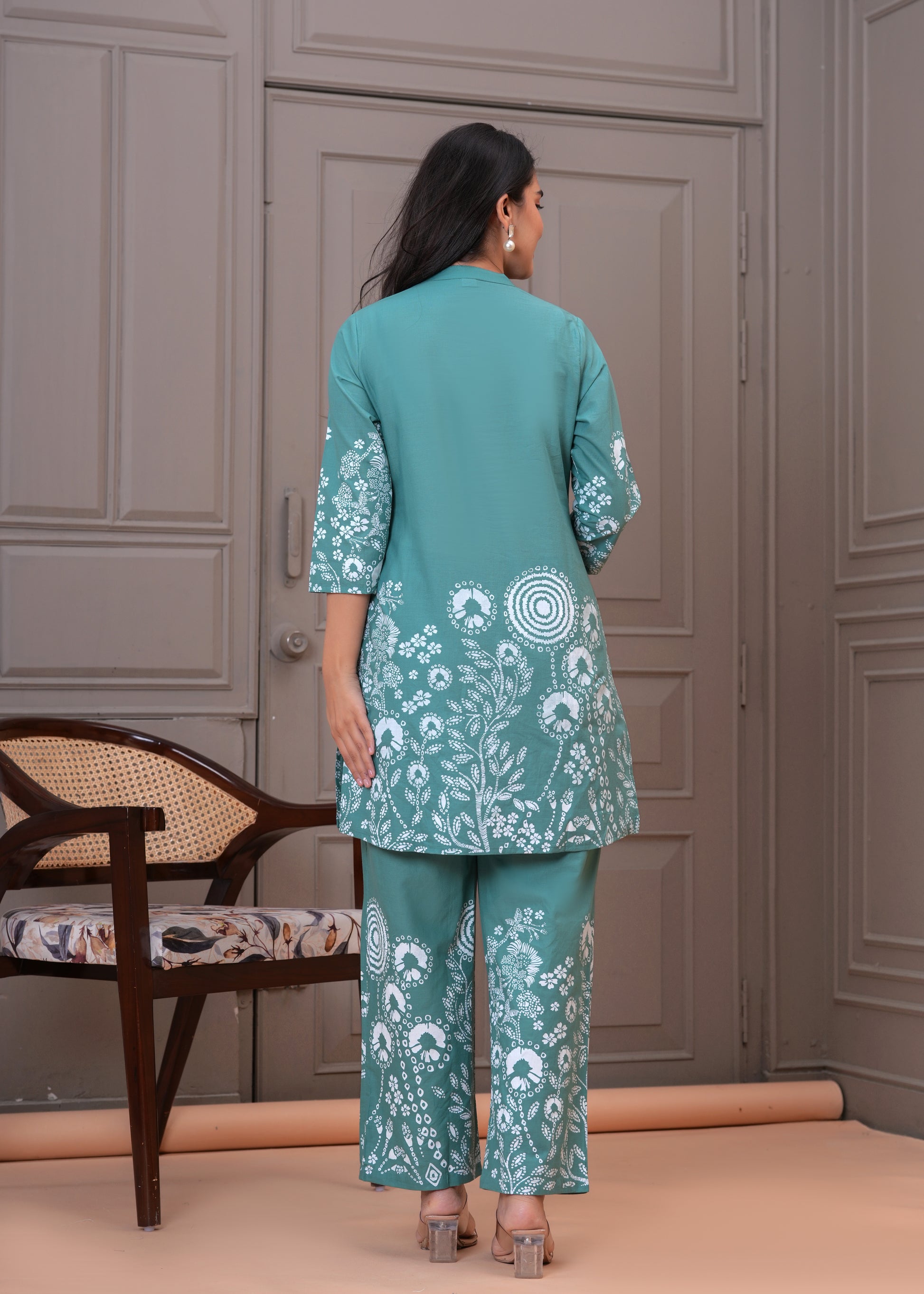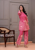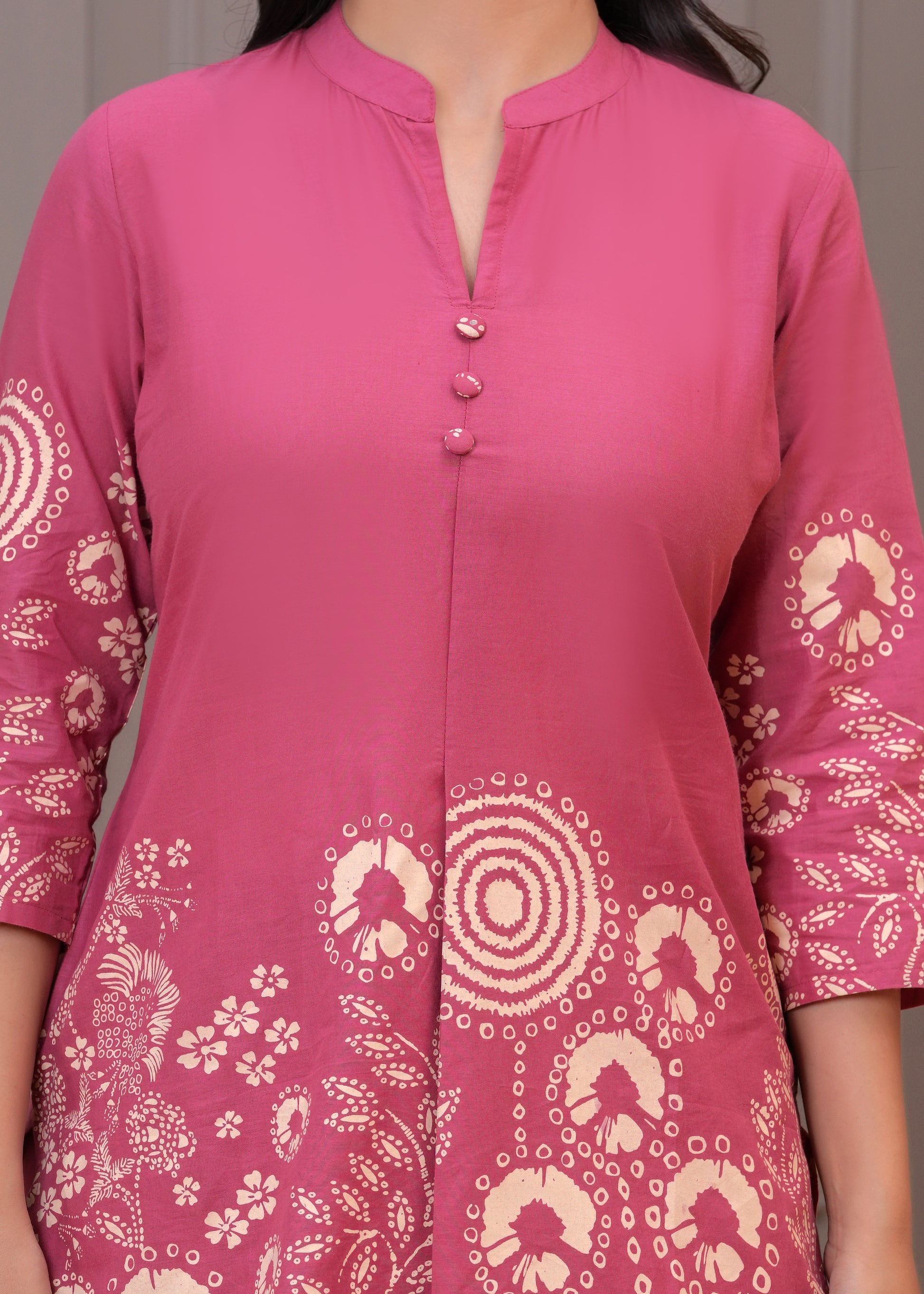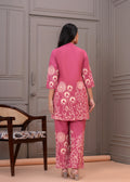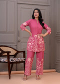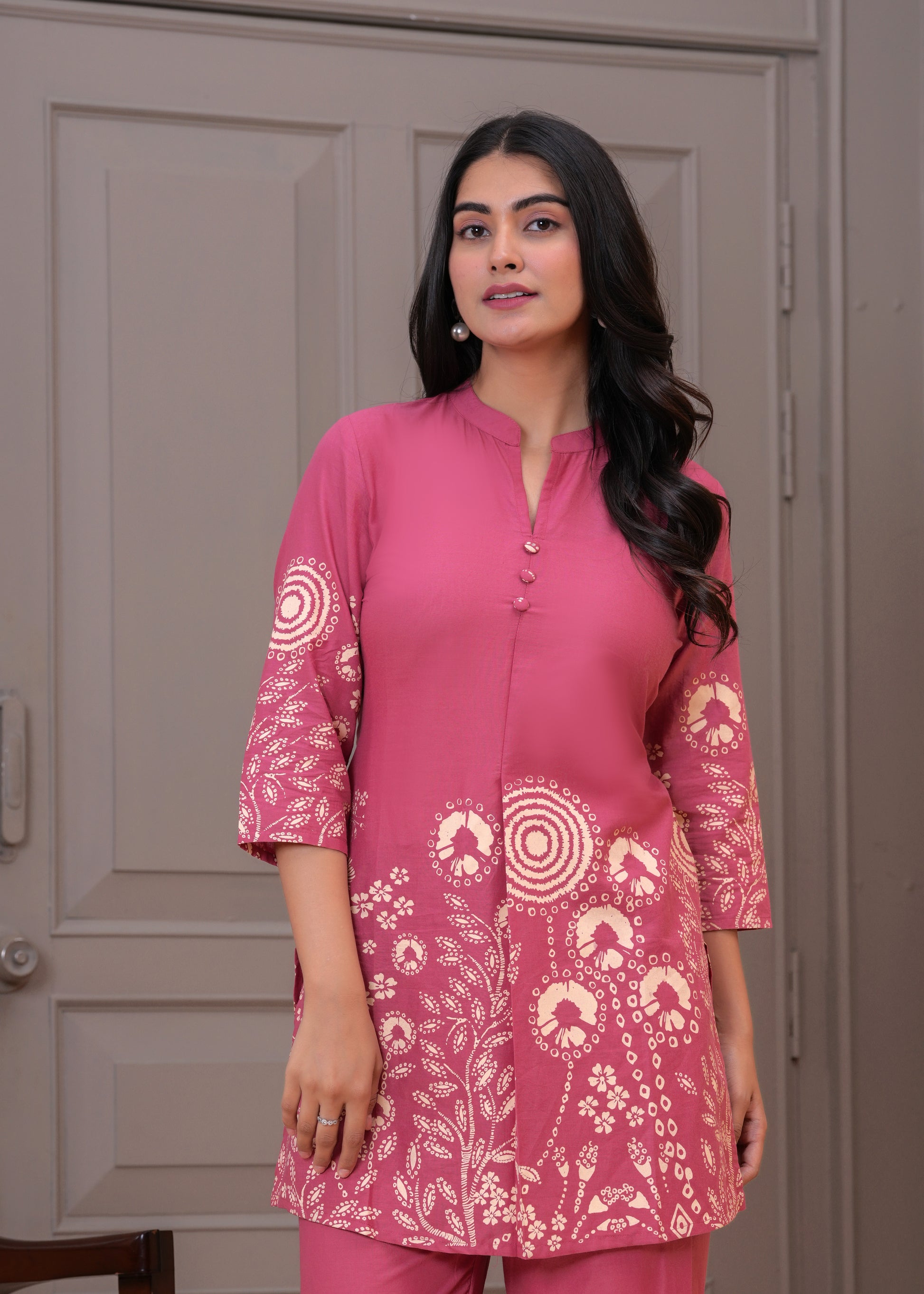 Add a pop of elegance and comfort to your everyday wardrobe with this stunning rose pink cord set. Crafted in soft, breathable cotton fabric, this co-ord features a short kurta with an eye-catching ethnic print in soothing beige tones. The kurta has a mandarin collar with a button placket and 3/4th sleeves, perfectly paired with matching straight-fit pants that carry the same intricate detailing for a coordinated look. This set blends traditional charm with a contemporary silhouett — perfect for casual outings, workwear, or relaxed festive gatherings.