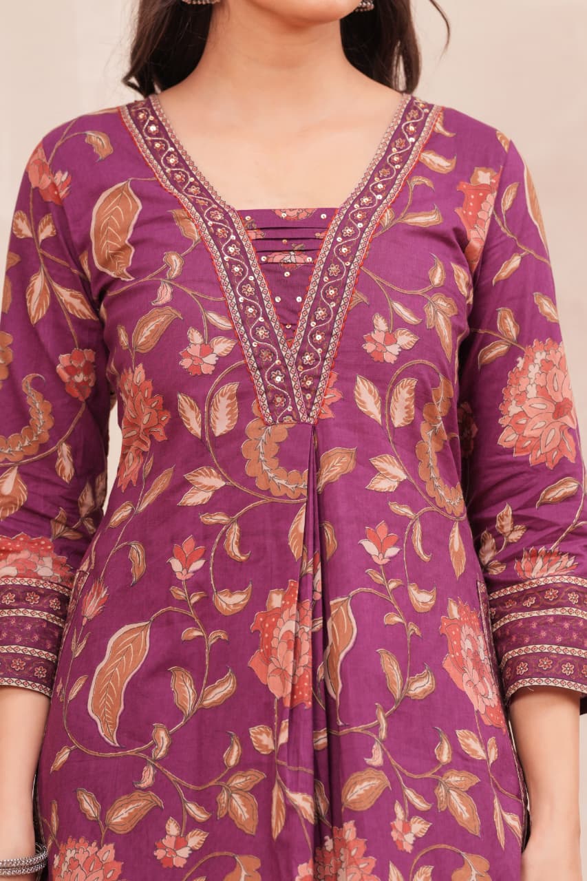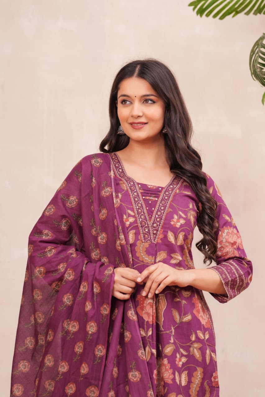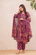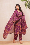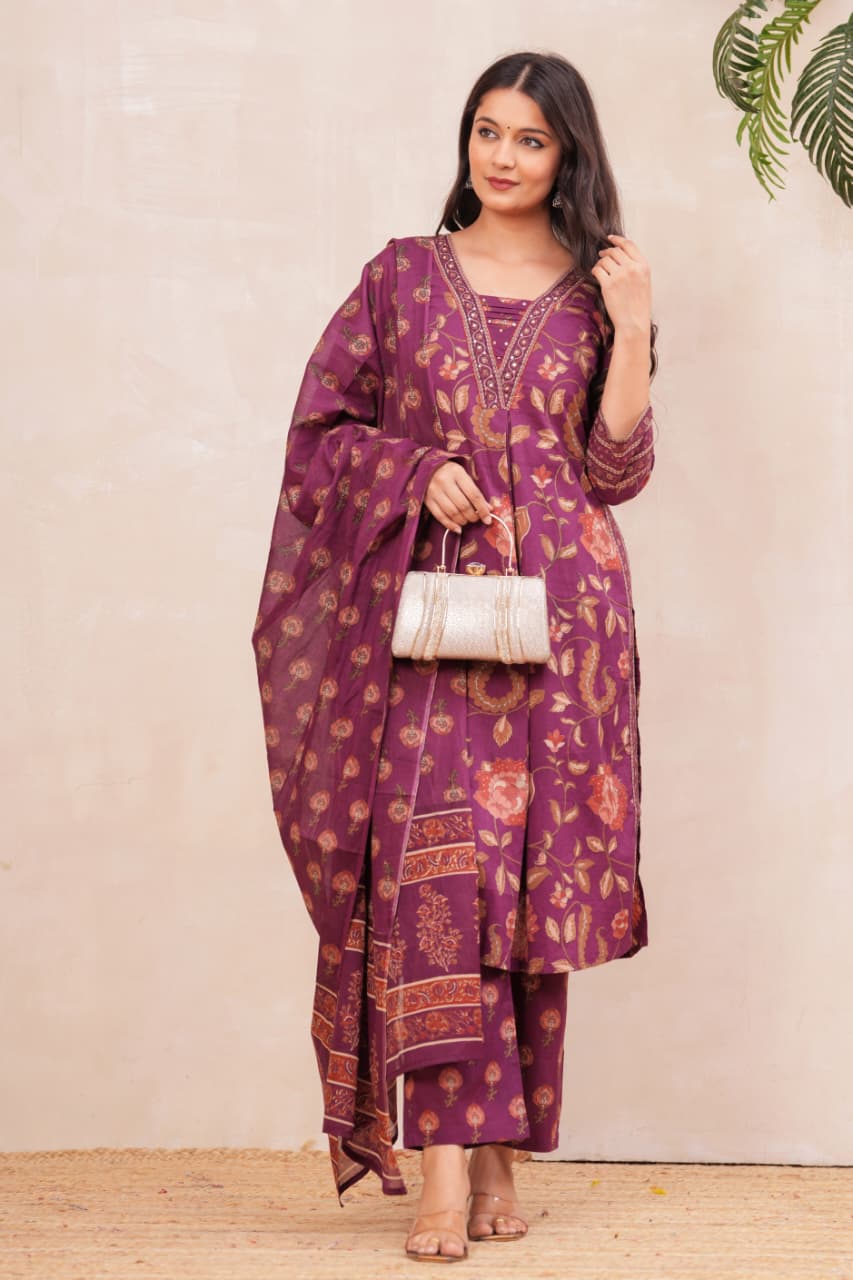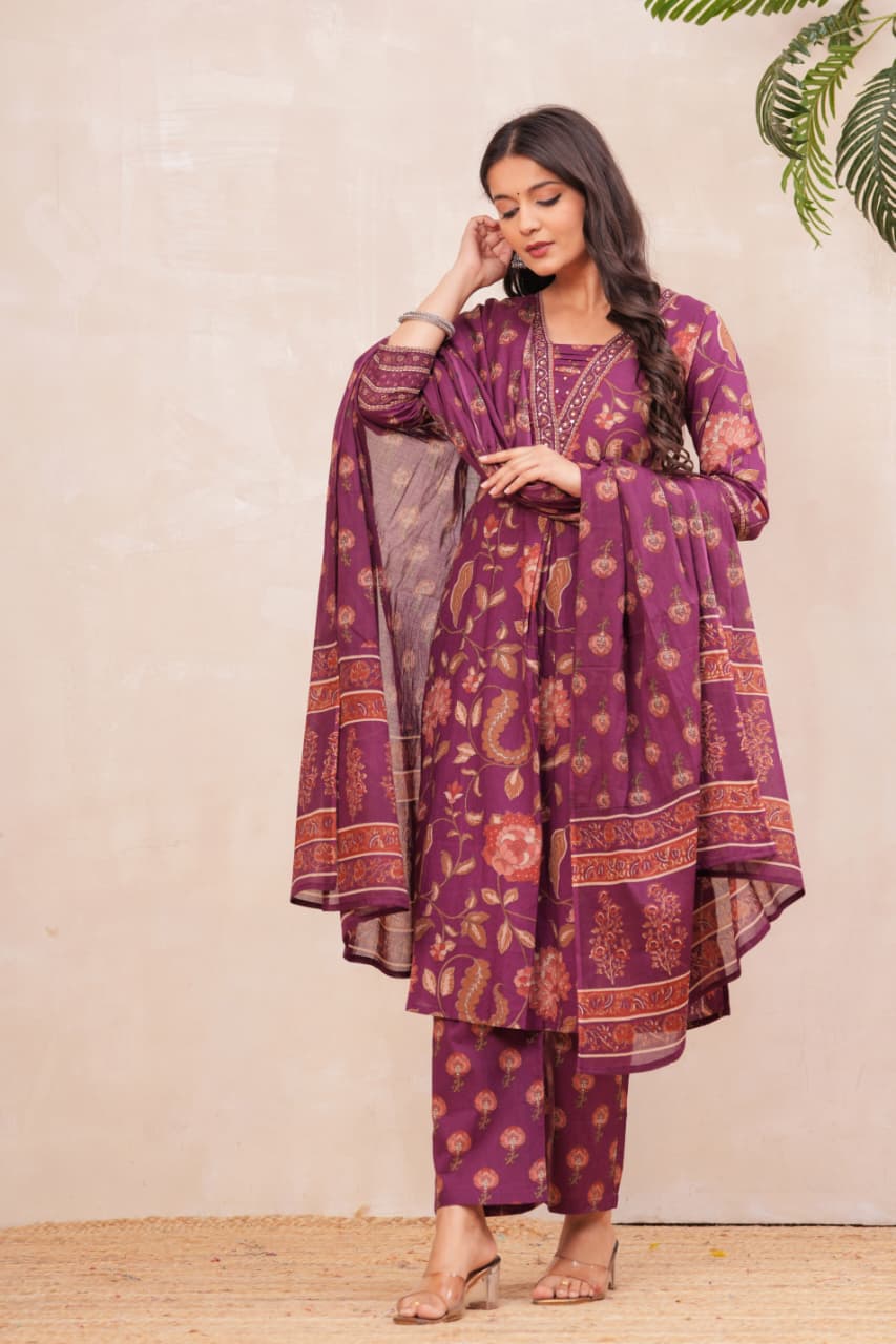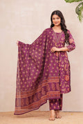 Radiate elegance in our Grape wine border Suit Set, crafted in rich grape wine with intricate floral block prints. The straight-fit kurta features vibrant handblock motifs highlighted with a detailed neckline, paired with coordinated pants for effortless grace. A soft dupatta adorned with dainty floral patterns and a statement border completes this timeless look. Perfect for festive gatherings, family occasions, or elegant daywear, this cotton suit set blends tradition with modern sophistication.