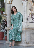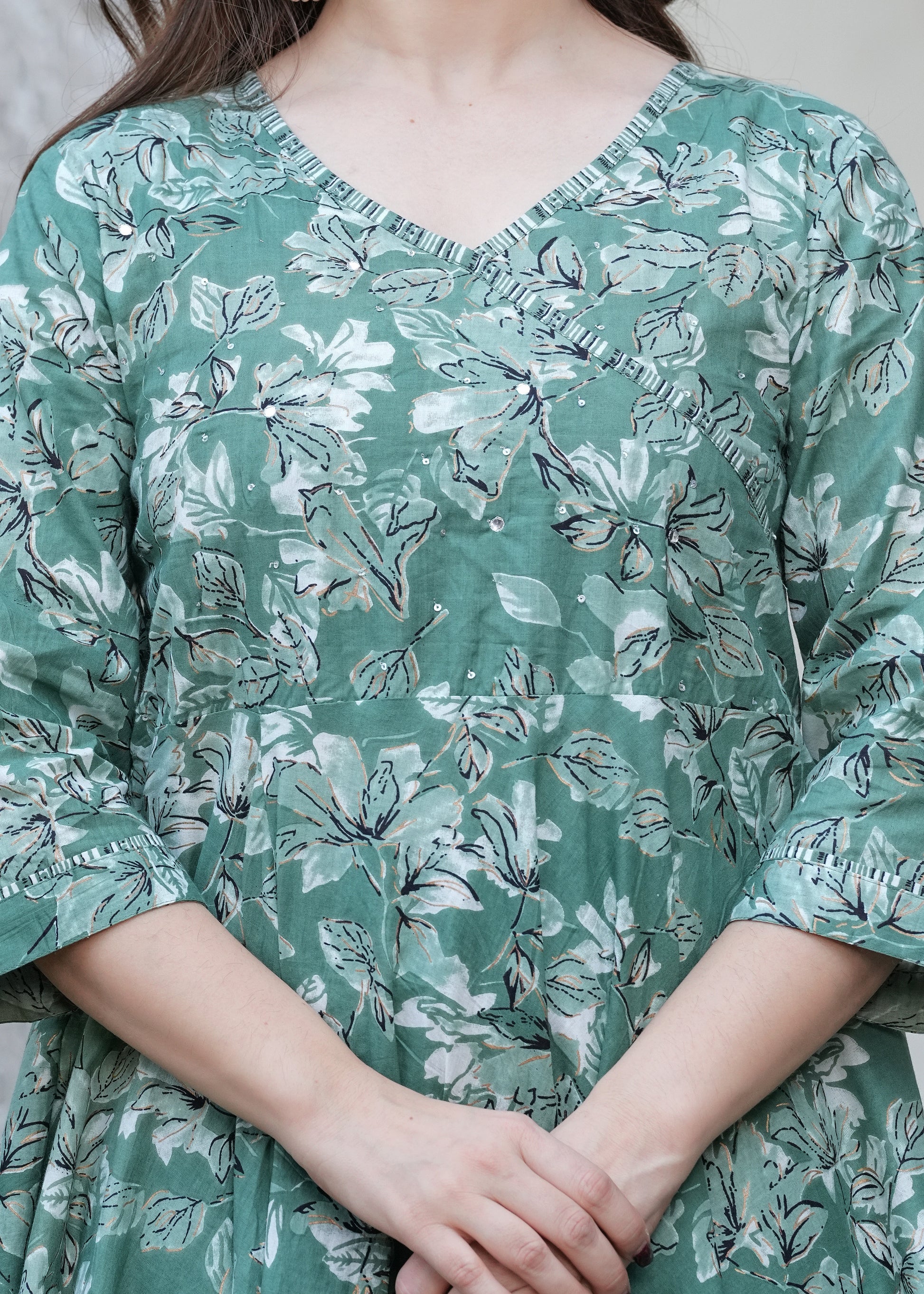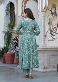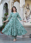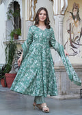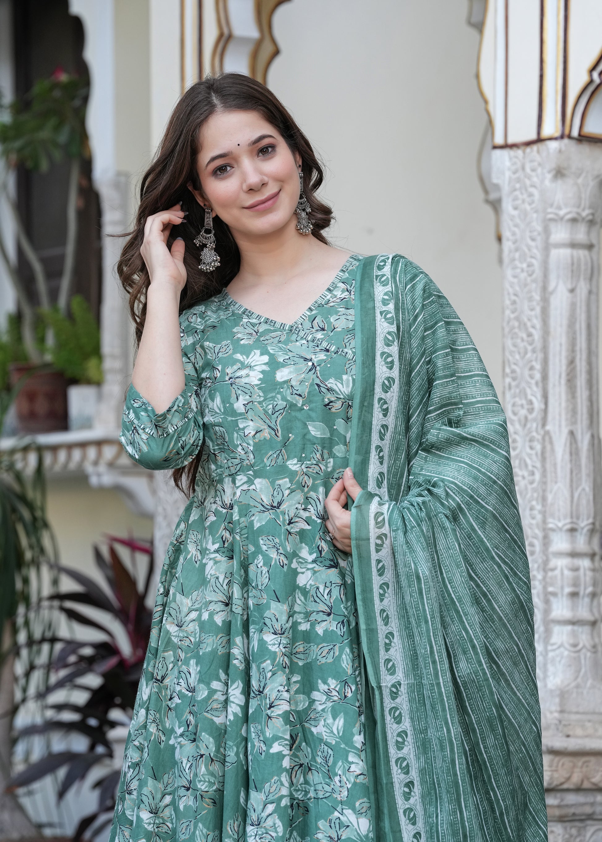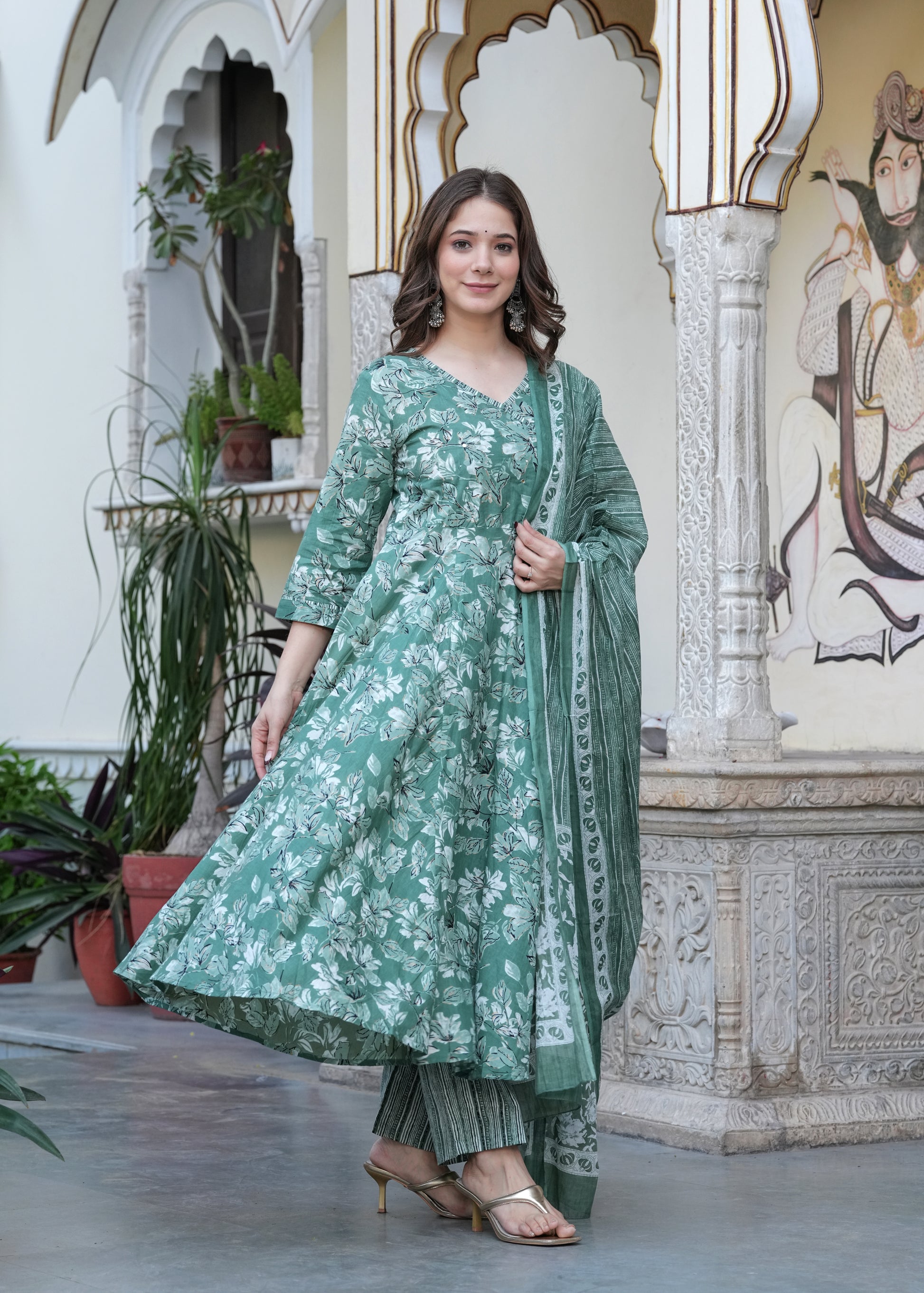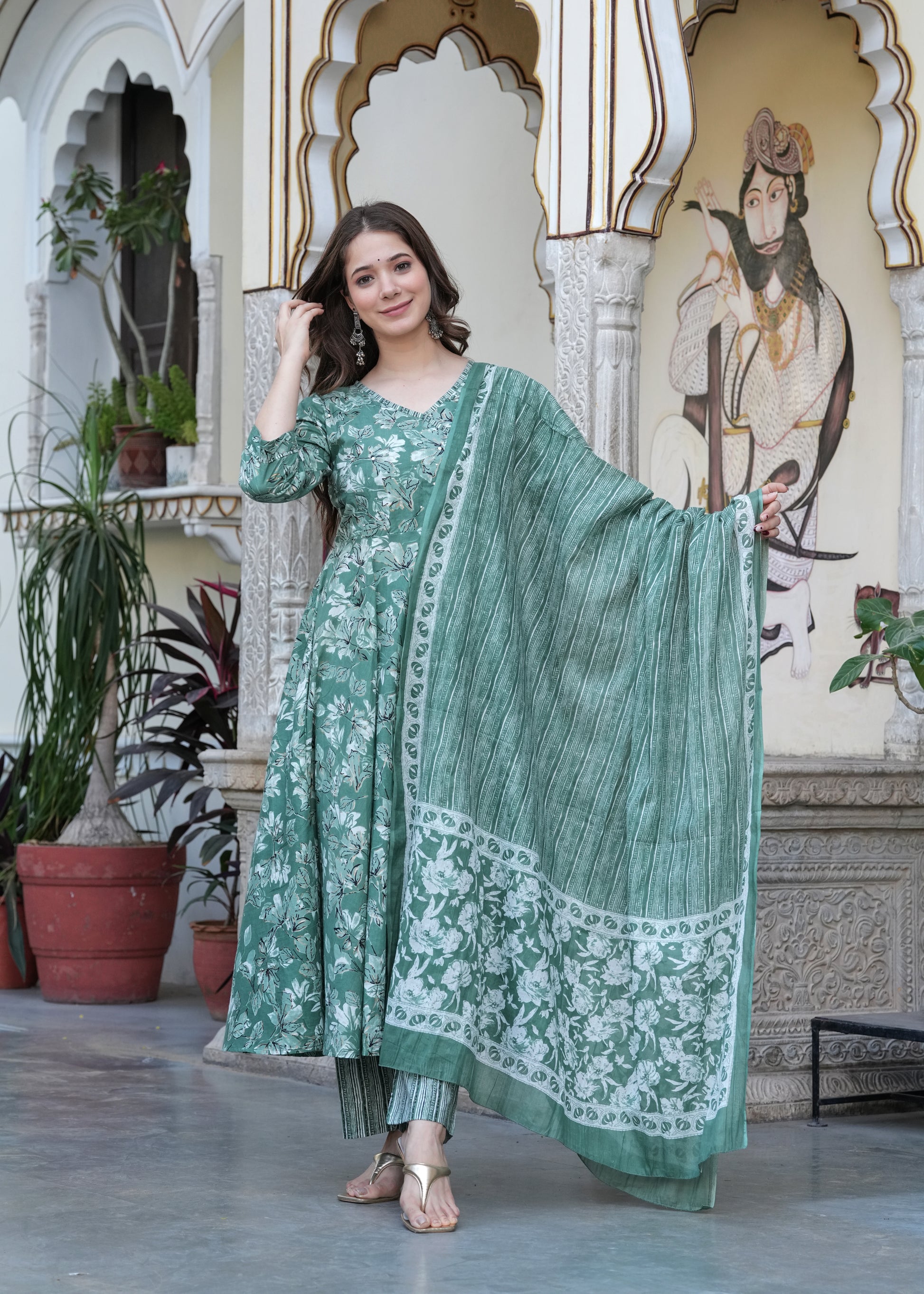 Embrace effortless elegance with this green Anarkali suit set, designed in a graceful green floral print over. The calf-length Anarkali kurta features a flattering flare and a V- neckline, adding a modern touch to this traditional silhouette. Paired with striped straight-fit pants and a lightweight printed dupatta with a matching floral and border design, this ensemble is perfect for a breezy ethnic look.Crafted in breathable cotton, this suit set is ideal for casual outings, festive gatherings, or day events where style meets comfort.
