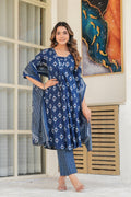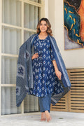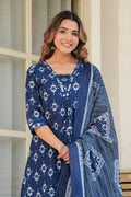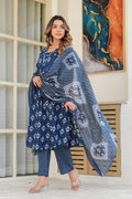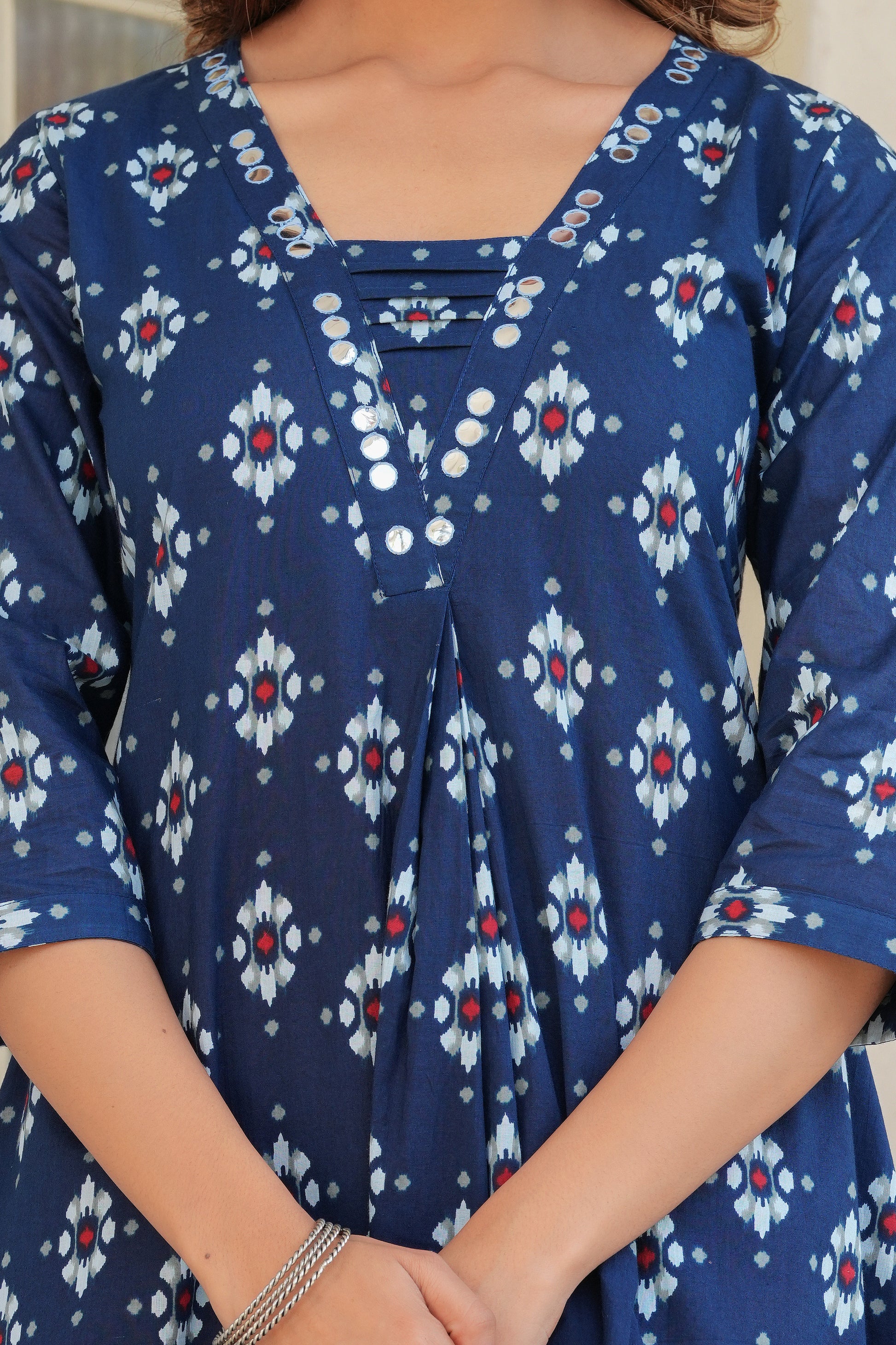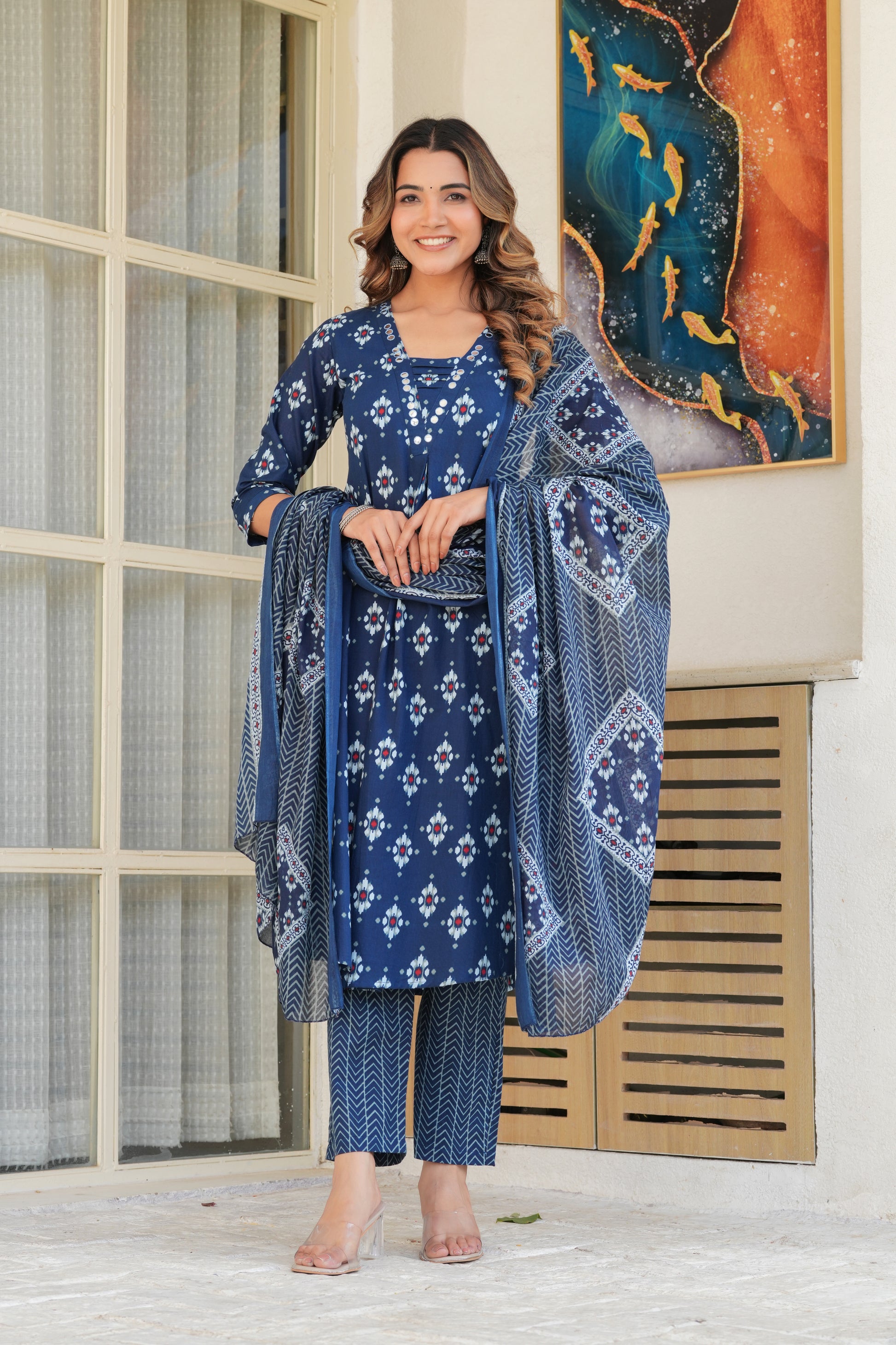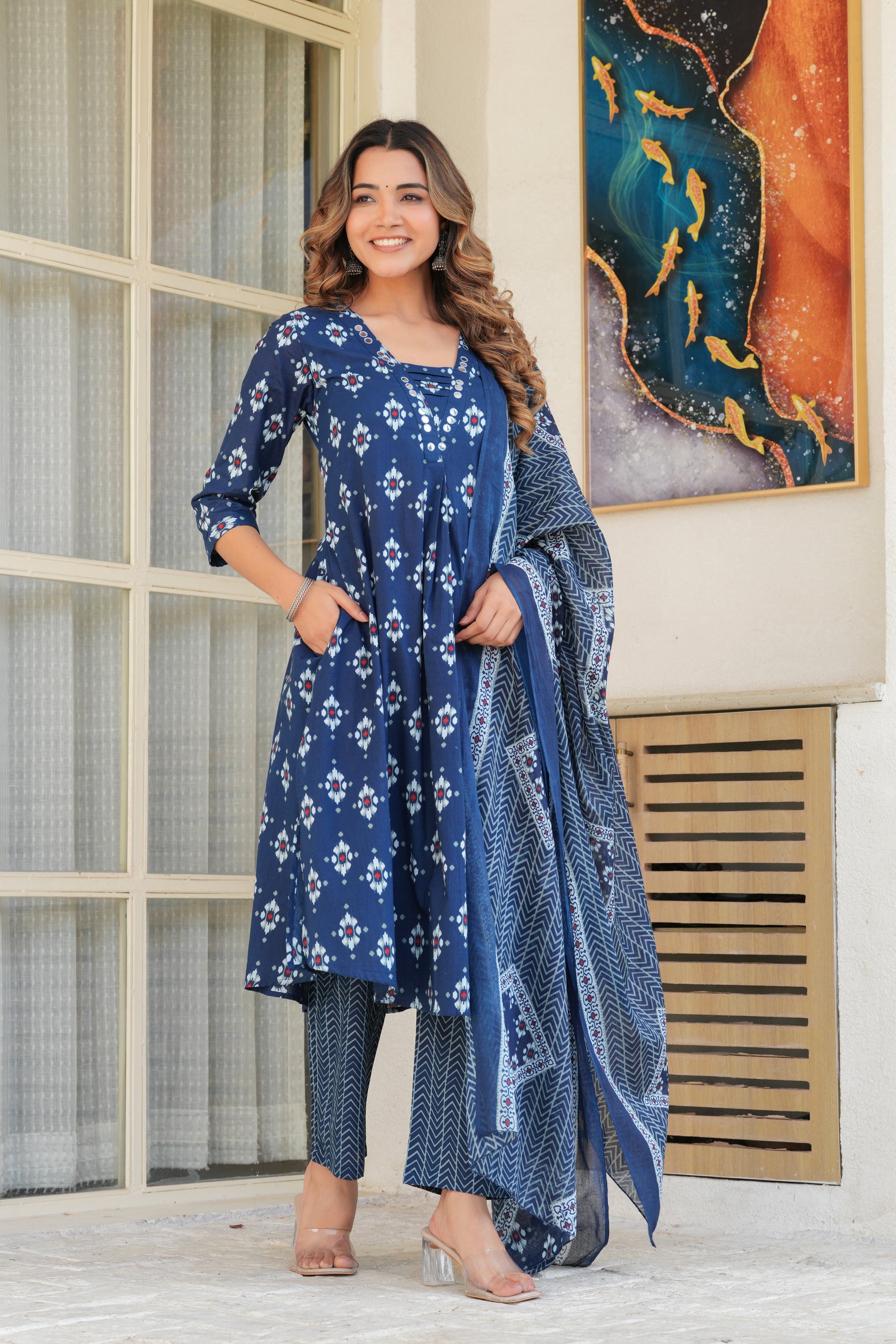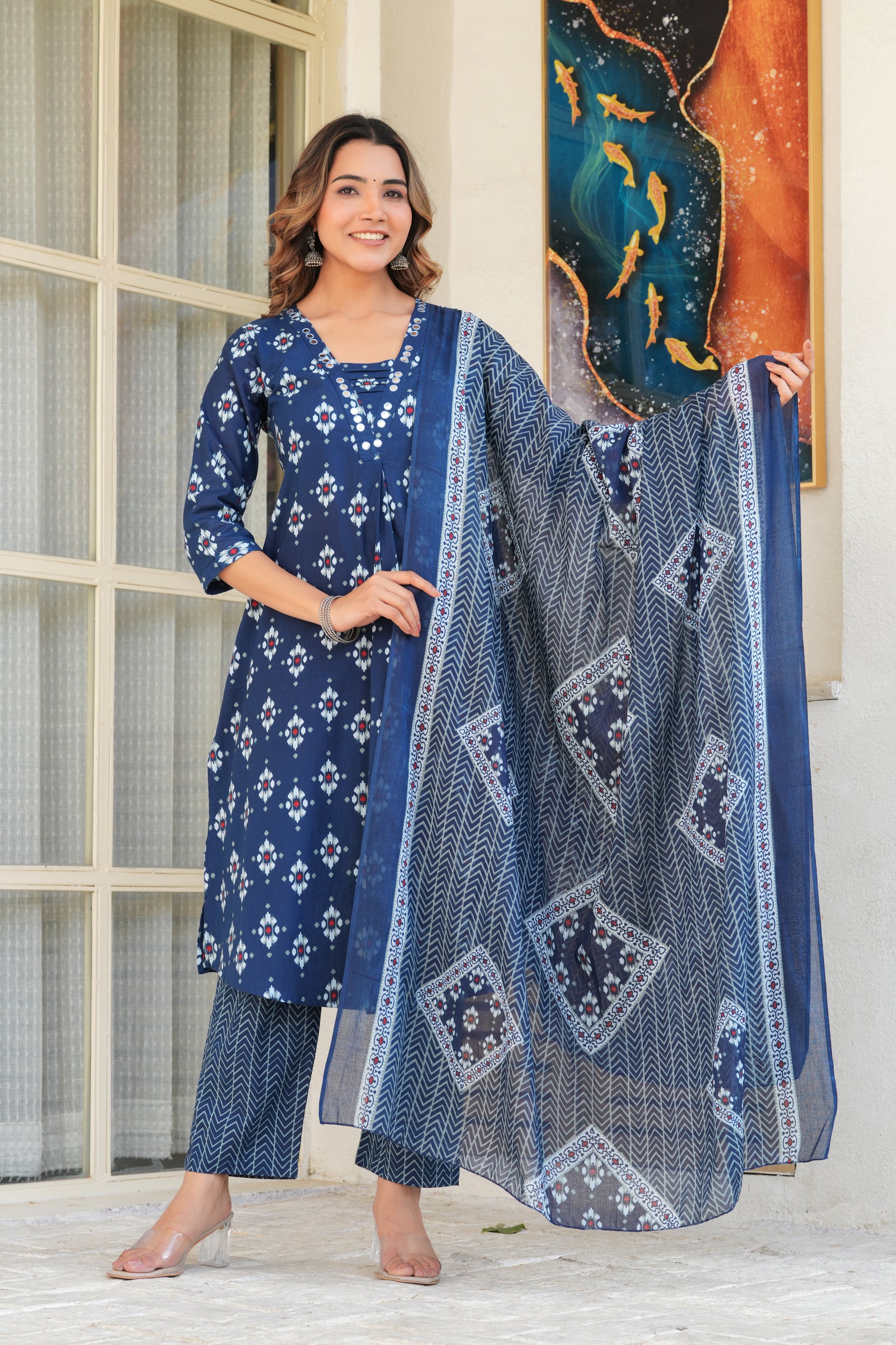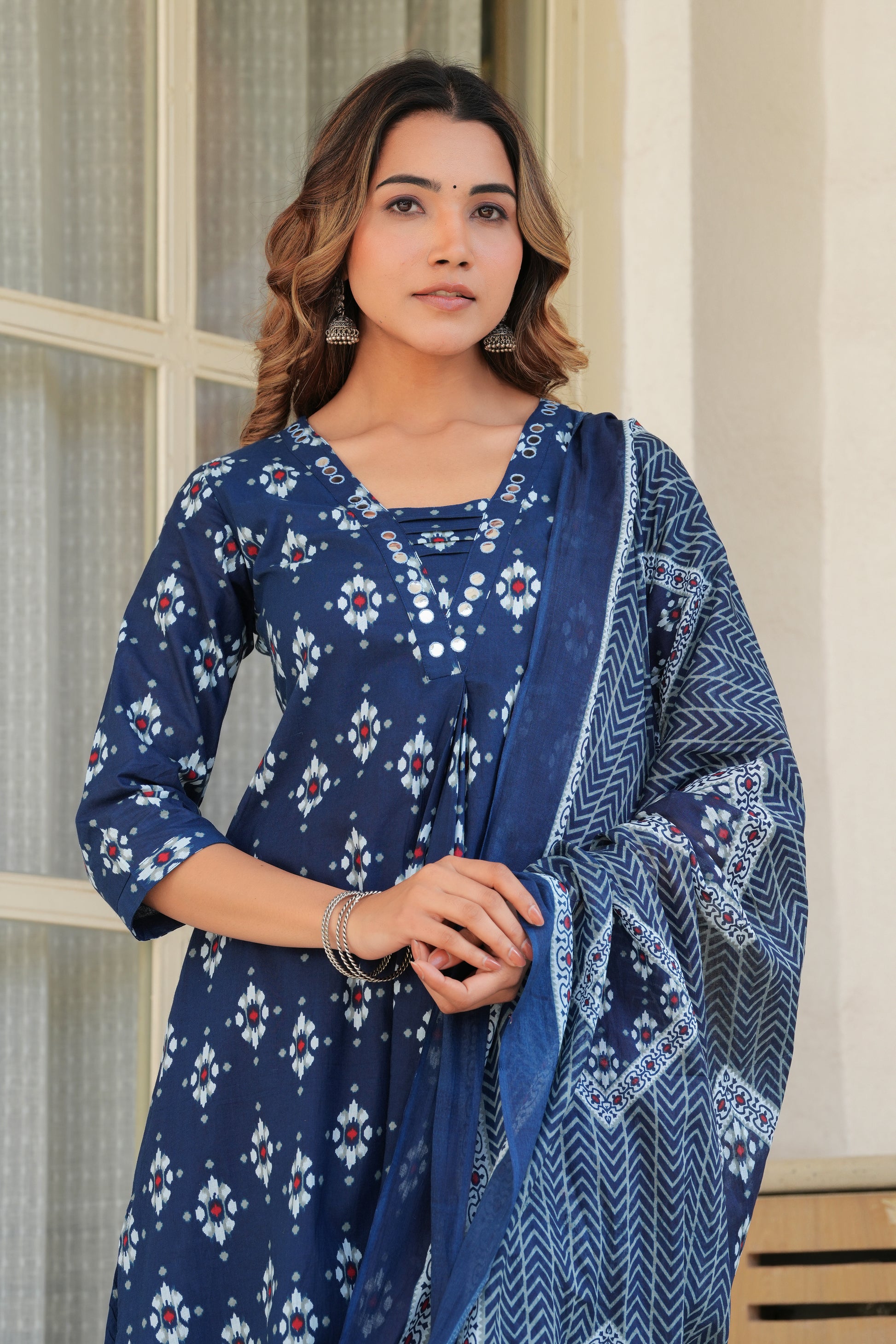 Step into timeless elegance with this indigo blue ikkat style printed suit set, perfect for everyday elegance and casual charm. The kurta features a flattering A-line silhouette with all-over ethnic motifs in white and red, enhanced by a unique neckline detail. Crafted in breathable cotton, the outfit is paired with chevron-printed straight pants and a complementing printed dupatta in coordinating tones, adding depth and contrast to the look. Ideal for daytime outings, work wear, or casual gatherings, this suit set is a must-have for effortless ethnic style.