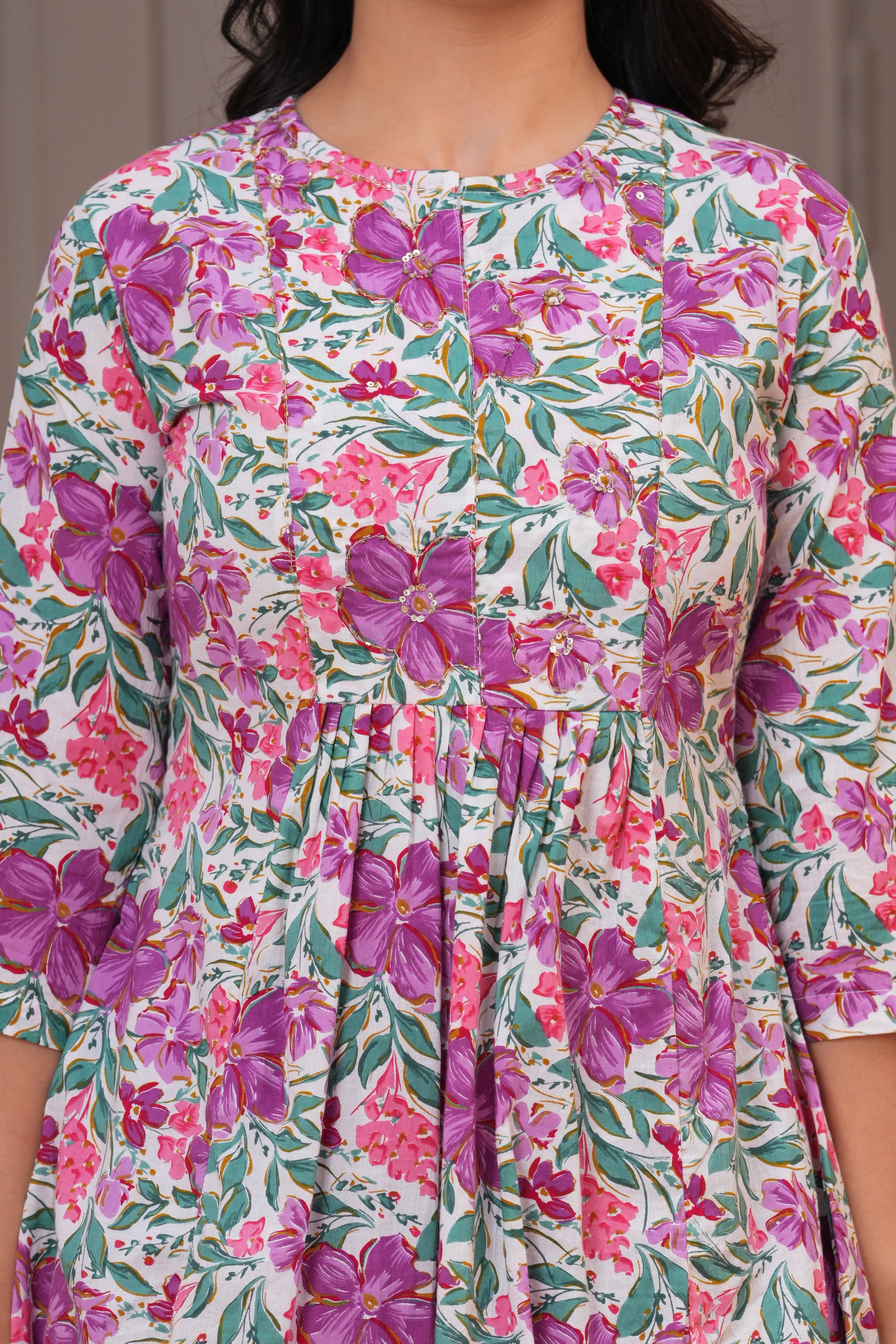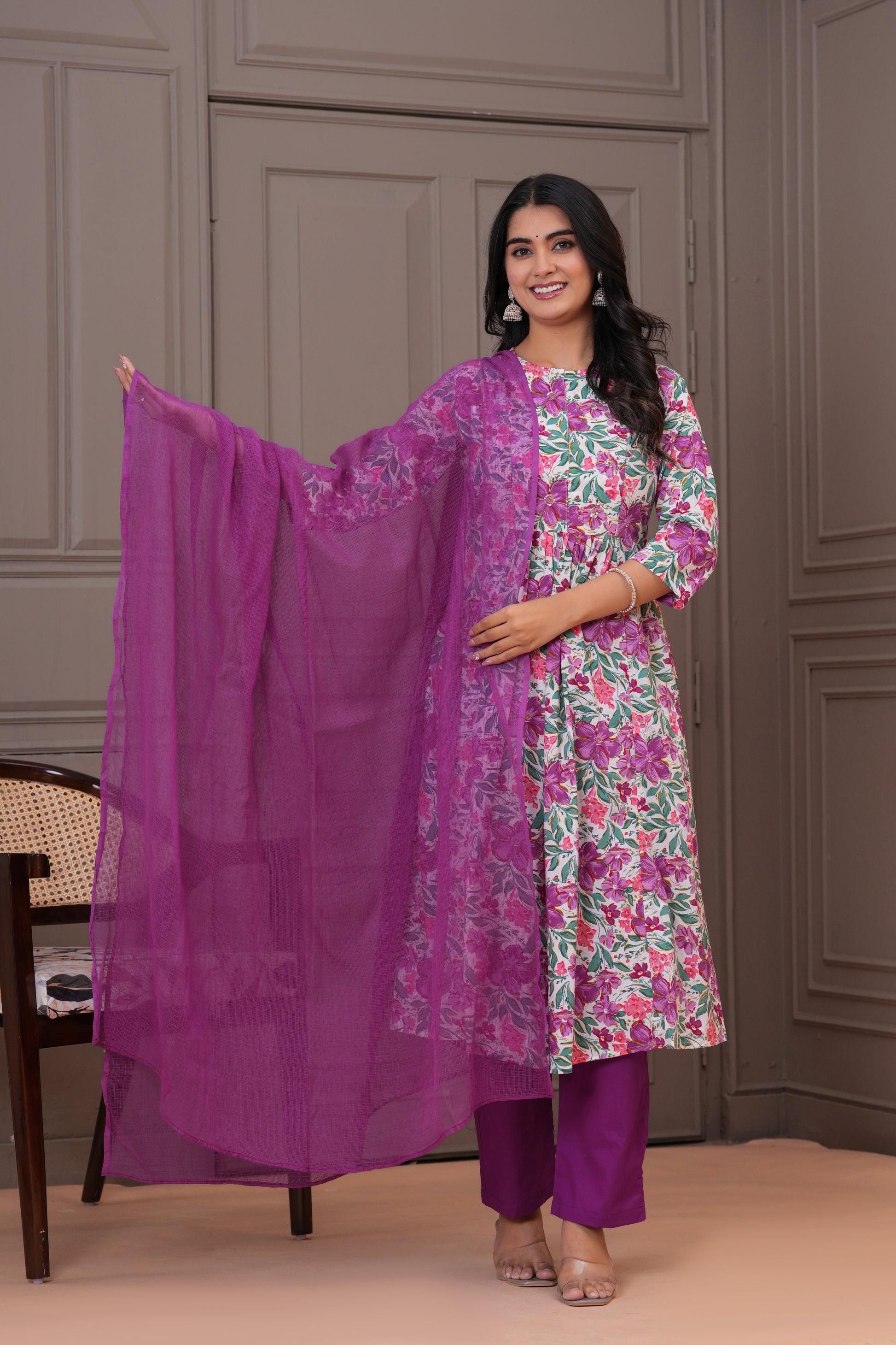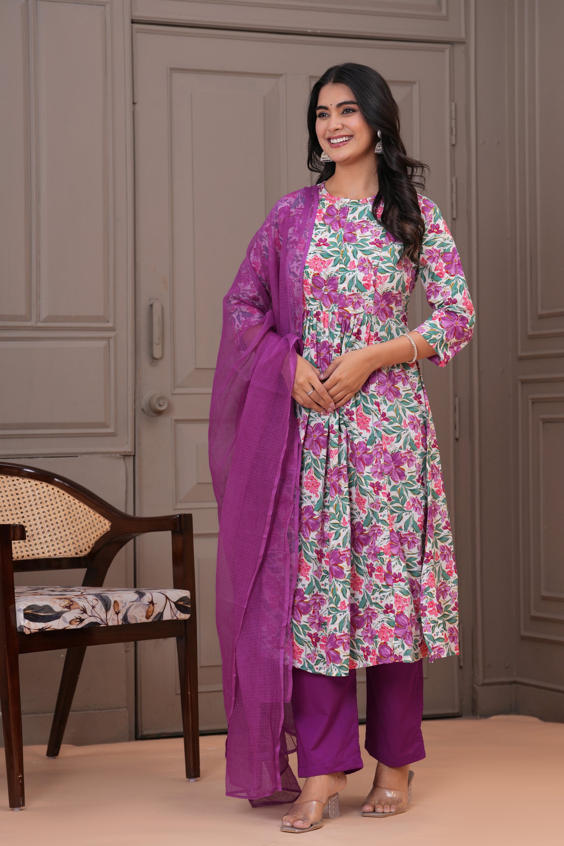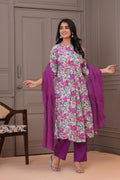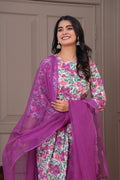 Step into a world of vibrant elegance with this stunning purple pleated suit set. Adorned with a lively floral print, the pleated kurta features a round neckline and 3/4th sleeves, offering both flair and comfort. It is paired with slolid pants that bring out the beauty of the kurta's pattern, and a solid cotton kota doria dupatta that adds a graceful, flowy finish. Perfect for festive outings, casual celebrations, or a statement everyday look.