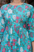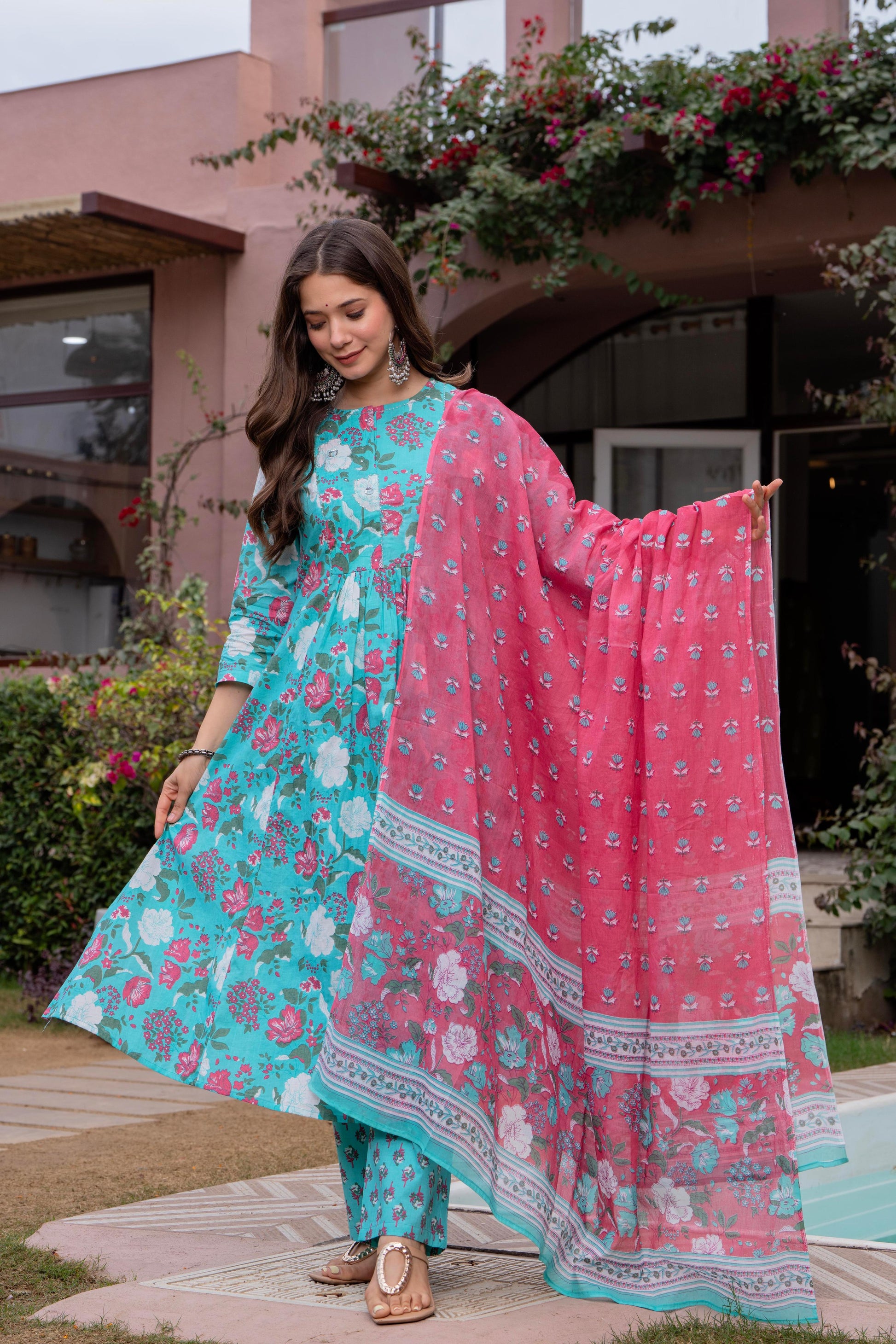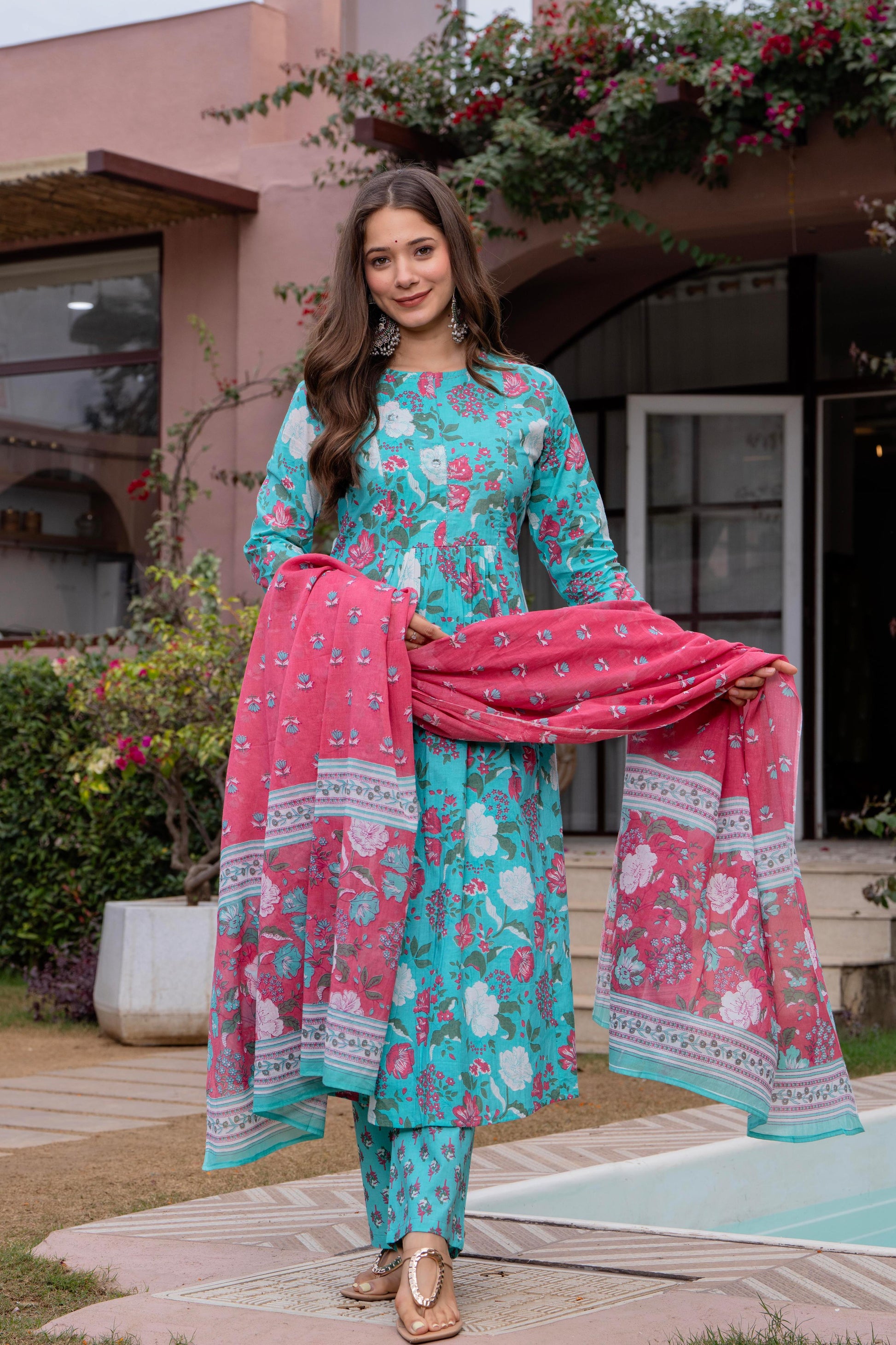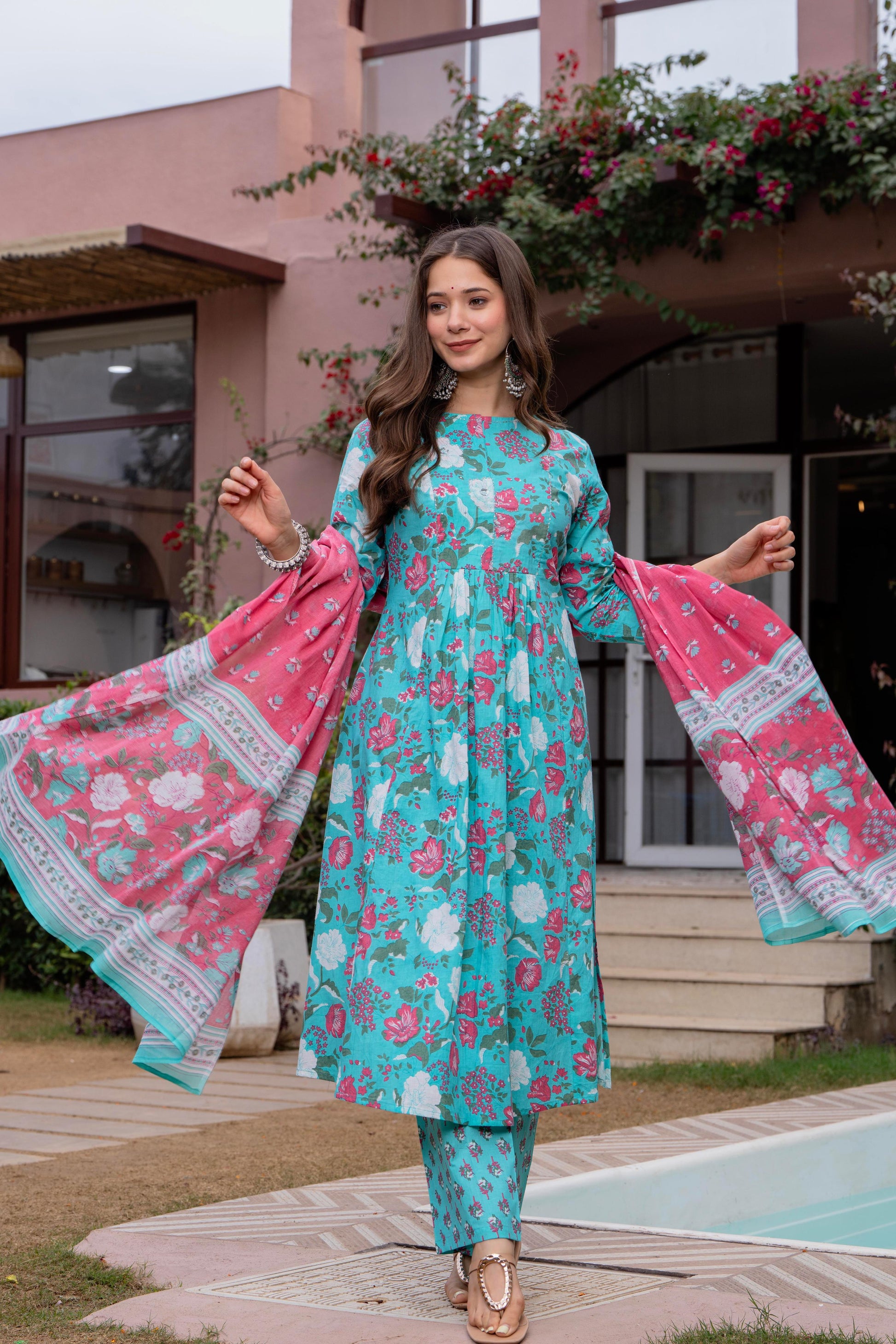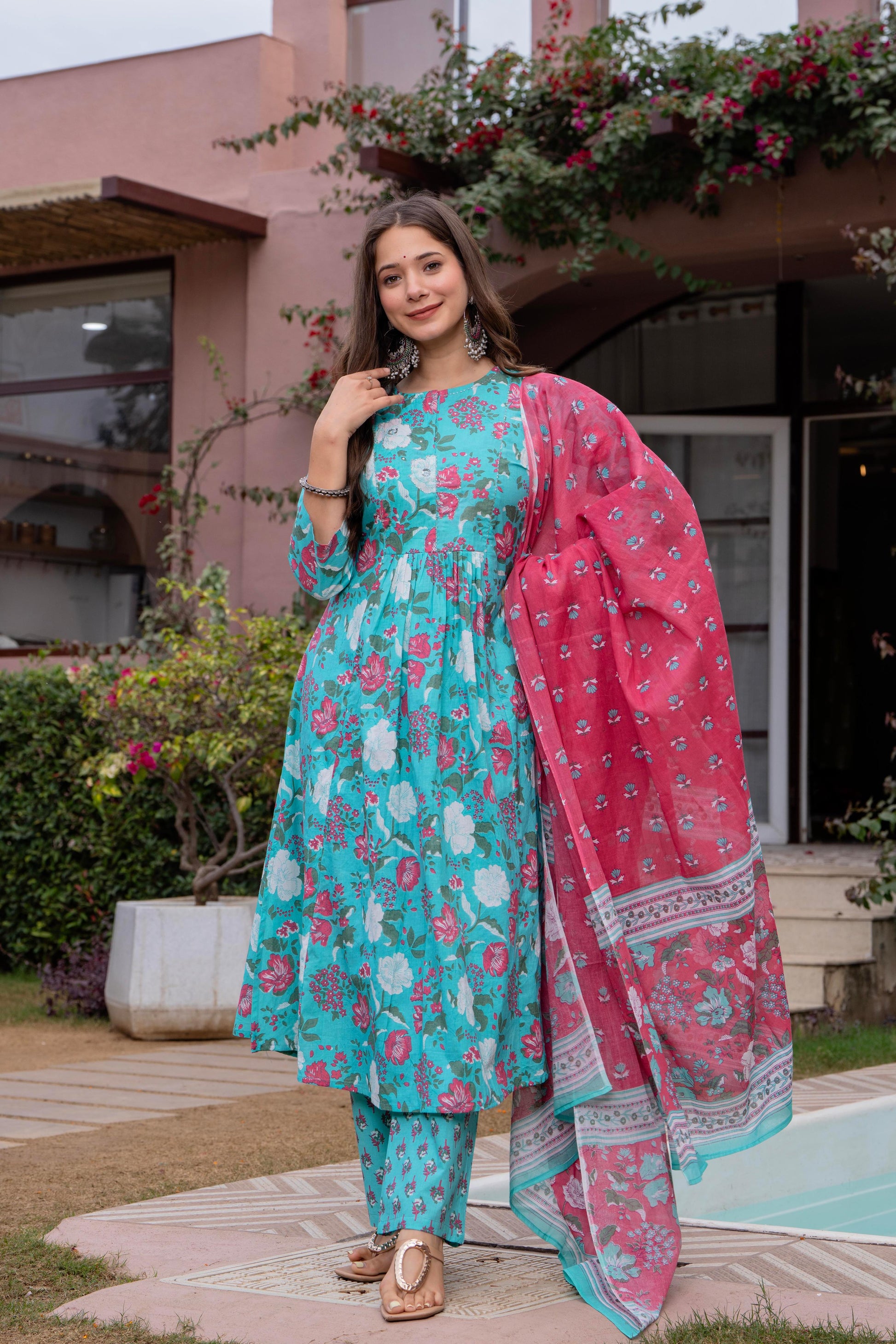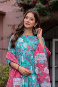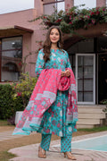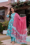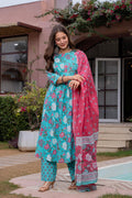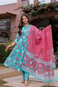 Radiate elegance in our Light Blue Pink floral A line cotton suit set of 3. This exquisite suit set is Crafted with breathable cotton features a blue floral round neck kurta with Beautiful hand embroidery given on yoke, blue pant with small soothing print, a pink dupatta which gives a unique style to your look. A perfect outfit for your casual outing or for any special ocassion
