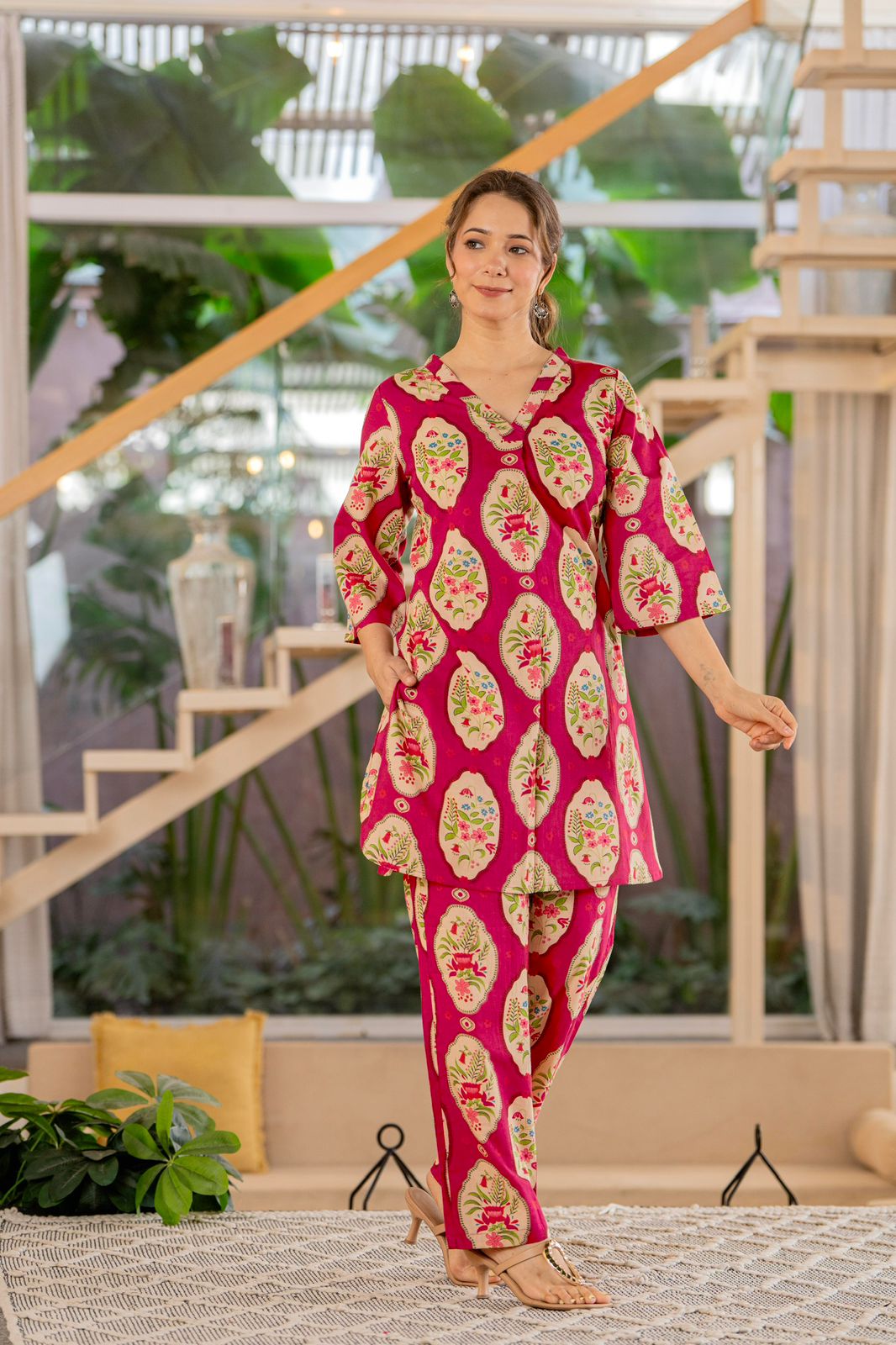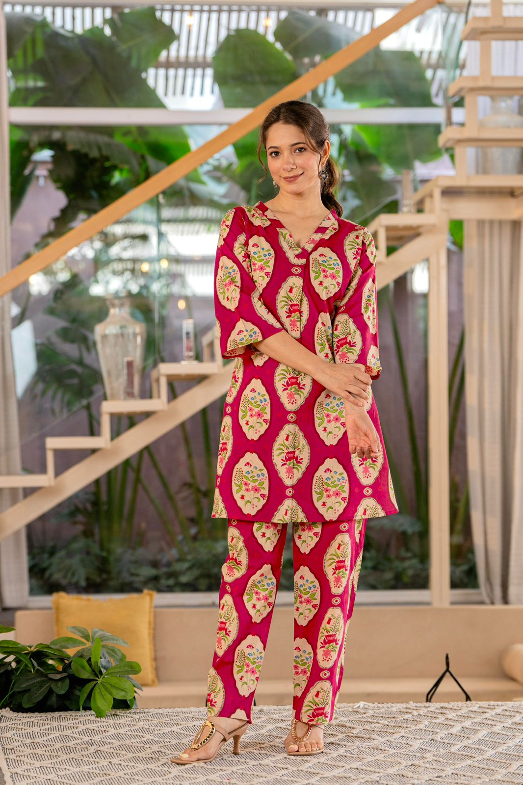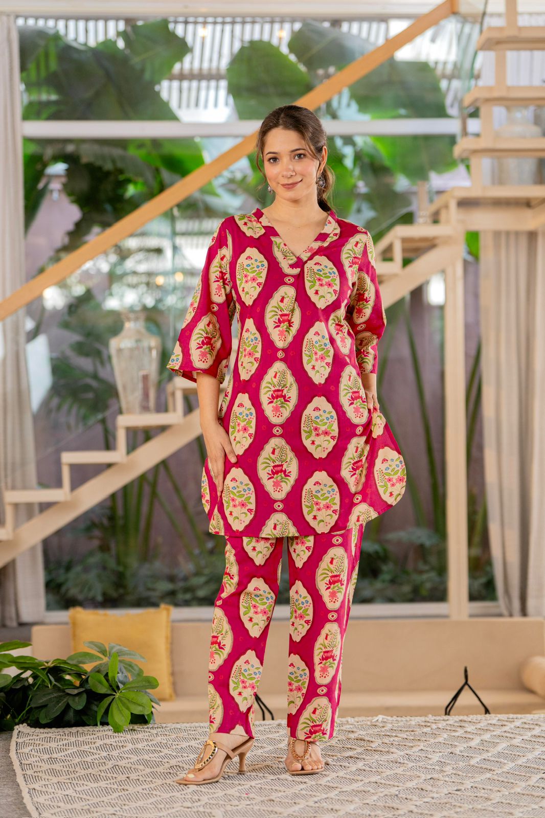 Step into effortless elegance with this vibrant handcrafted cord set, designed for women who love style with comfort. Featuring a striking magenta base adorned with delicate floral motifs, this co-ord set includes a relaxed-fit kurta with a V-neckline and 3/4th sleeves, paired with straight-fit pants for a flattering silhouette. The soft breathable fabric ensures all-day comfort, while the functional pockets add convenience without compromising style.