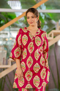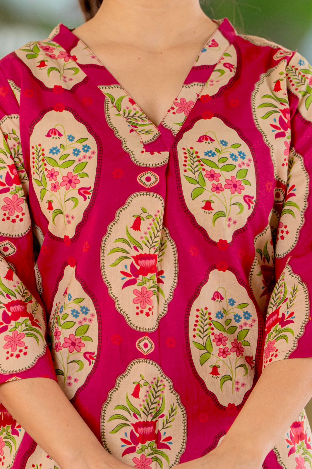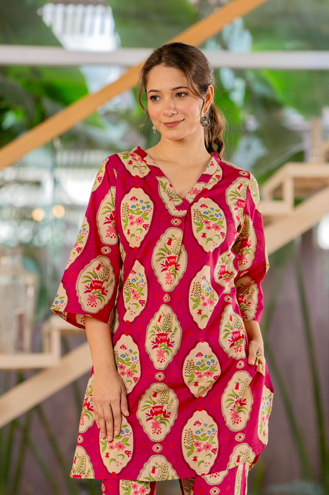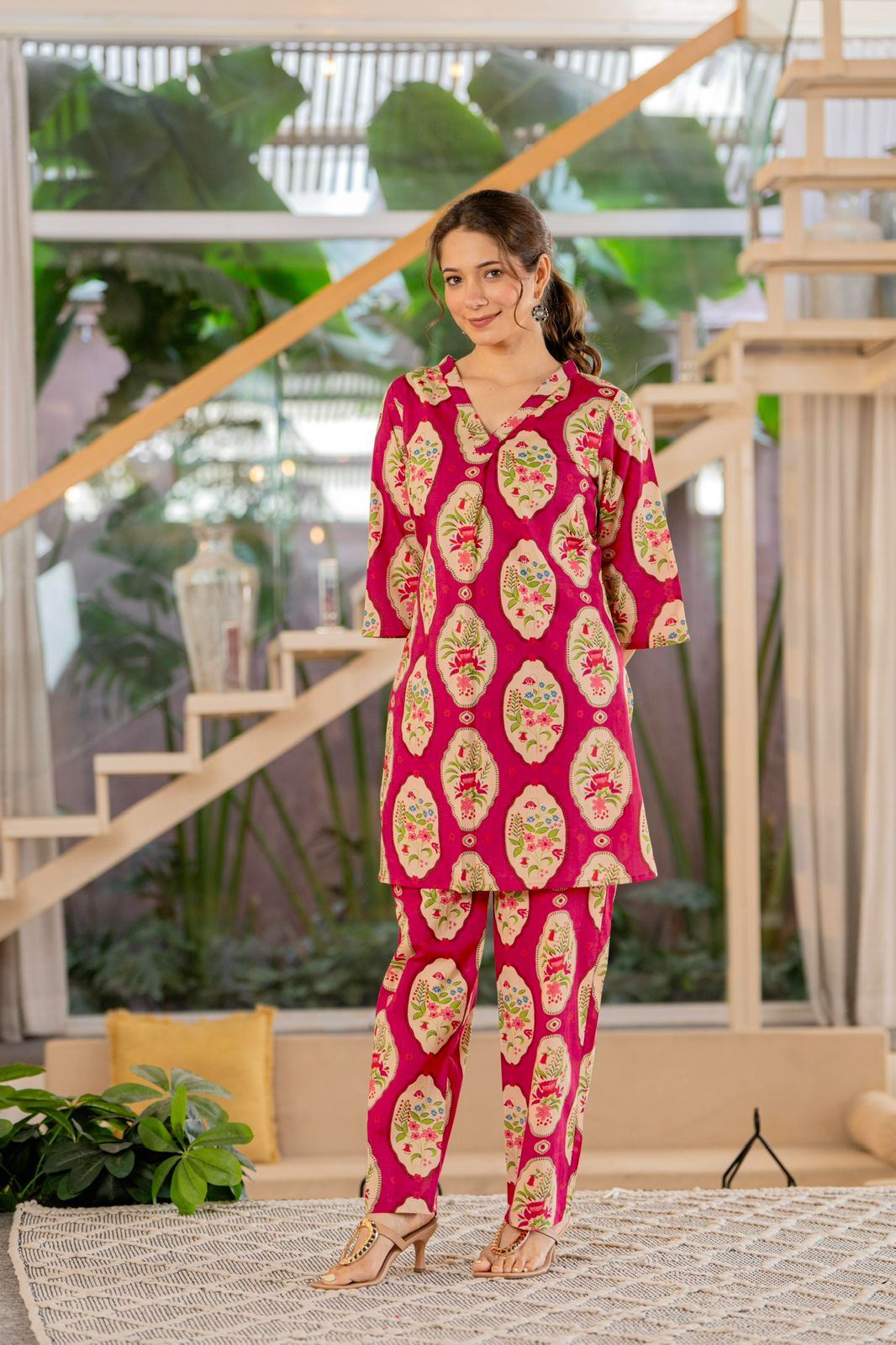 Step into effortless elegance with this vibrant handcrafted cord set, designed for women who love style with comfort. Featuring a striking magenta base adorned with delicate floral motifs, this co-ord set includes a relaxed-fit kurta with a V-neckline and 3/4th sleeves, paired with straight-fit pants for a flattering silhouette. The soft breathable fabric ensures all-day comfort, while the functional pockets add convenience without compromising style.