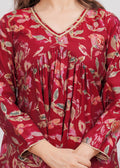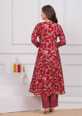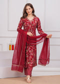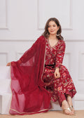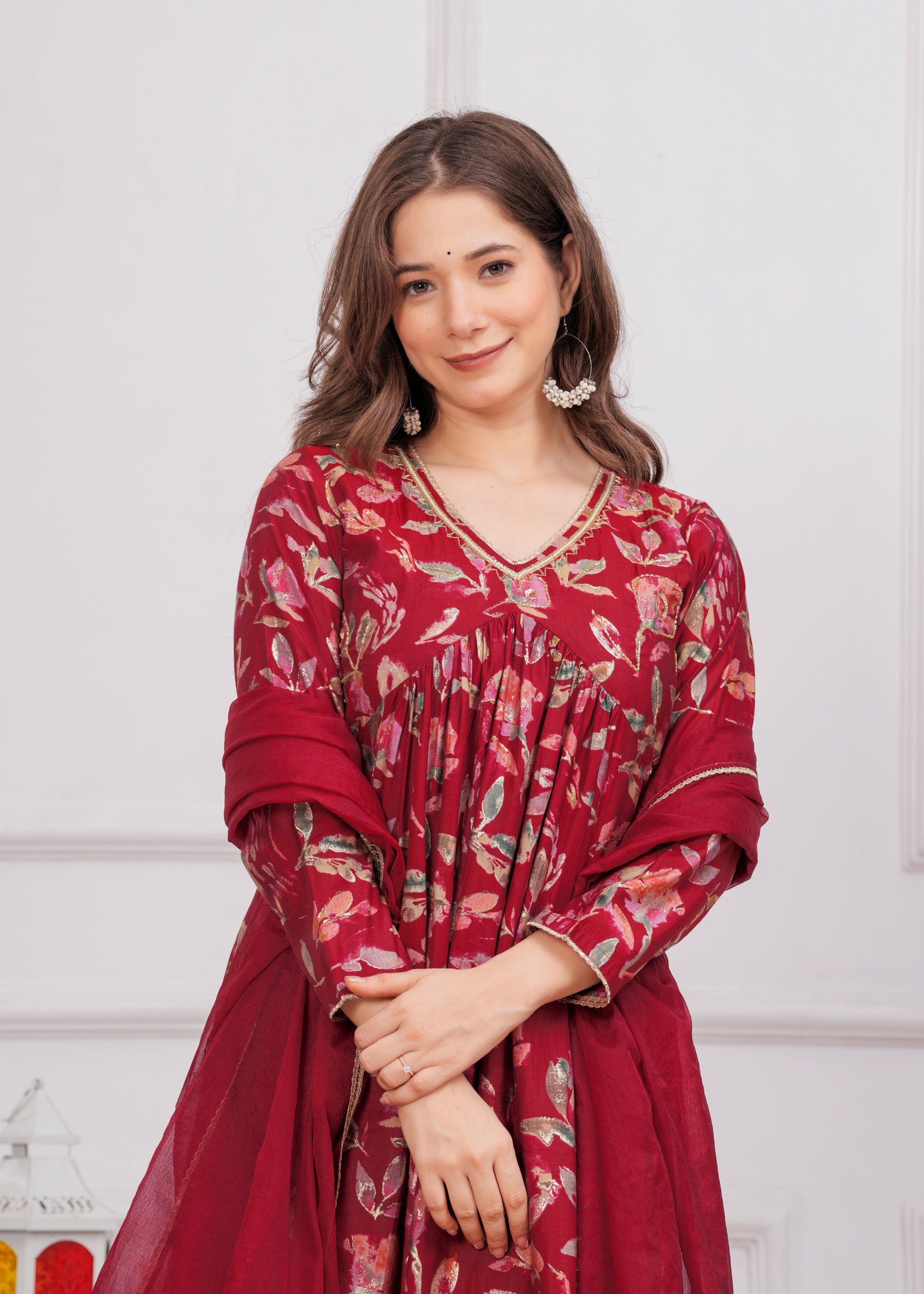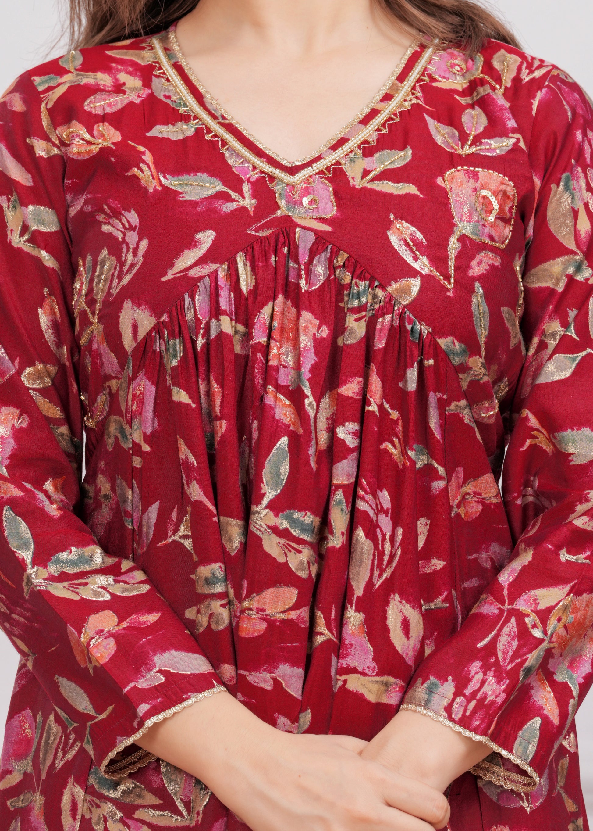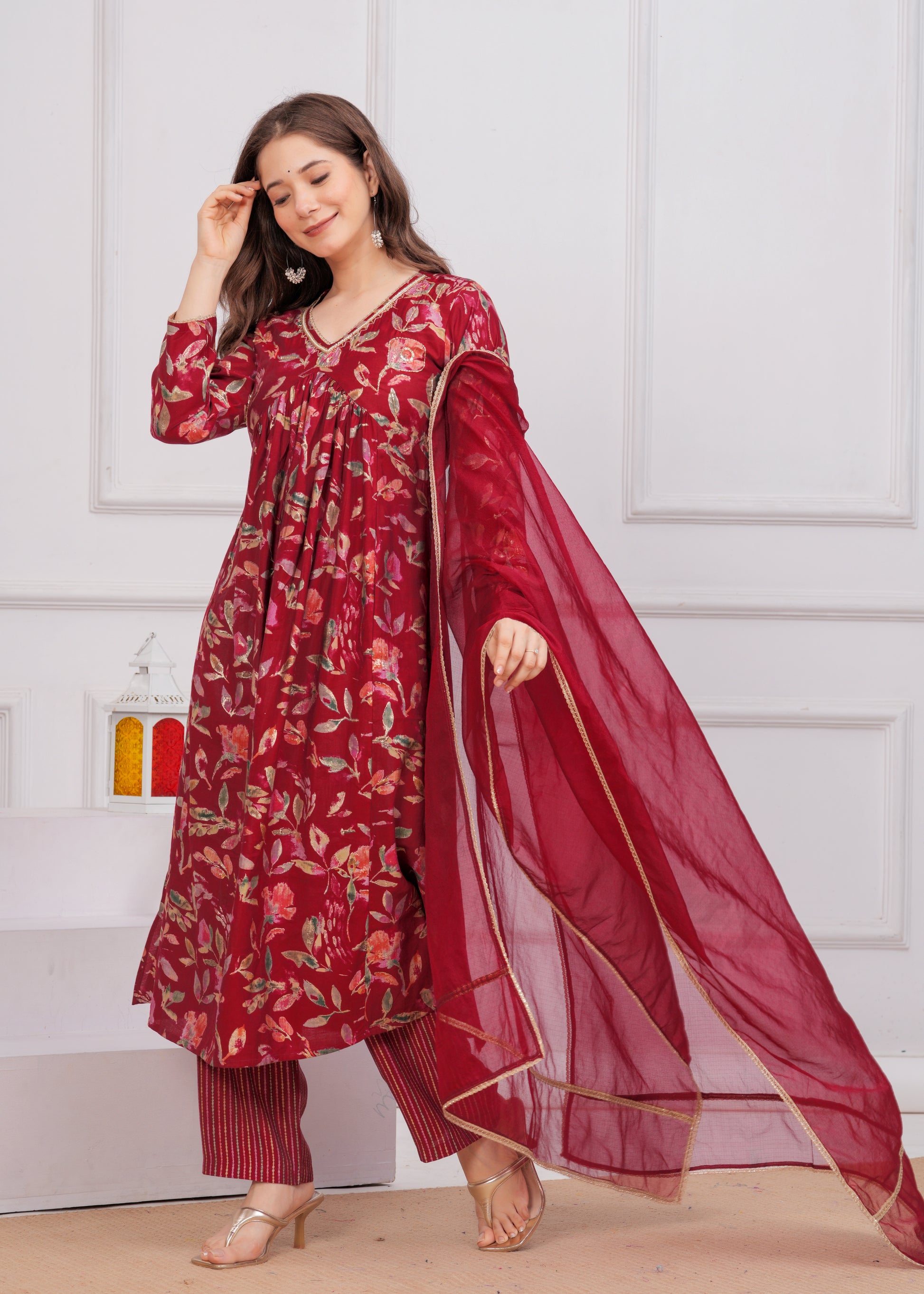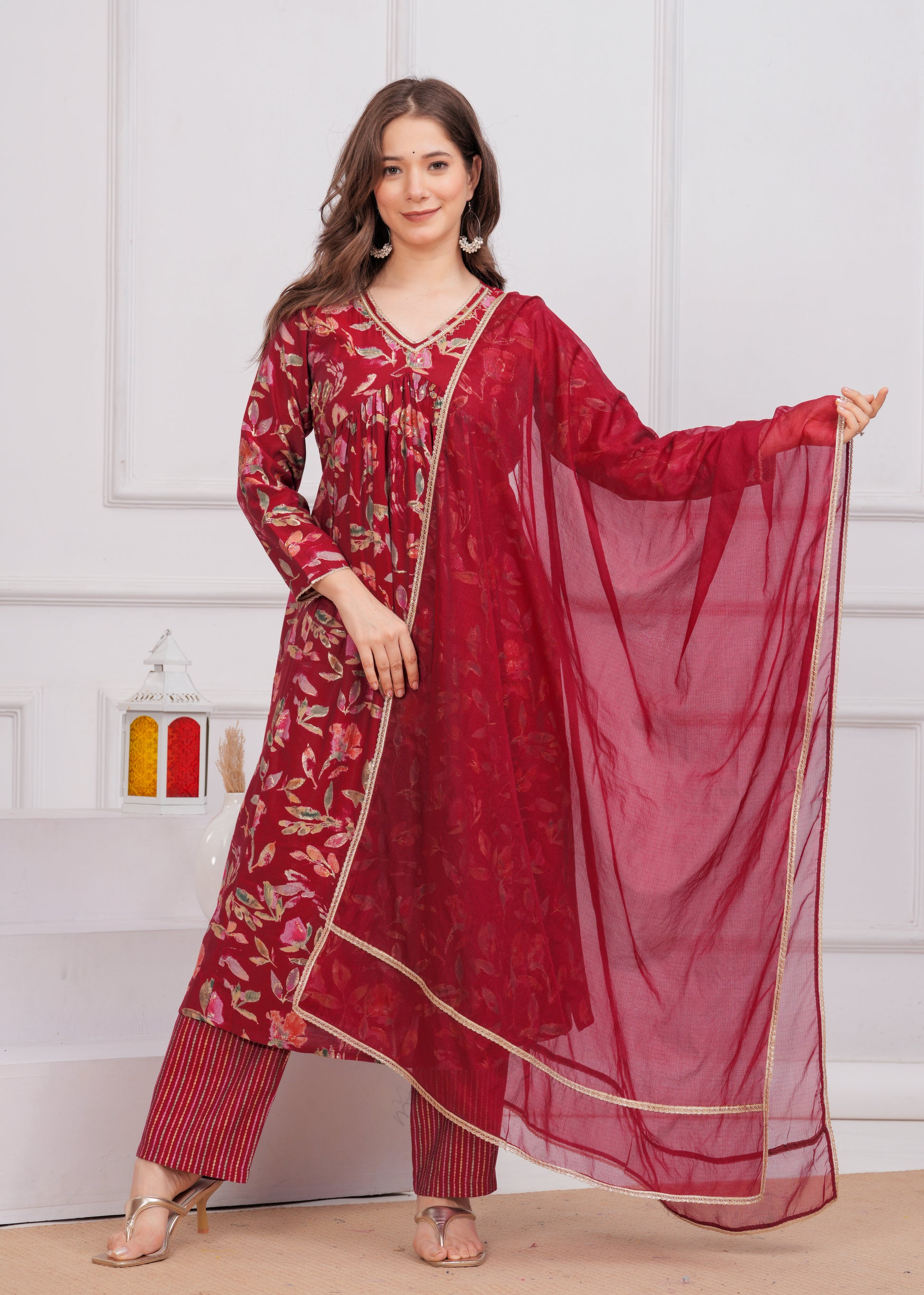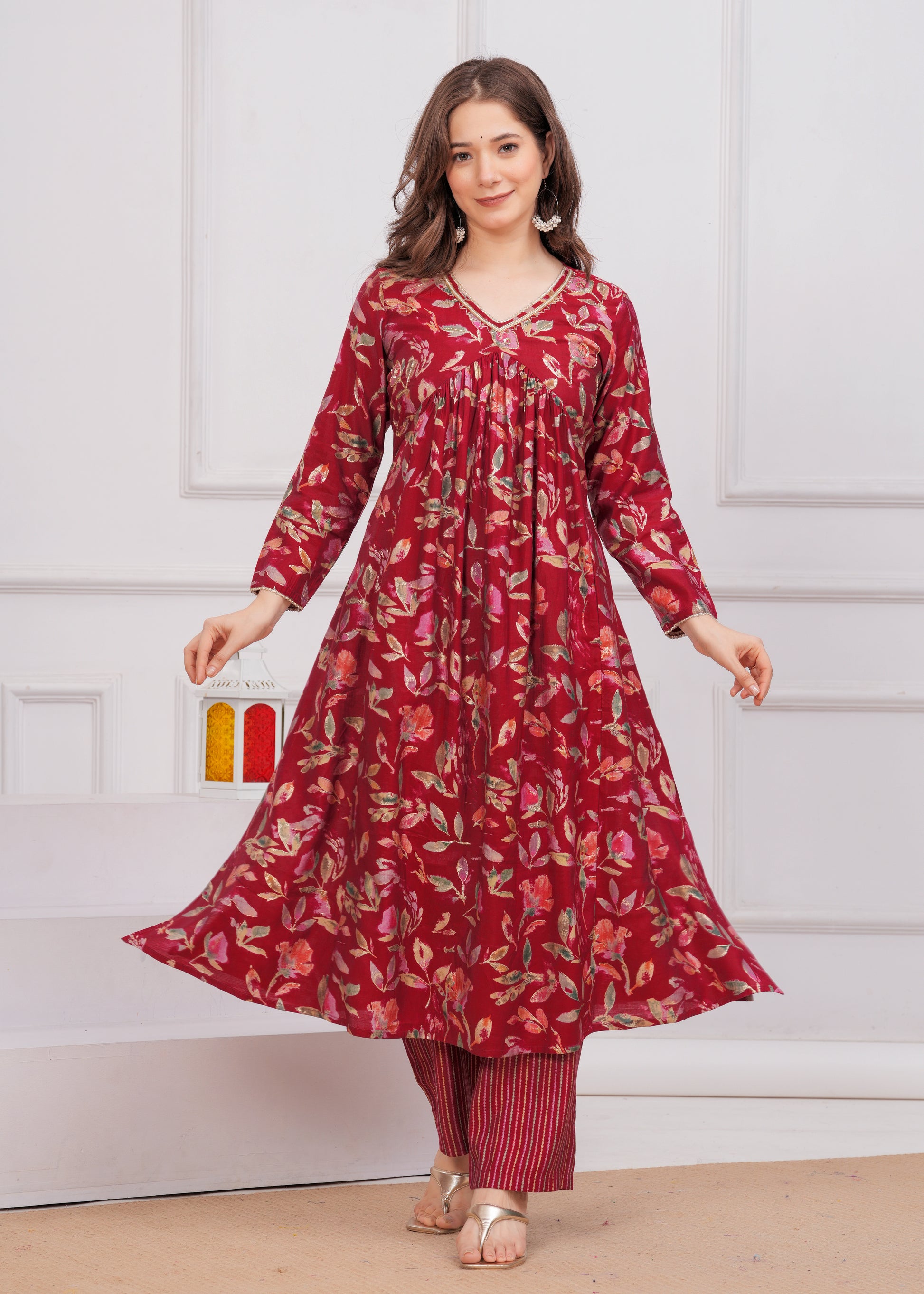 MAROON FLORAL ALIA CUT SLIK SUIT SET