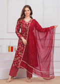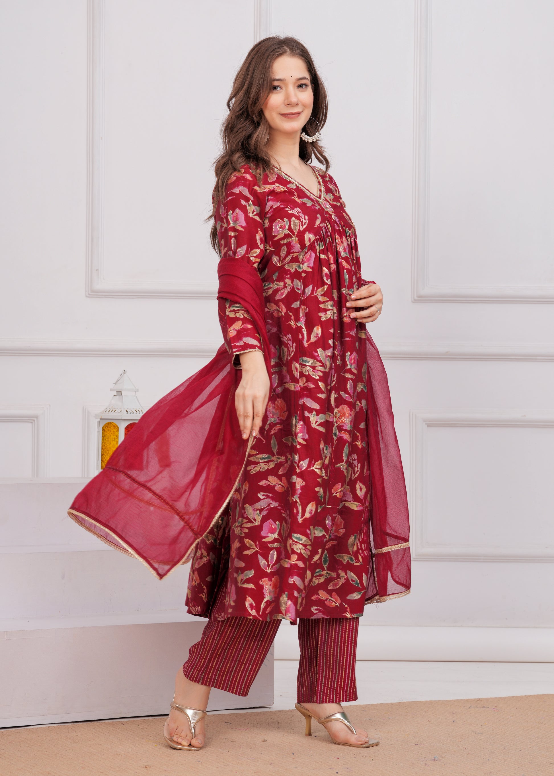 Make a graceful statement with this stunning maroon Alia-cut suit set, designed to elevate your ethnic wardrobe. The kurta features a flattering flare with delicate floral prints in soft pastel hues, enhanced by a subtle V-neckline adorned with fine gota detailing and hand embroidery. The set is completed with striped straight pants and a matching sheer organza dupatta finished with gold lace borders. Perfect for festive occasions, family gatherings, or semi-formal events, this ensemble brings together tradition and trend with effortless charm.