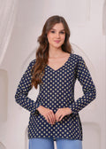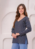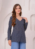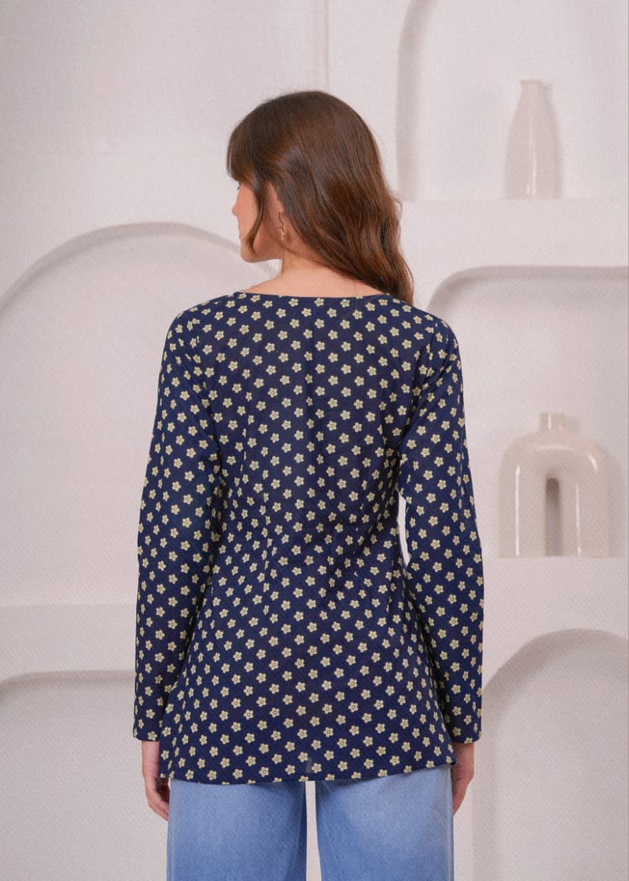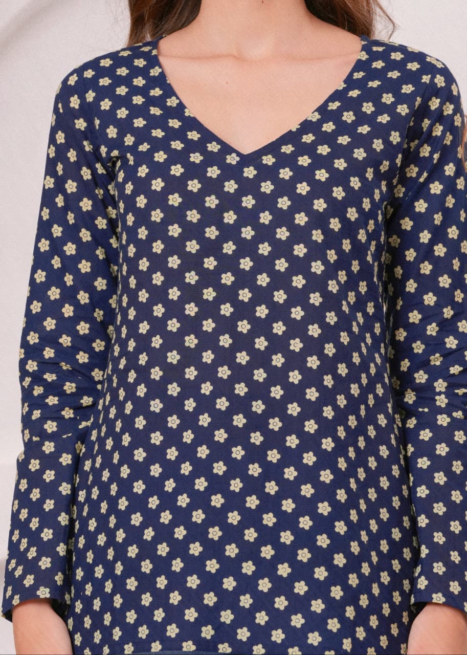 Add a touch of elegance to your everyday wardrobe with our Midnight Blossom Cotton Kurti, crafted in a deep navy base adorned with delicate beige floral motifs. Featuring a flattering V-neckline, full sleeves, and a straight cut with side slits, this kurti offers the perfect blend of comfort and elegance. Pair it with jeans, trousers, or palazzos for a versatile look that transitions effortlessly from casual outings to workwear. Made from breathable cotton, it ensures all-day ease while keeping your style effortlessly chic.