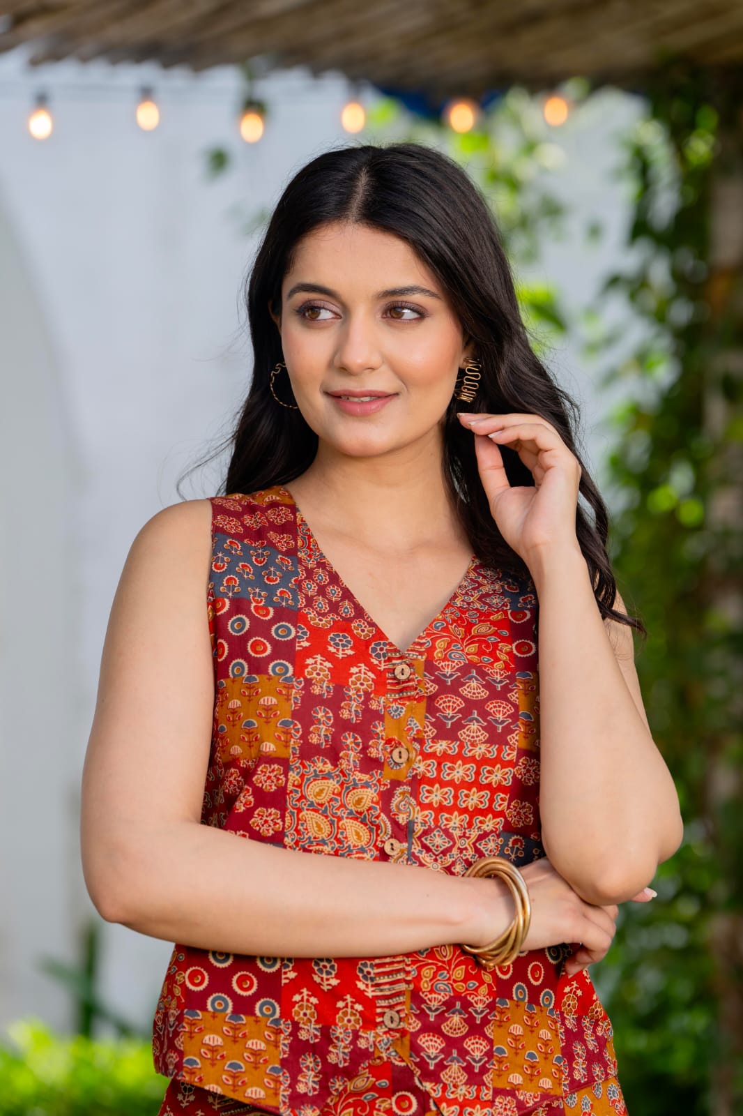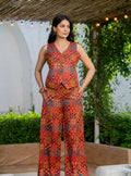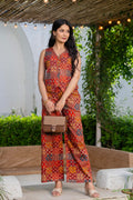 Step into effortless style with this chic handblock printed co-ord set. Designed in a sleeveless button-down top paired with wide-leg pants, it offers both comfort and elegance in equal measure. The intricate paisley-inspired motifs in earthy tones add a touch of tradition while keeping the look contemporary. Perfect for brunches, casual outings, or work-from-home days when you want to look stylish yet feel at ease.
