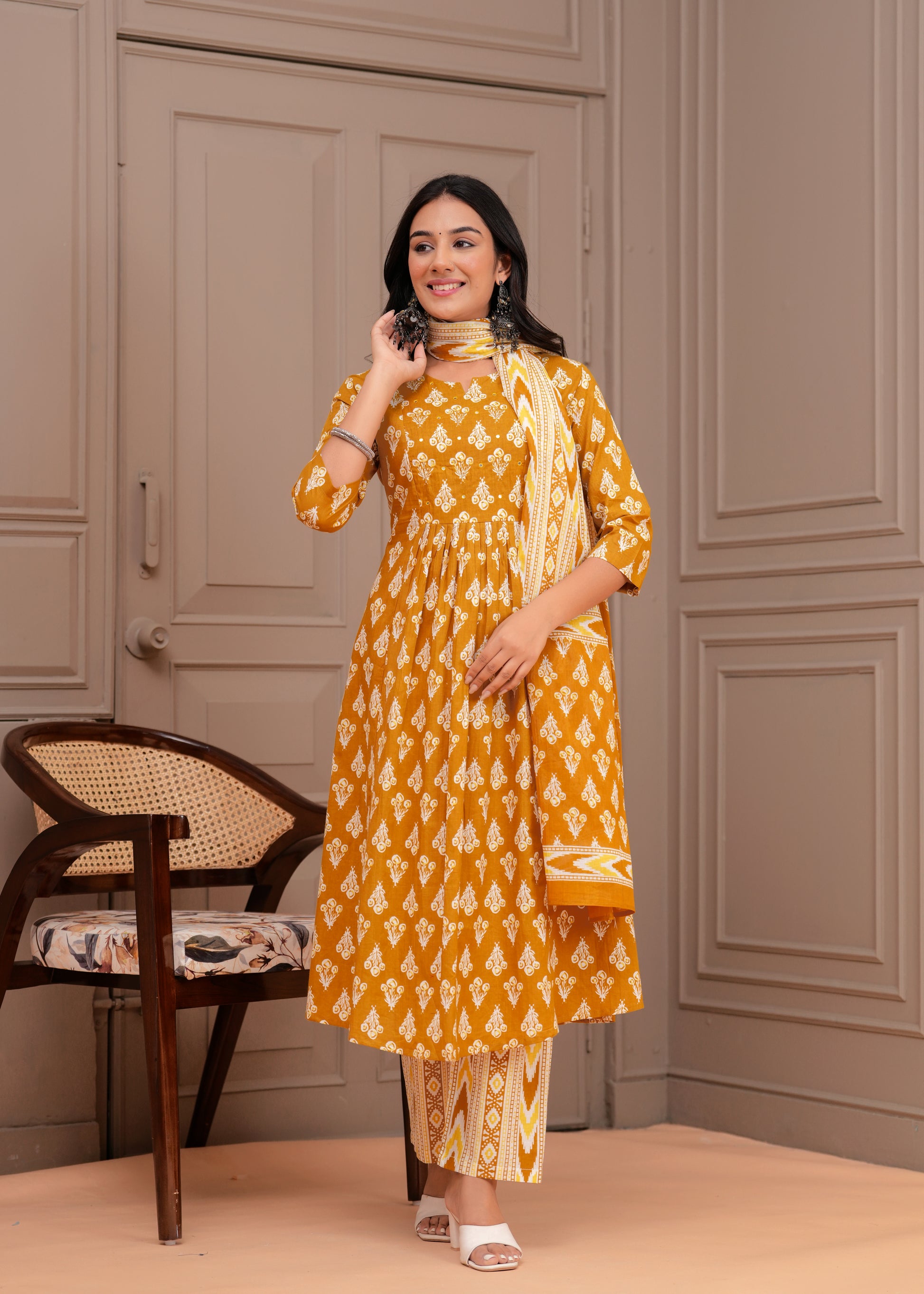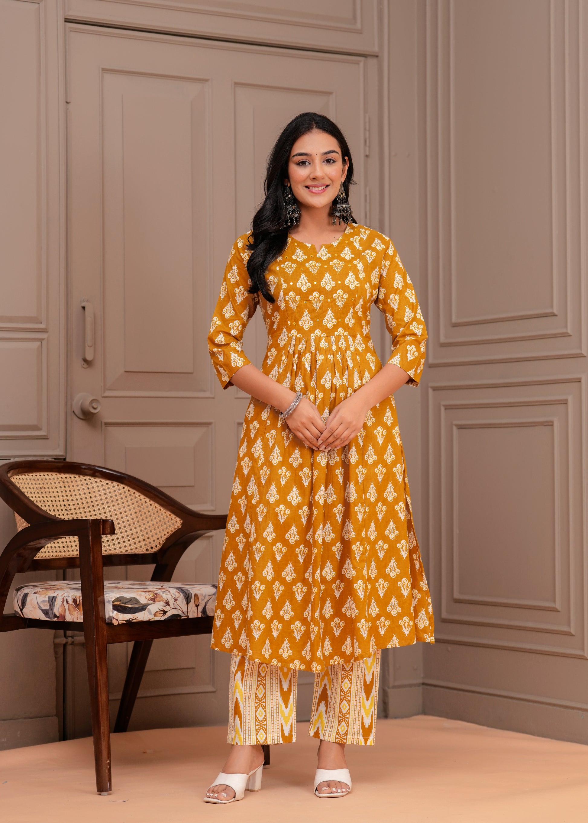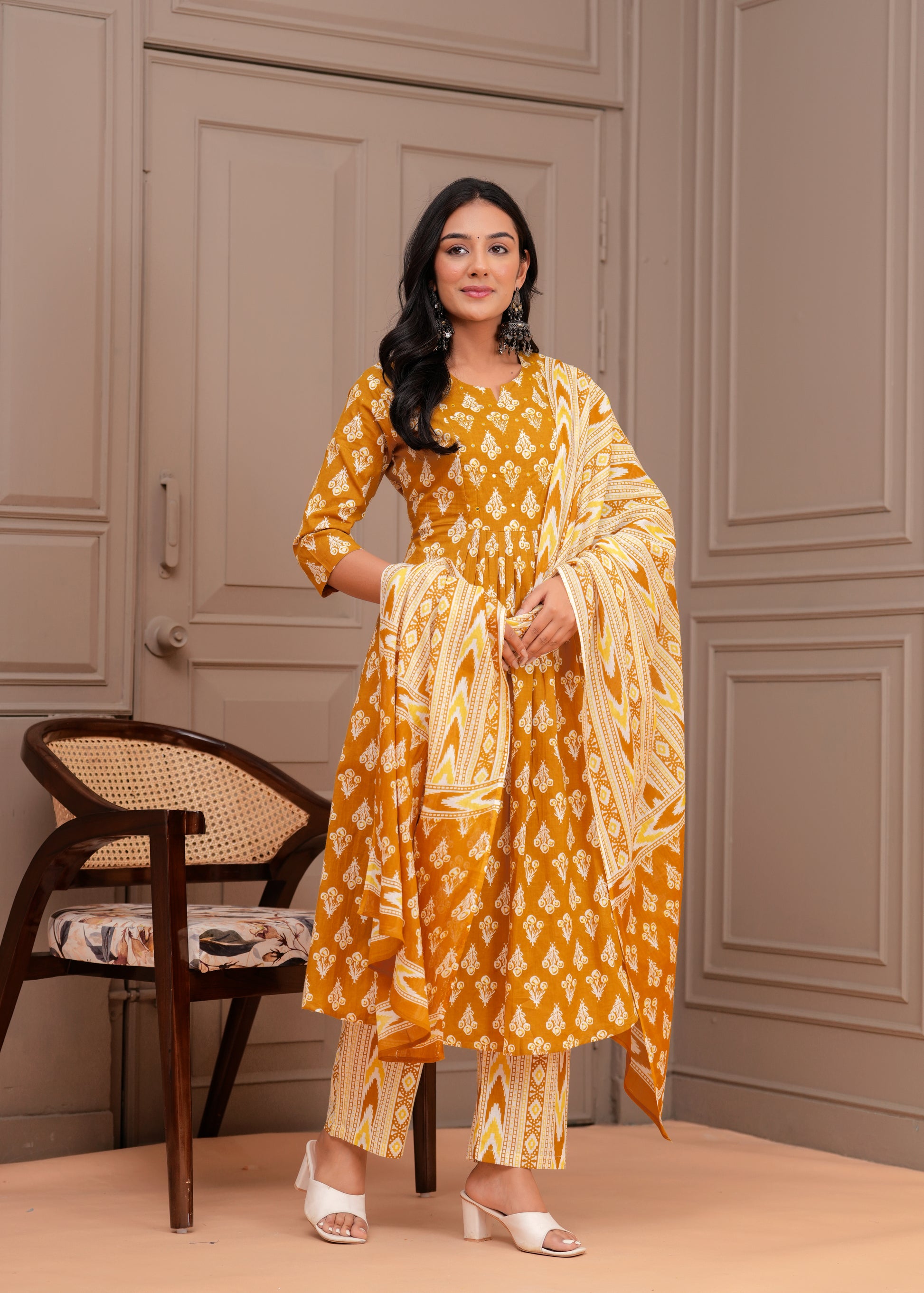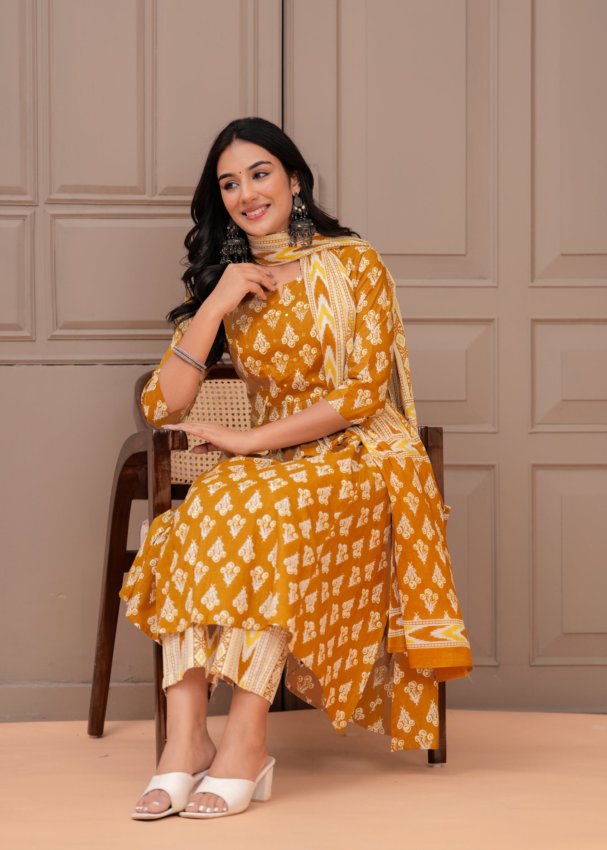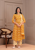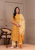 Add a splash of tradition and charm to your ethnic wardrobe with this vibrant mustard yellow pleated suit set. Designed for comfort with a flattering silhouette, this outfit is perfect for festive days, casual gatherings, or workwear with an ethnic twist. Kurta: Pleated A-line kurta with a round neckline and three-quarter sleeves. It features an elegant all-over ethnic print in white on a rich mustard yellow base. The gathered pleats at the waist give it a flared, graceful look that's flattering on all body types. Pants: Straight-fit printed pants in matching mustard tones with small motifs that perfectly complement the kurta for a coordinated ensemble. Dupatta: Lightweight, soft cotton mulmul dupatta with eye-catching striped and ikat-inspired print patterns in mustard, white, and warm hues—completing the outfit with a stylish flourish. This pleated suit set is a must-have for anyone who loves easy elegance with a traditional edge. Pair it with ethnic jhumkas and heels or flats for a graceful daytime look.