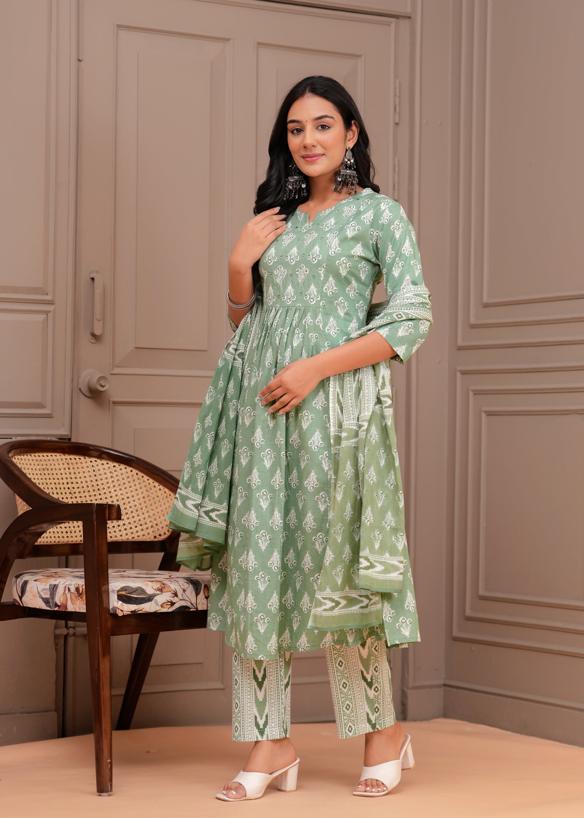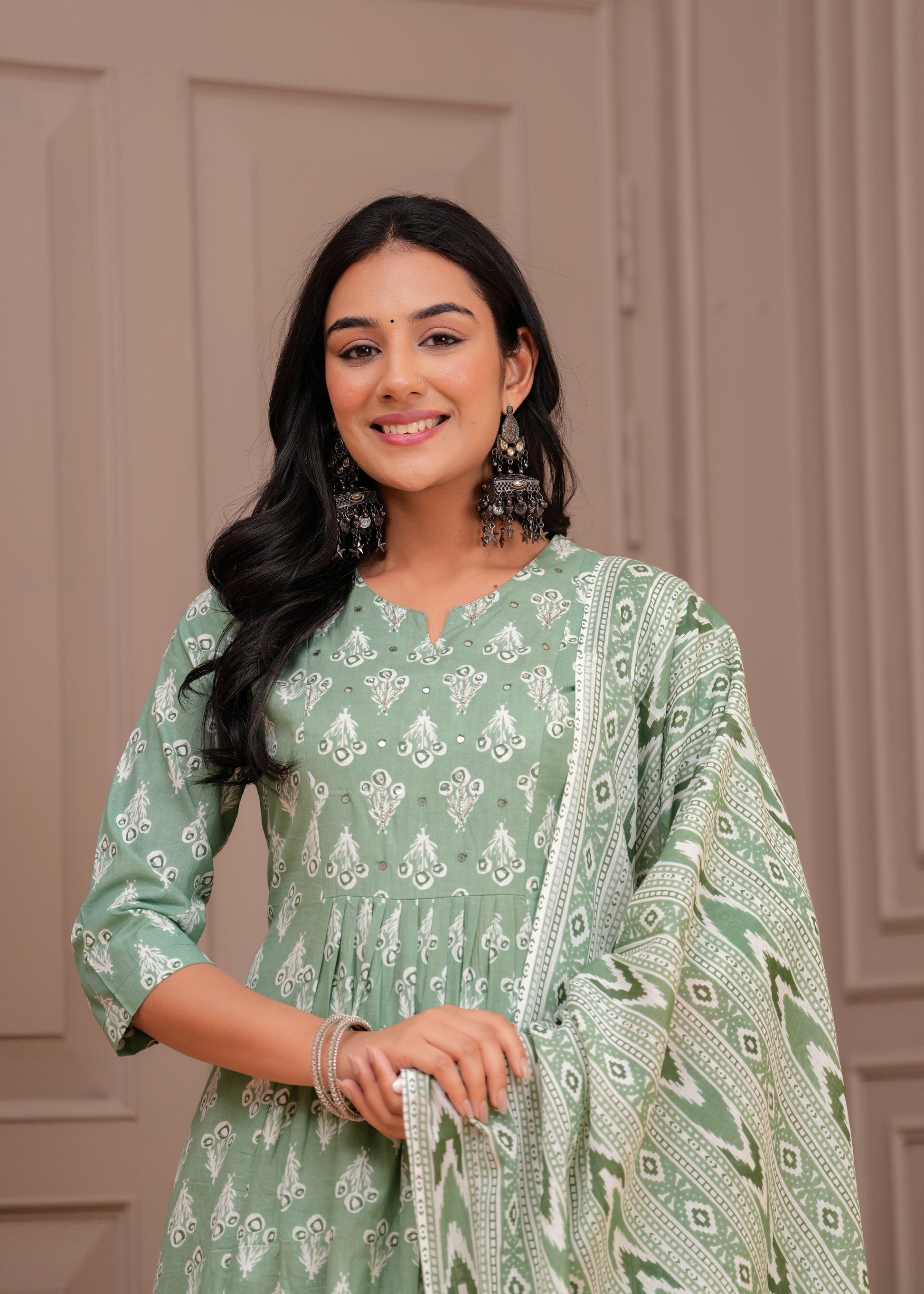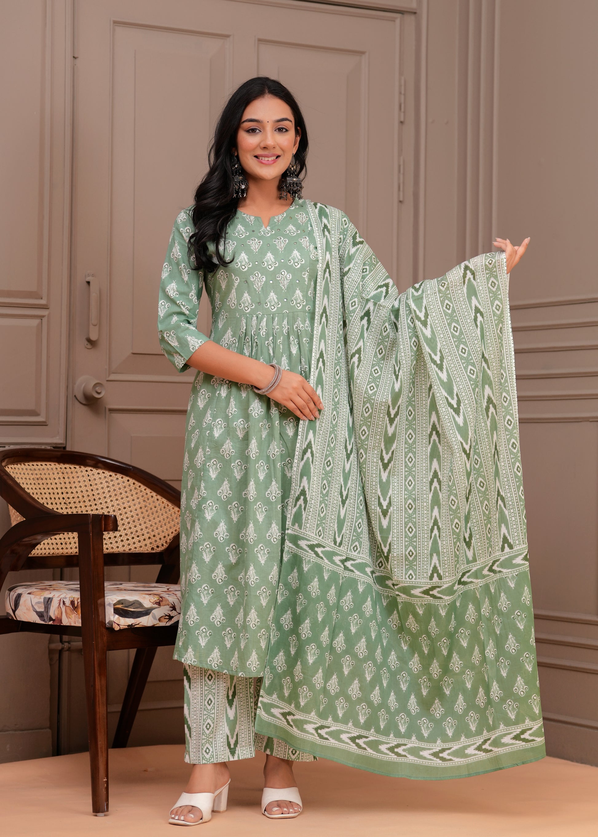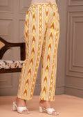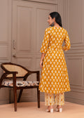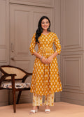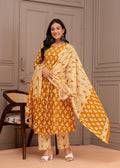 Add a splash of tradition and charm to your ethnic wardrobe with this vibrant mustard yellow pleated suit set. Designed for comfort with a flattering silhouette, this outfit is perfect for festive days, casual gatherings, or workwear with an ethnic twist. Kurta: Pleated A-line kurta with a round neckline and three-quarter sleeves. It features an elegant all-over ethnic print in white on a rich mustard yellow base. The gathered pleats at the waist give it a flared, graceful look that's flattering on all body types. Pants: Straight-fit printed pants in matching mustard tones with small motifs that perfectly complement the kurta for a coordinated ensemble. Dupatta: Lightweight, soft cotton mulmul dupatta with eye-catching striped and ikat-inspired print patterns in mustard, white, and warm hues—completing the outfit with a stylish flourish. This pleated suit set is a must-have for anyone who loves easy elegance with a traditional edge. Pair it with ethnic jhumkas and heels or flats for a graceful daytime look.
