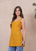 Style up your everyday style with this chic sleeveless short kurti, featuring an elegant mustard floral block print. Crafted from soft, breathable fabric, it offers all-day comfort with a modern, easy-to-wear silhouette. The side slits add a touch of flair, making it perfect to pair with palazzos, jeans, or straight pants. Ideal for casual outings, workwear, or relaxed looks.