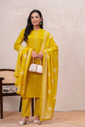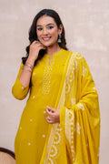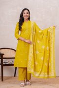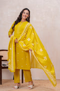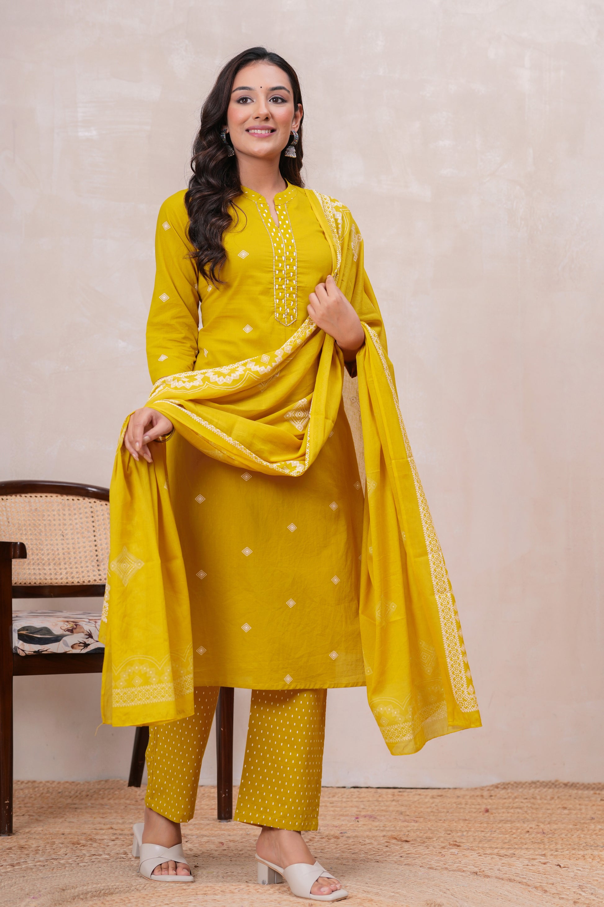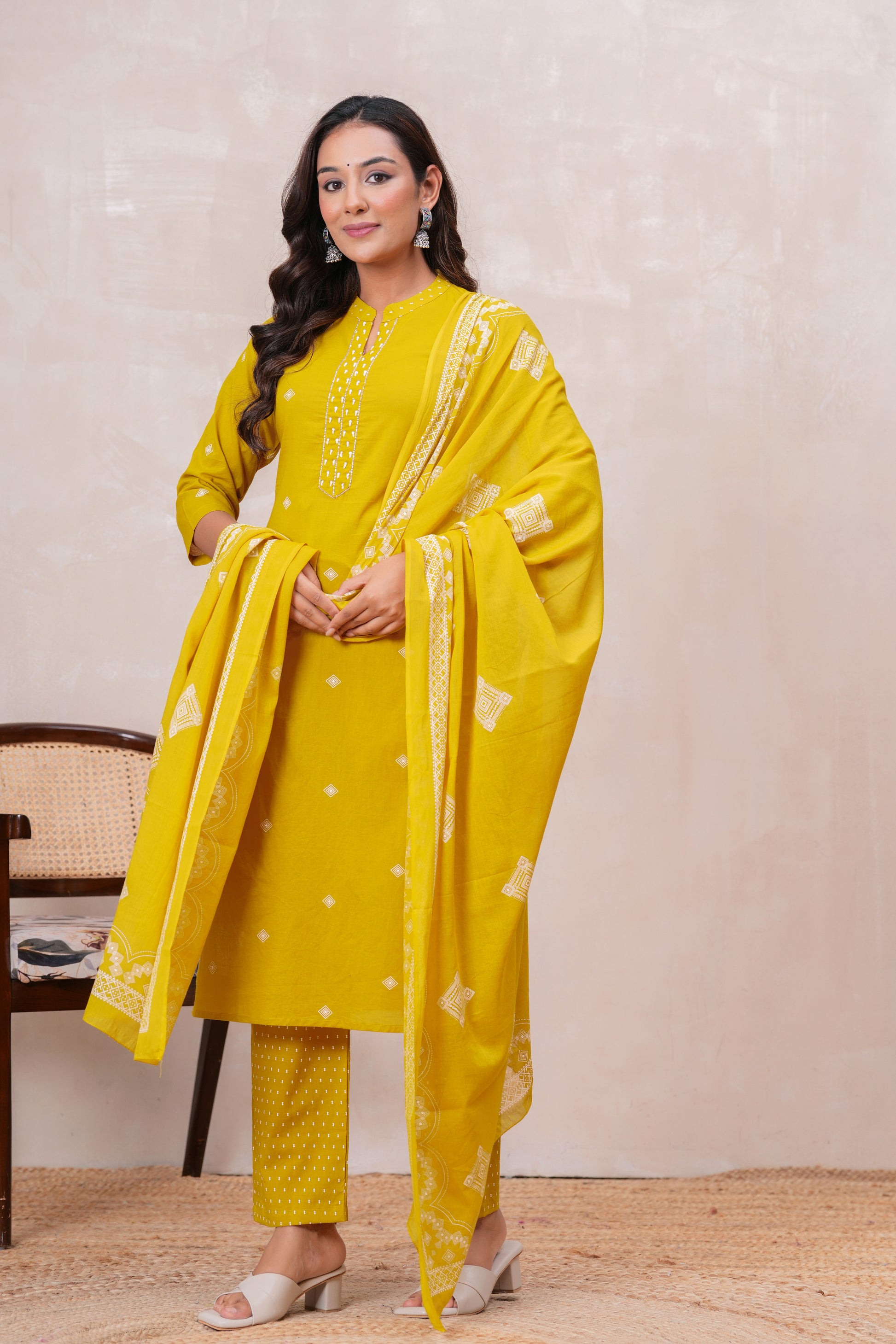Elevate your ethnic style with this elegant Mustard Handblock Printed Cotton Suit Set. The straight-fit kurta features intricate white prints on the yoke and sleeves, paired with solid rust cotton pants for all-day comfort. A beautifully printed dupatta adds a graceful touch to the look. Perfect for festive gatherings or everyday elegance.
