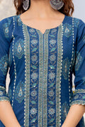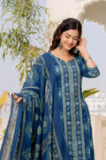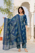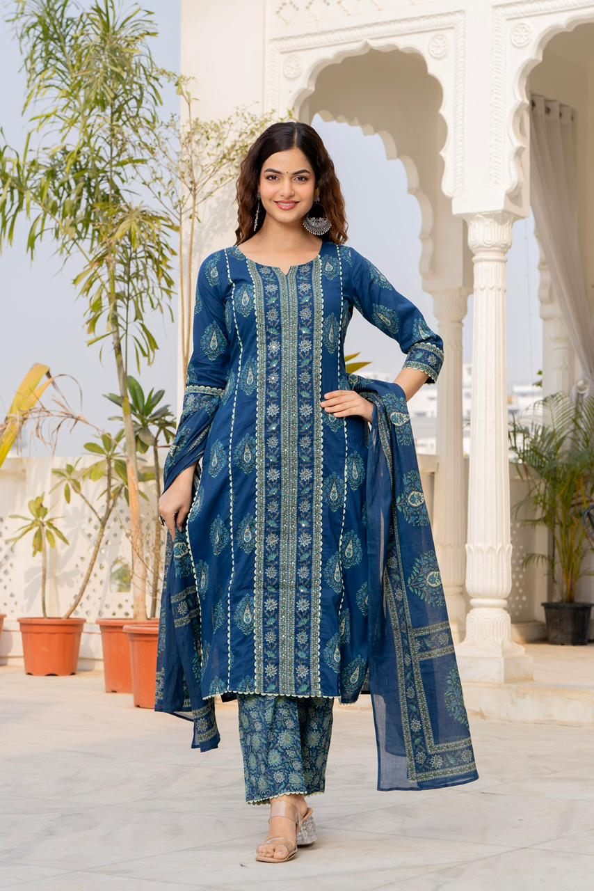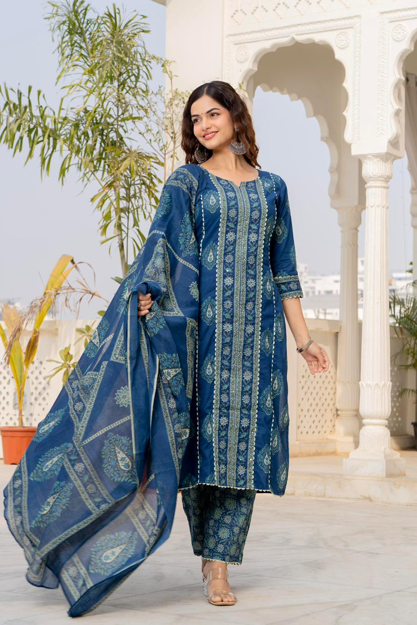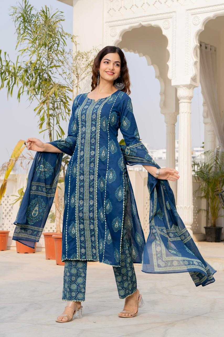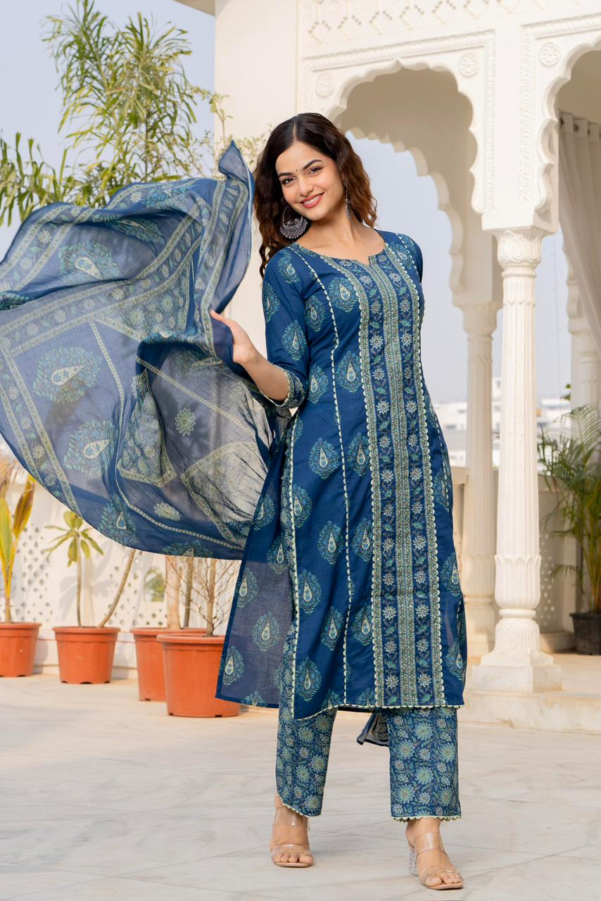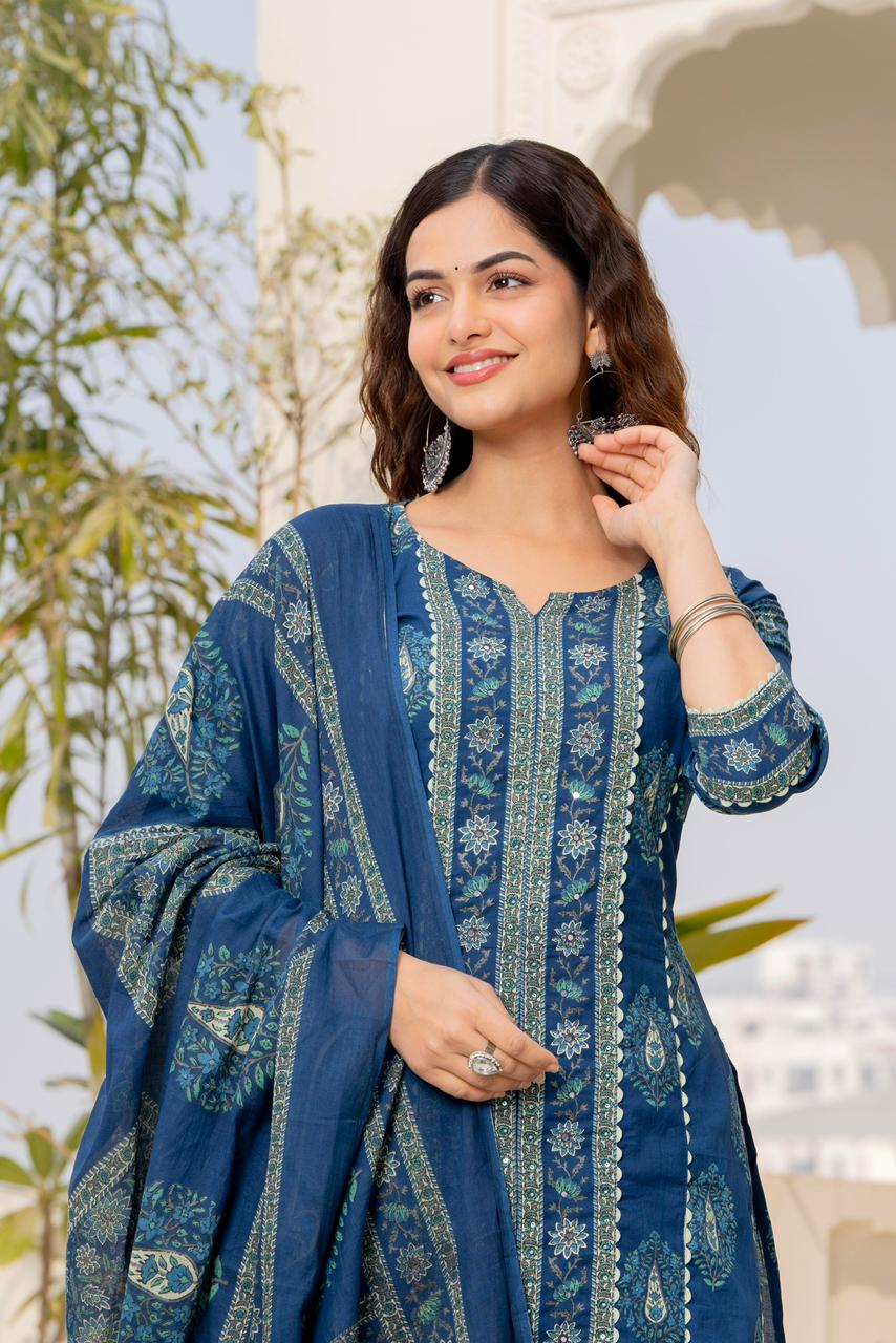 Refresh your everyday ethnic wardrobe with our Navy blue Straight Suit Set, crafted in soft, breathable cotton for all-day comfort. The blue base is adorned with delicate ivory flower handblock-inspired prints, lending a timeless and graceful appeal. The straight kurta features a beautifully detailed printed neckline, paired with coordinated straight pants and a matching printed dupatta finished with an elegant border. Perfect for workdays, casual outings, or daytime festivities, this suit set blends comfort with effortless elegance.