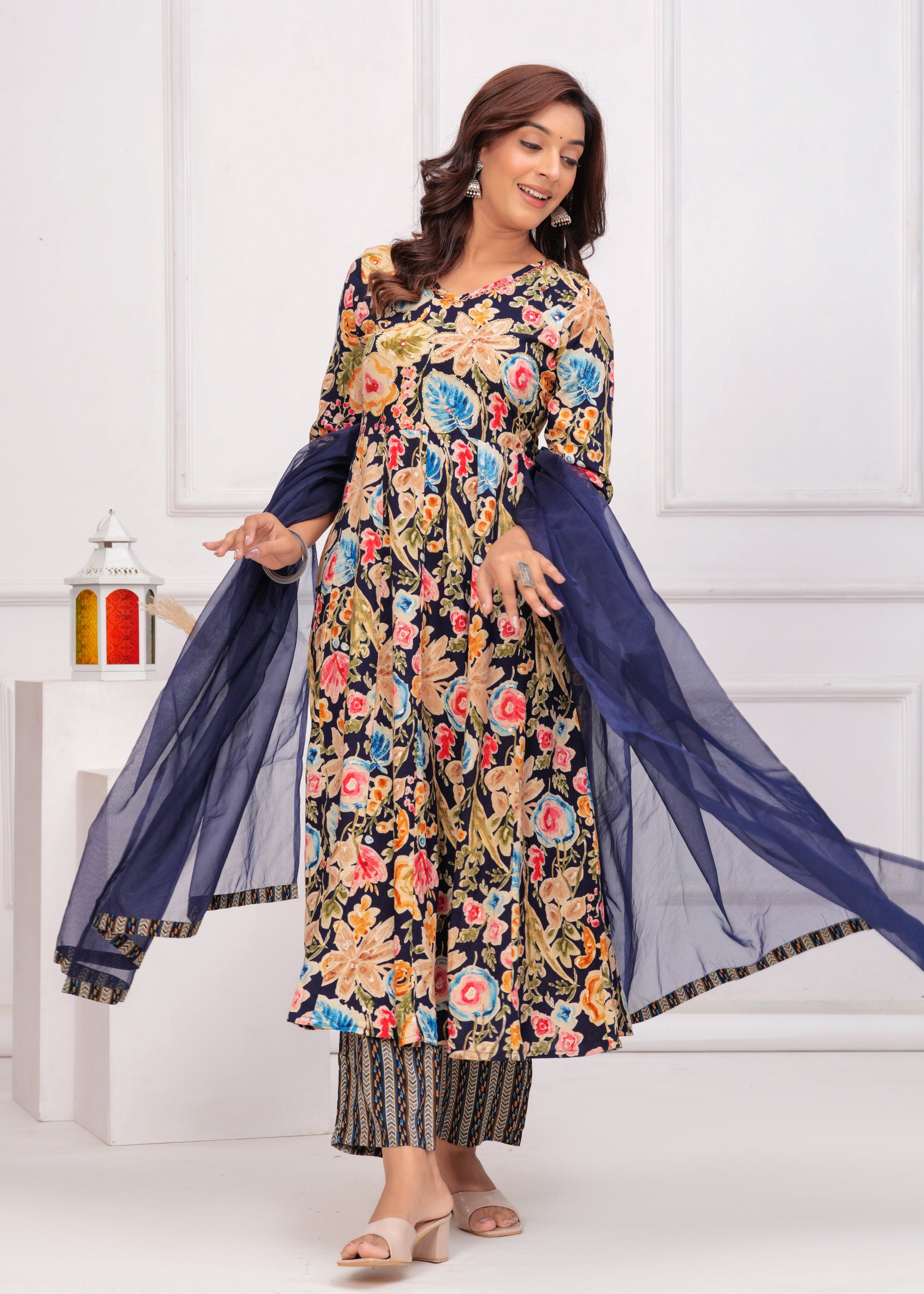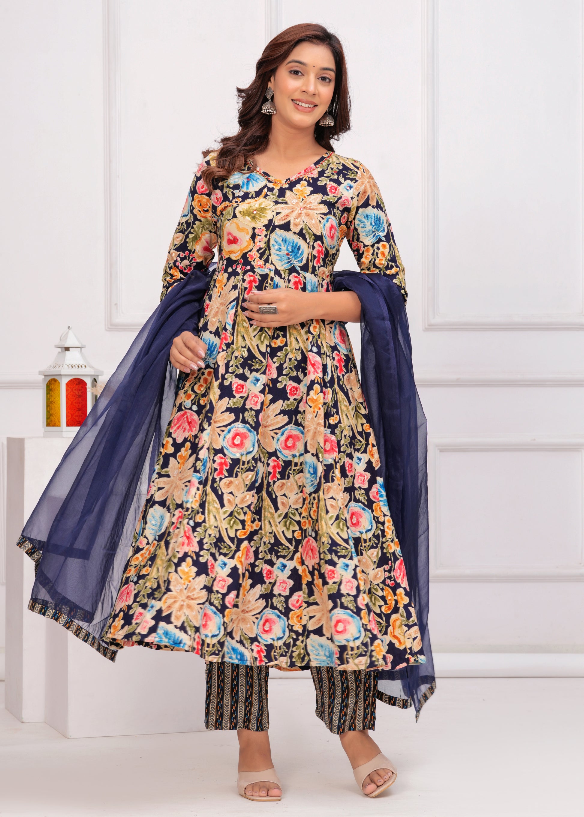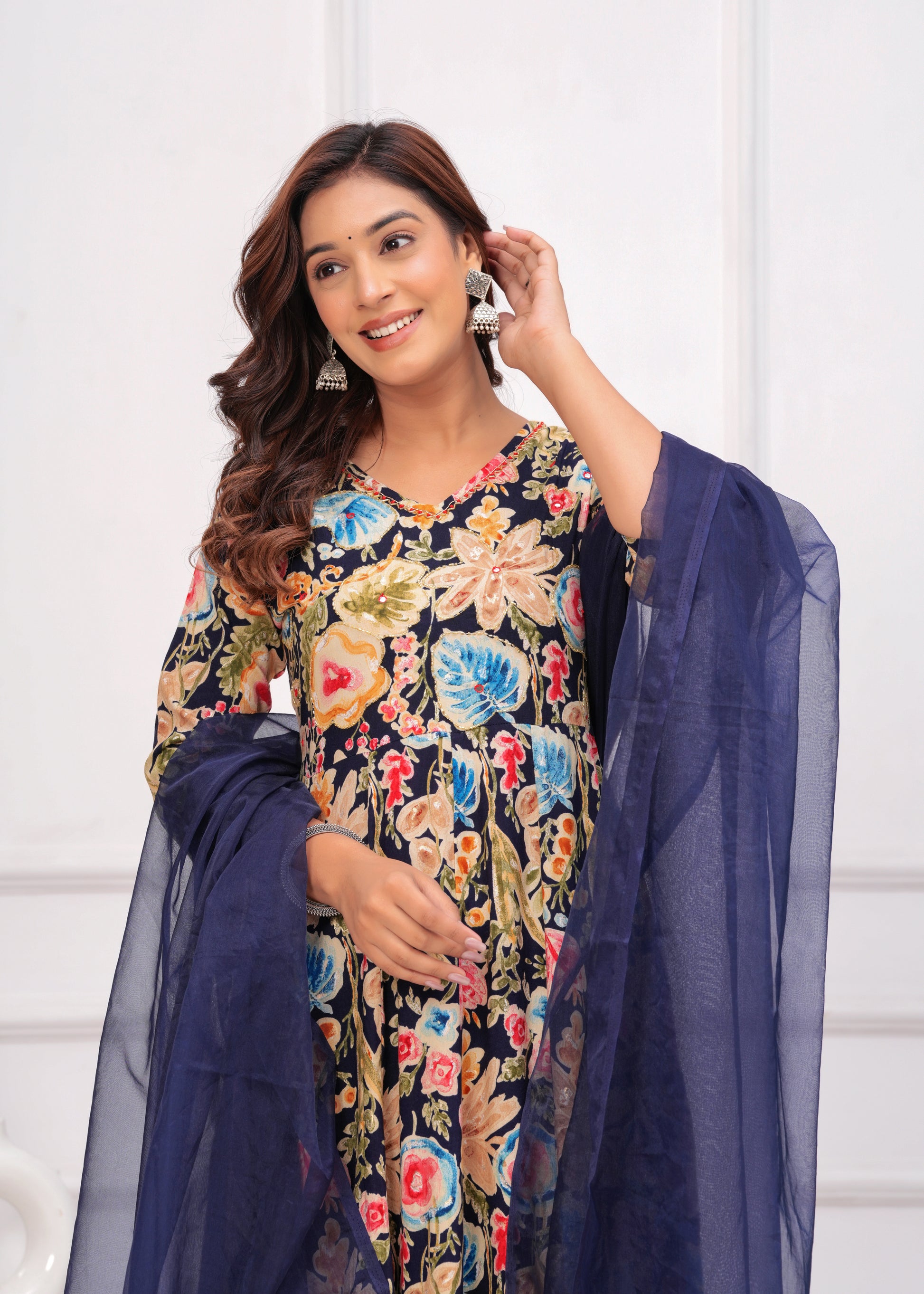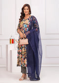 Bring elegance and charm to your ethnic collection with this navy blue floral printed anarkali suit set. This beautiful ensemble features a navy blue kurta adorned with vibrant floral prints, paired with matching straight-fit pants. The V-neckline with delicate detailing add a graceful touch, with beautiful embroidery. Completing the look is a solid navy blue dupatta with border, creating the perfect balance of tradition and modern flair. Ideal for festive occasions, casual gatherings, or daytime events.