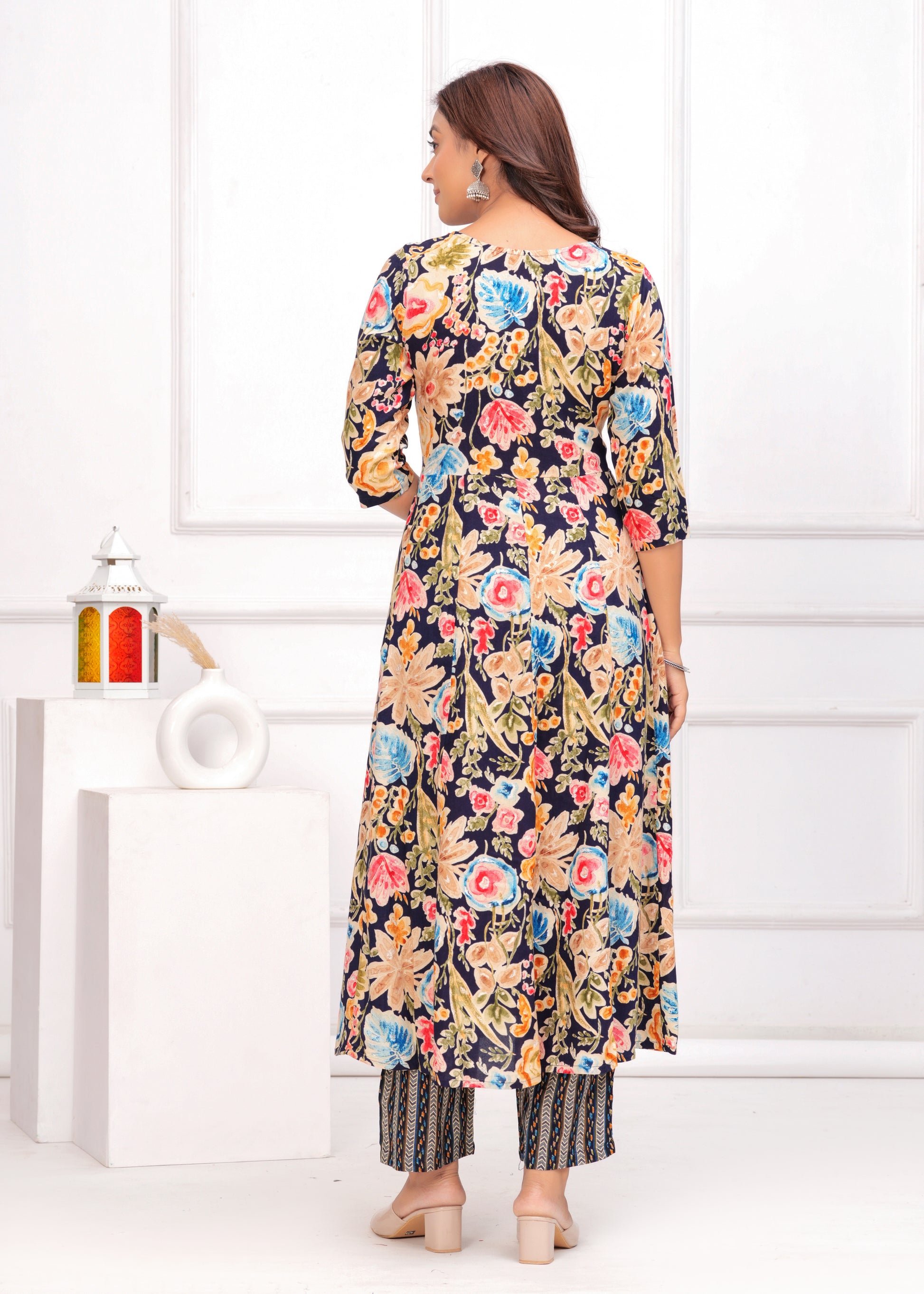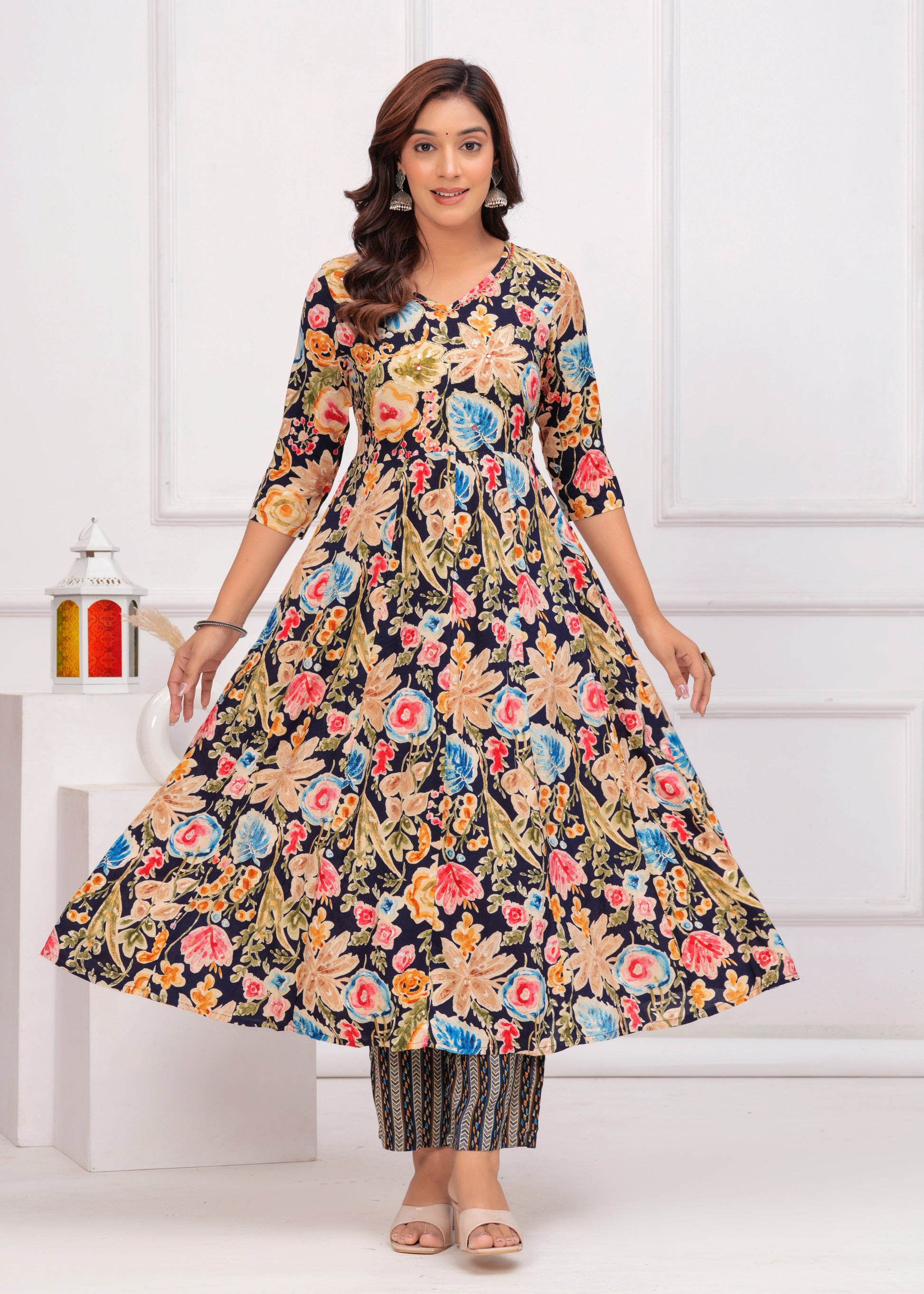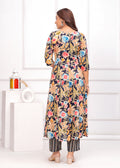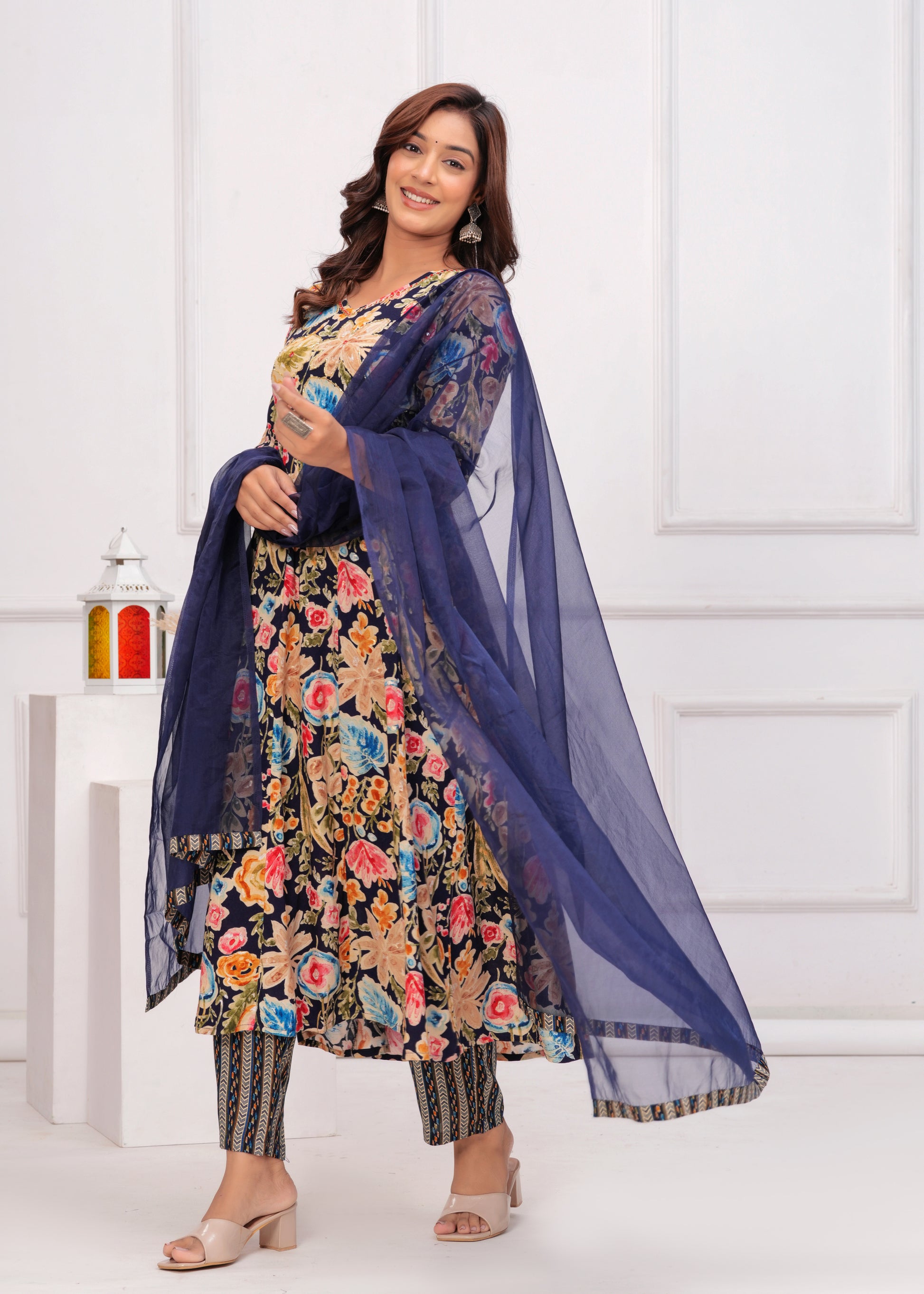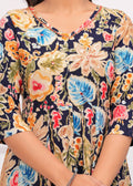 Bring elegance and charm to your ethnic collection with this navy blue floral printed anarkali suit set. This beautiful ensemble features a navy blue kurta adorned with vibrant floral prints, paired with matching straight-fit pants. The V-neckline with delicate detailing add a graceful touch, with beautiful embroidery. Completing the look is a solid navy blue dupatta with border, creating the perfect balance of tradition and modern flair. Ideal for festive occasions, casual gatherings, or daytime events.