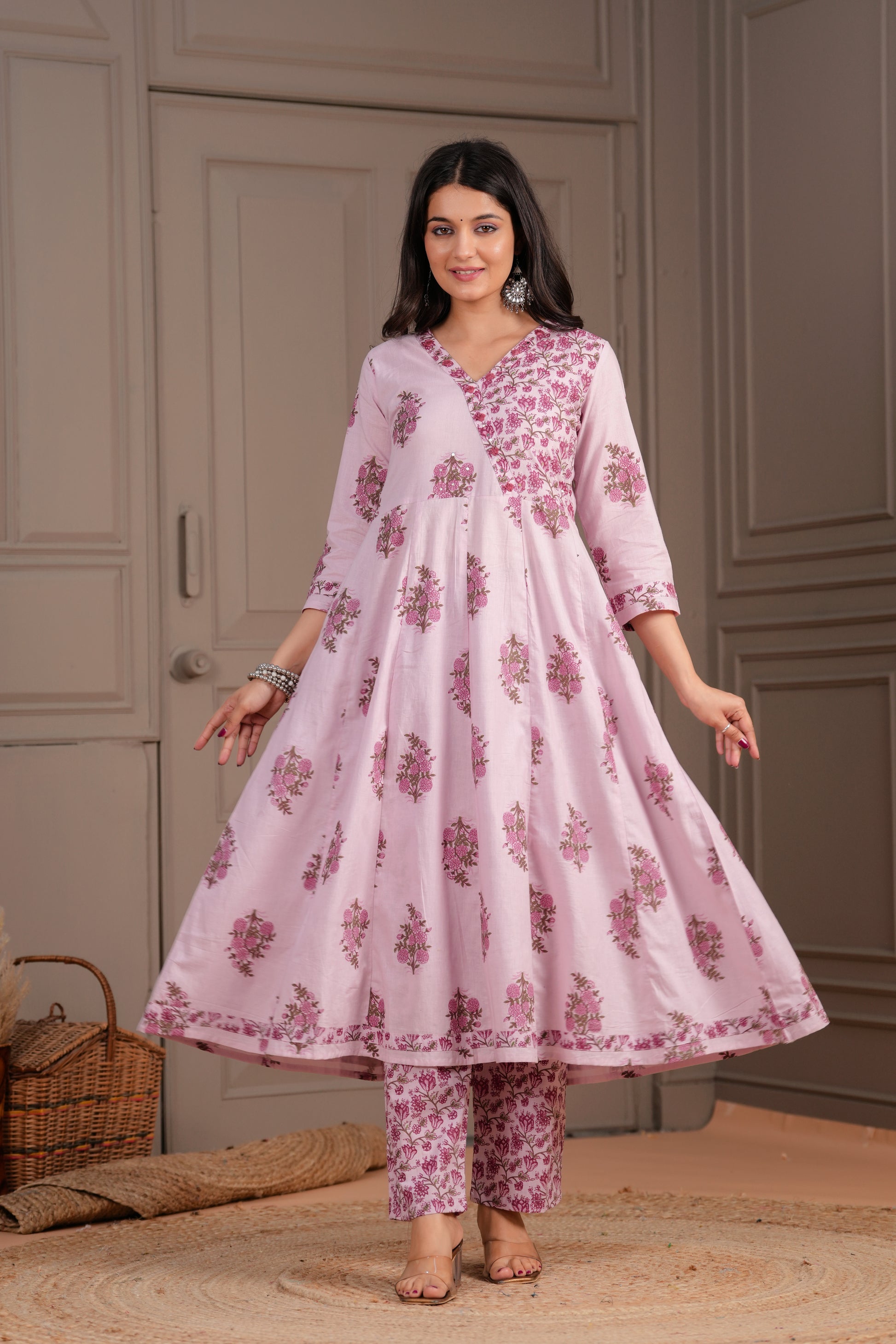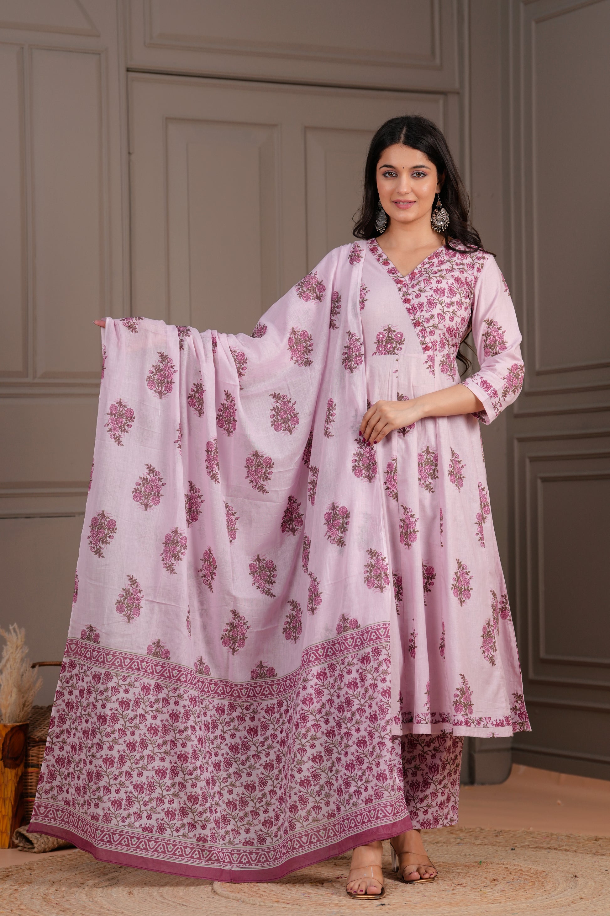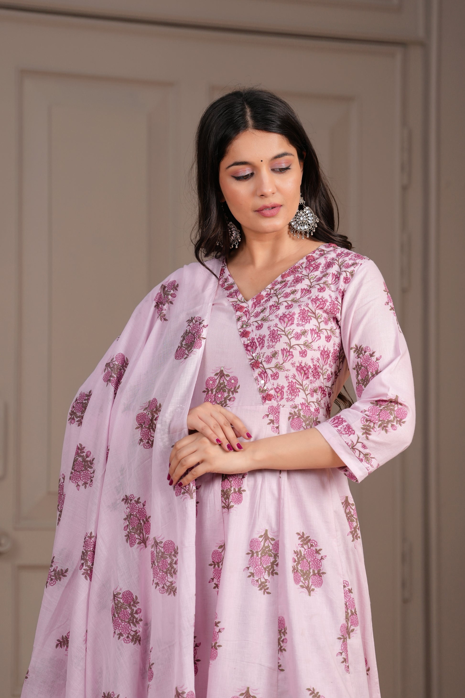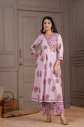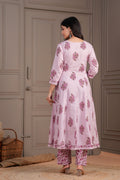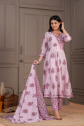 Elevate your ethnic charm with this graceful pink Anarkali suit set, intricately adorned with pink handblock floral motifs. The kurta features a flared silhouette with a structured yoke, V-neckline, and 3/4th sleeves, bringing together style and comfort. Paired with straight-fit pants and a beautifully coordinated cotton dupatta, this set is a perfect choice for daytime functions, festive gatherings, or casual elegance.