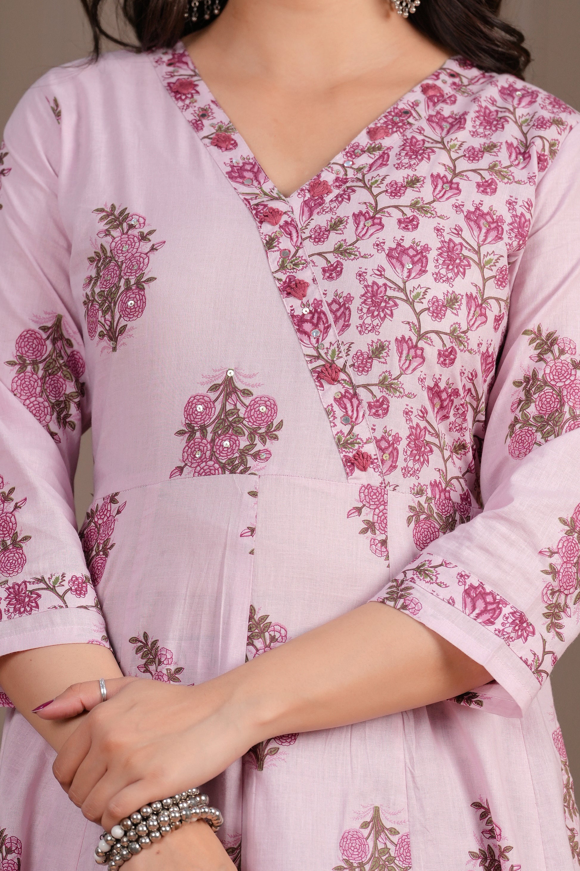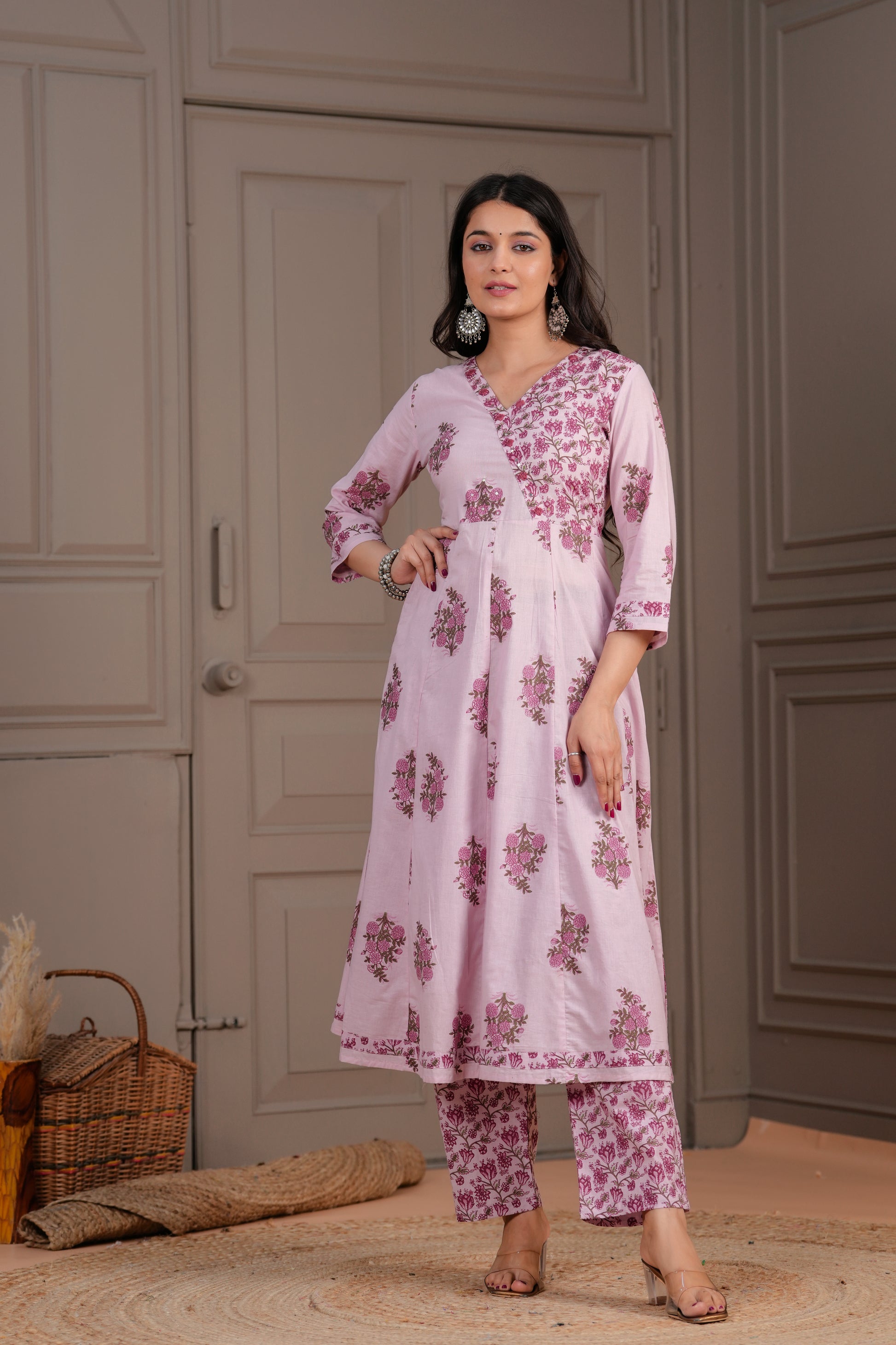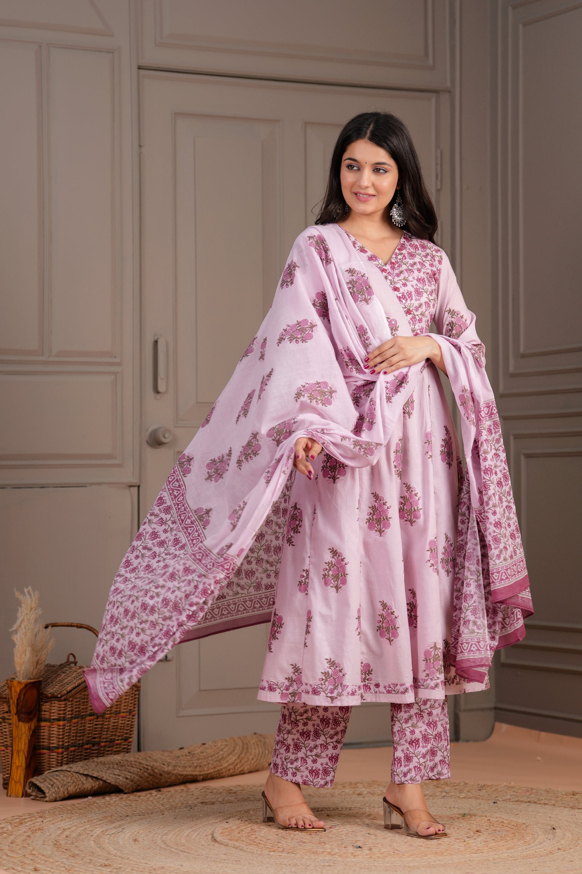 Elevate your ethnic charm with this graceful pink Anarkali suit set, intricately adorned with pink handblock floral motifs. The kurta features a flared silhouette with a structured yoke, V-neckline, and 3/4th sleeves, bringing together style and comfort. Paired with straight-fit pants and a beautifully coordinated cotton dupatta, this set is a perfect choice for daytime functions, festive gatherings, or casual elegance.