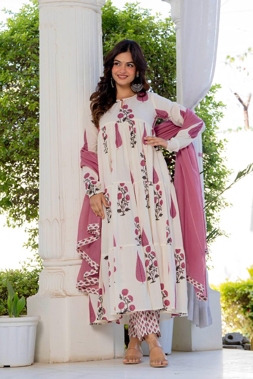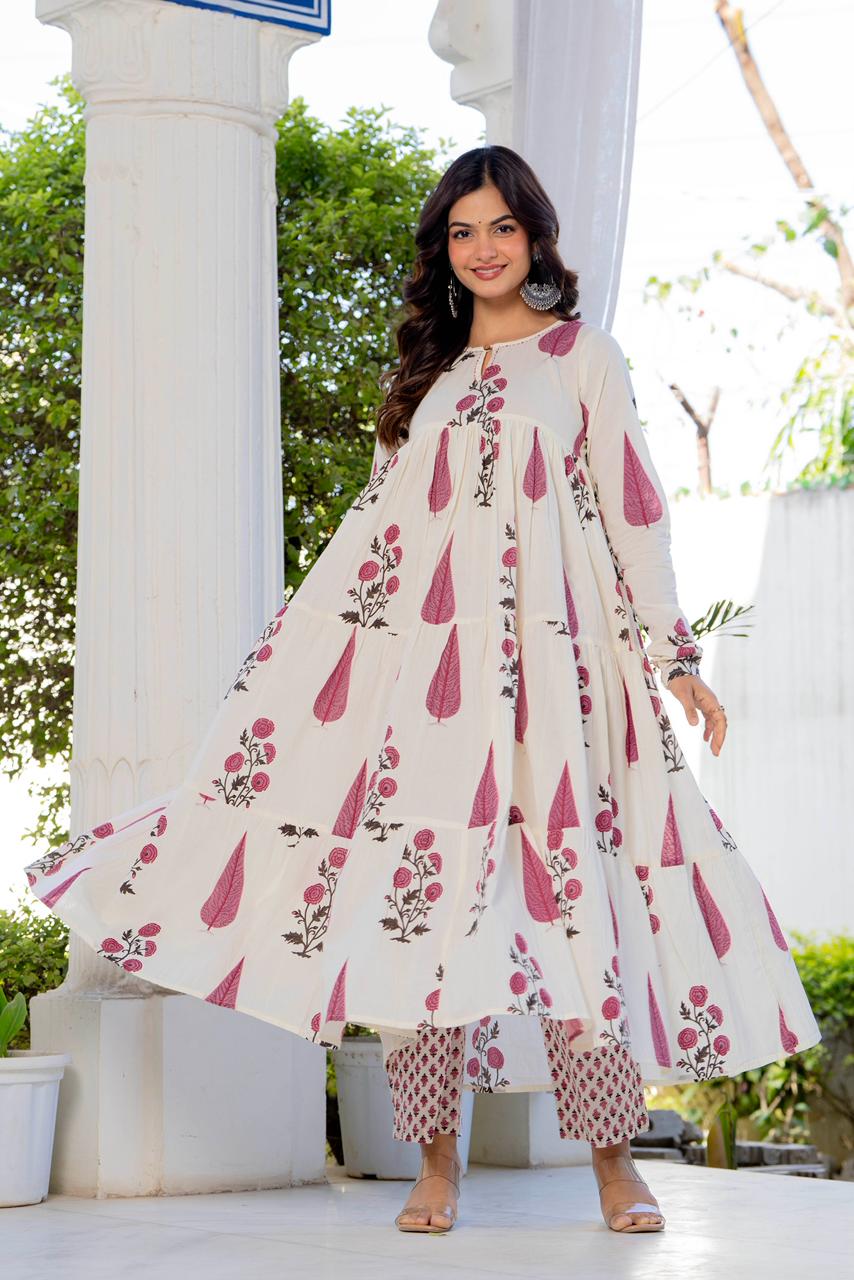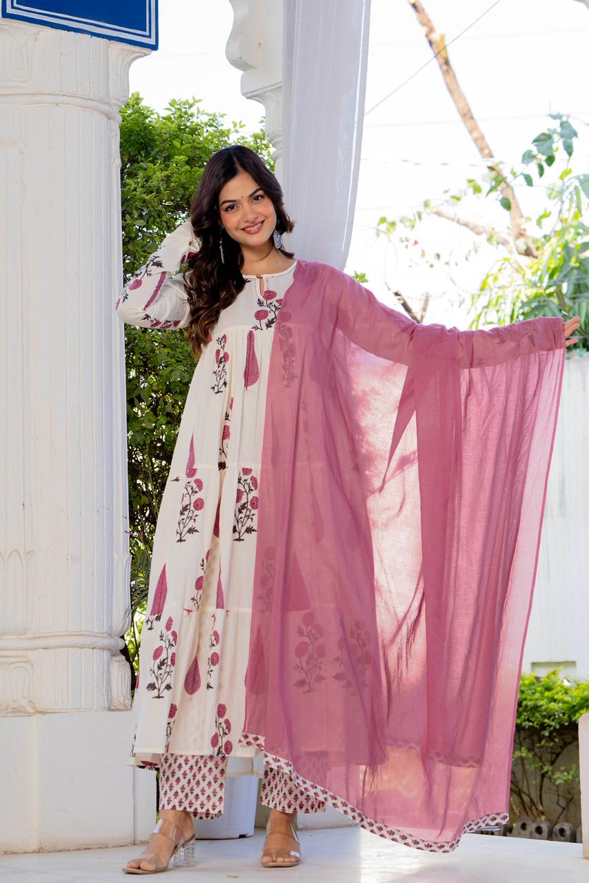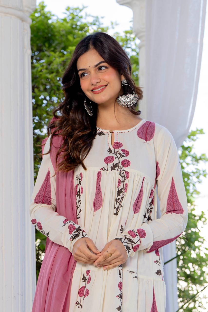 Elevate your everyday elegance with our pink buta Tiered Grace Set, designed to bring effortless charm to your wardrobe. Crafted in a soft ivory base, this beautifully flared tiered kurta features delicate rose and paisley-inspired prints in soothing pink tones, creating a romantic and graceful appeal.
