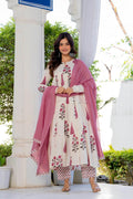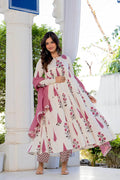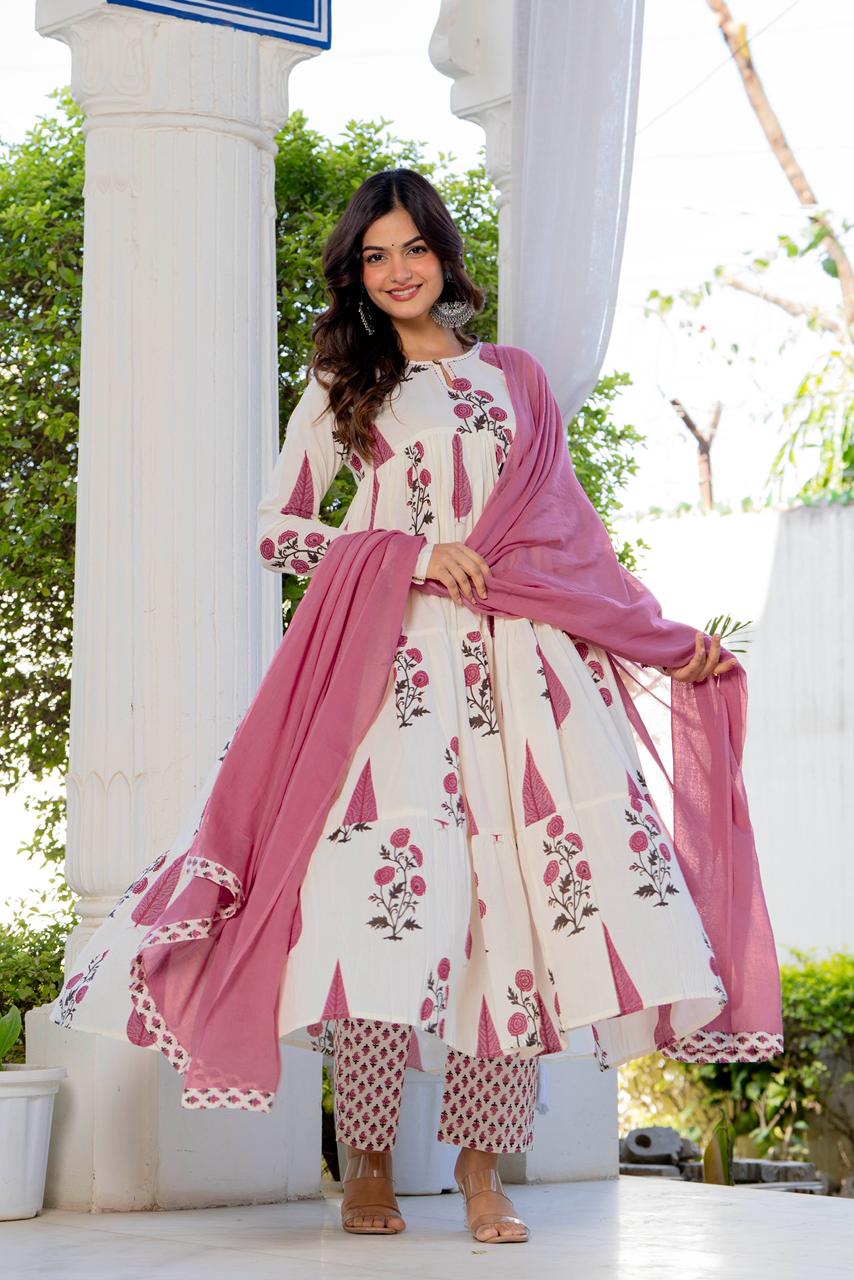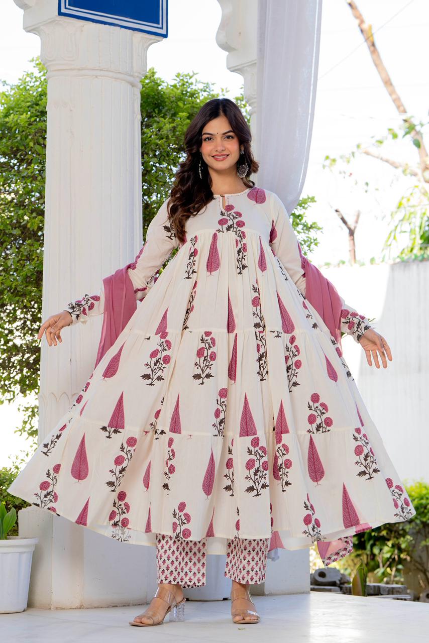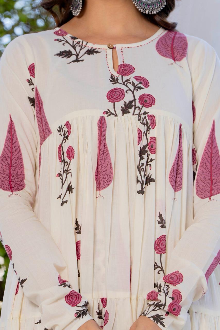 Elevate your everyday elegance with our pink buta Tiered Grace Set, designed to bring effortless charm to your wardrobe. Crafted in a soft ivory base, this beautifully flared tiered kurta features delicate rose and paisley-inspired prints in soothing pink tones, creating a romantic and graceful appeal.