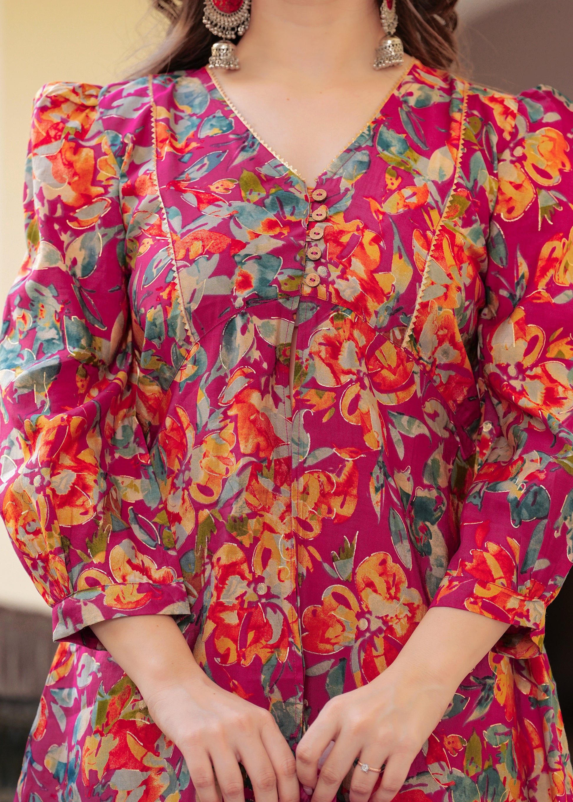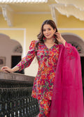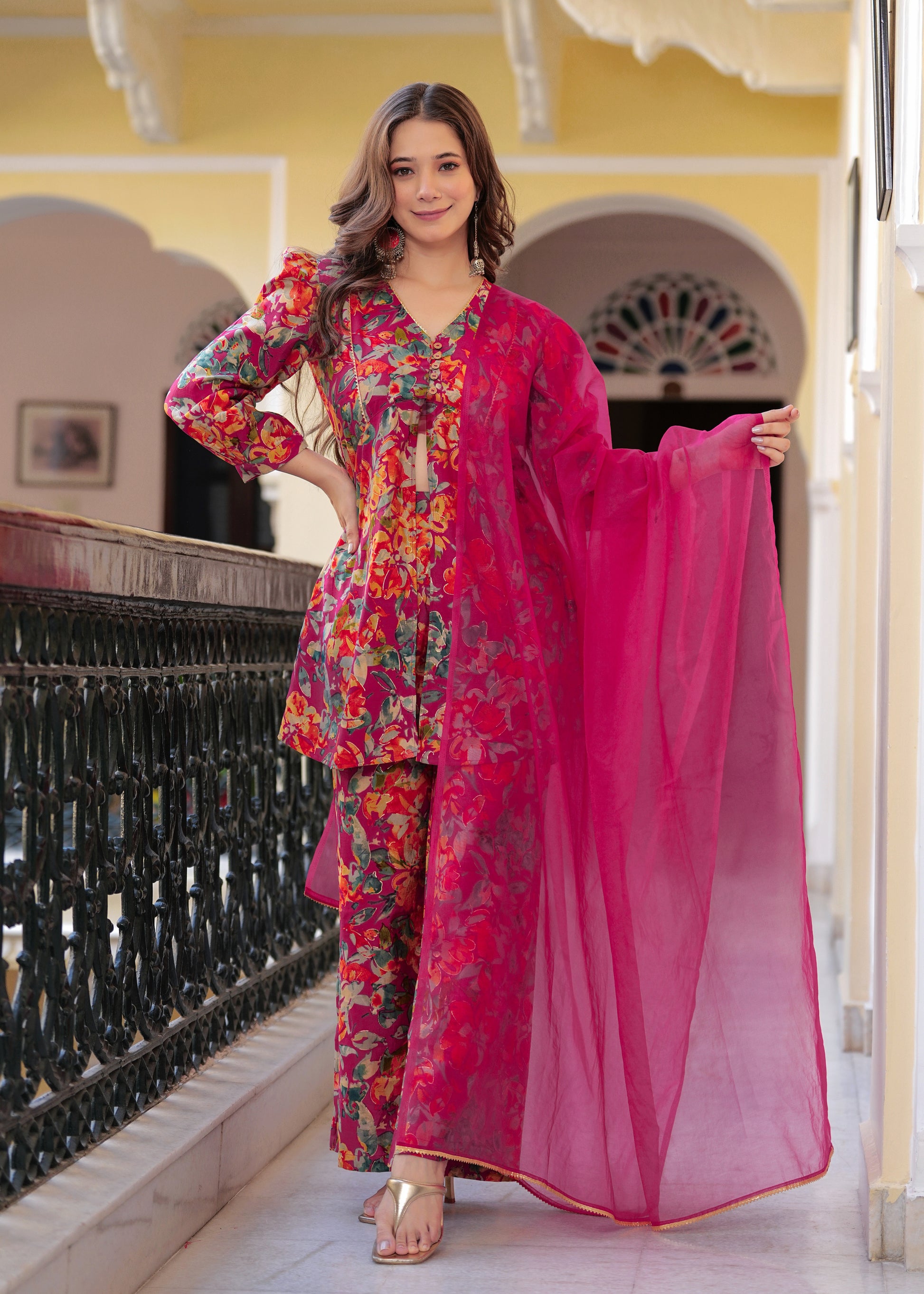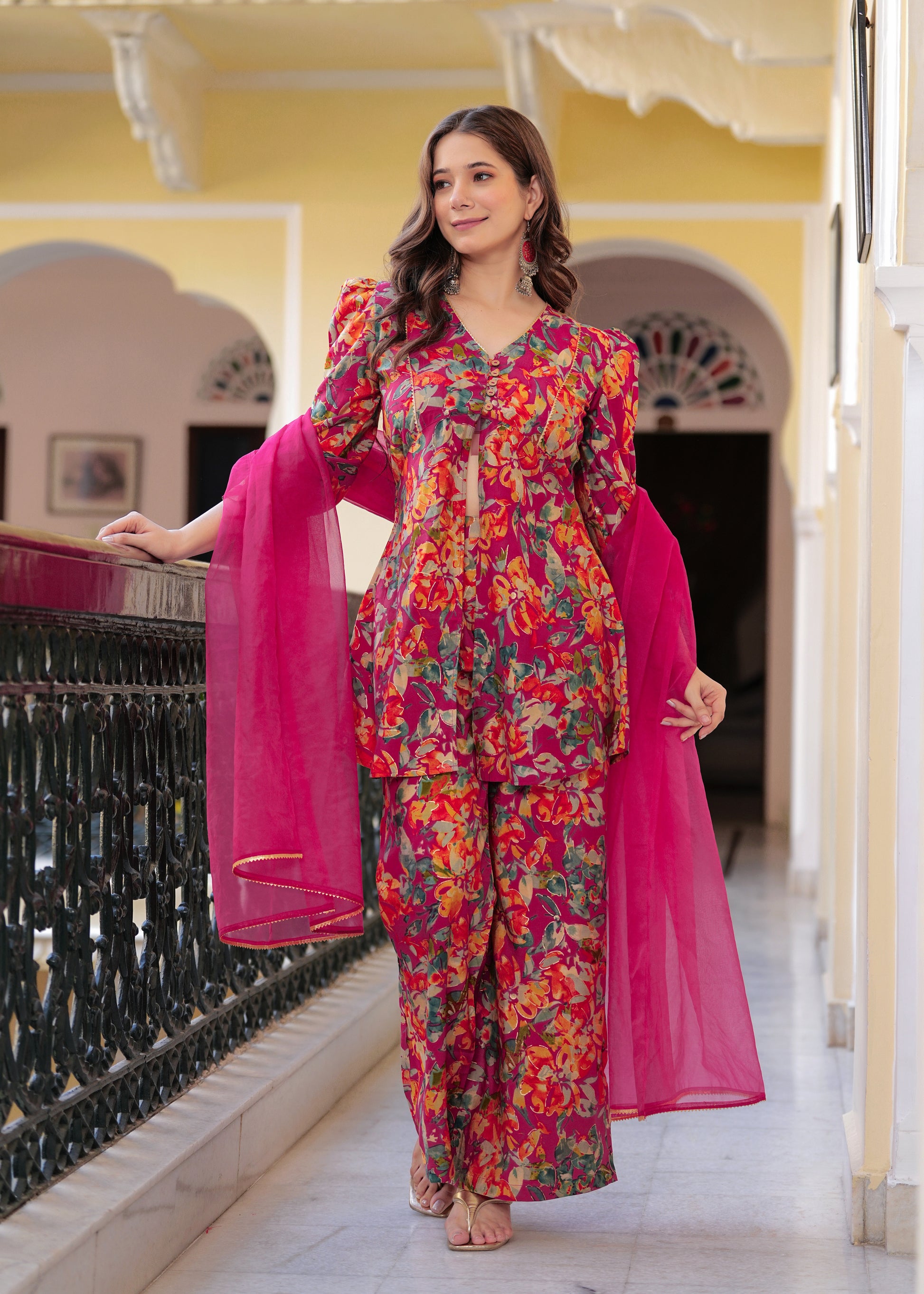 Brighten up your festive wardrobe with this vibrant pink floral co-ord set. Crafted from soft, chanderi fabric, this set features a V-neck peplum-style kurti with statement puff sleeves and a front tie-up detail for a flattering fit. The matching straight pants add a modern edge, while the solid pink organza dupatta with delicate lace detailing brings balance and elegance to the look. Perfect for daytime festivities or intimate gatherings, this ensemble blends comfort and style effortlessly.