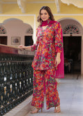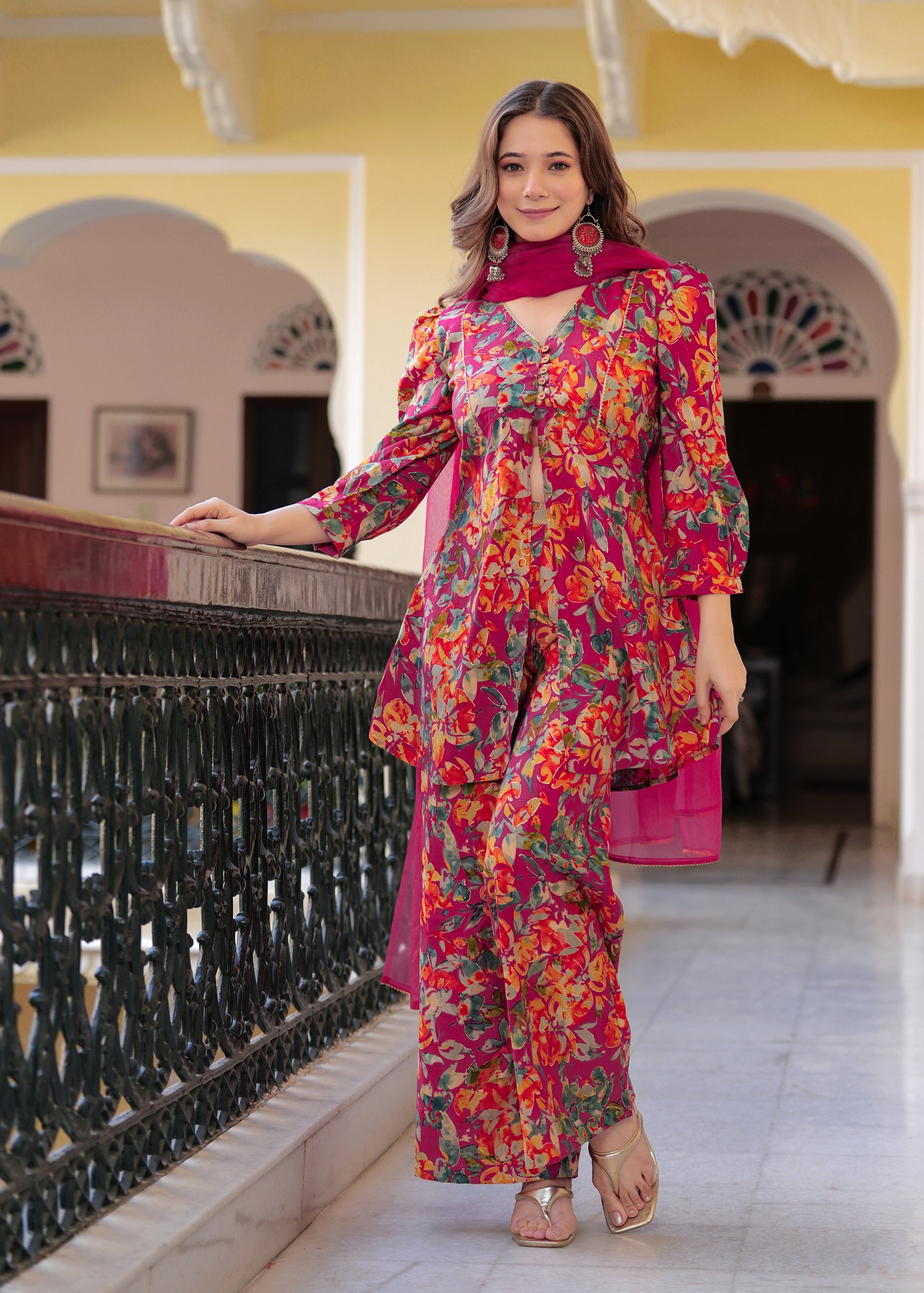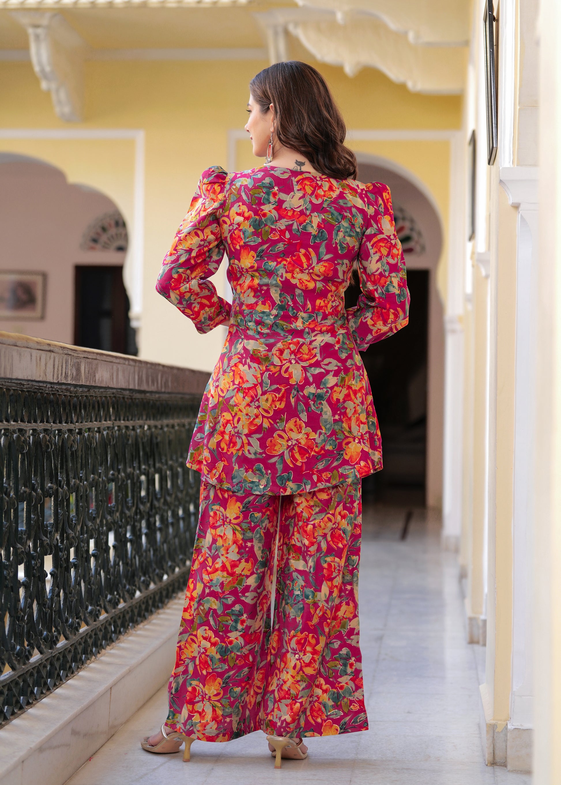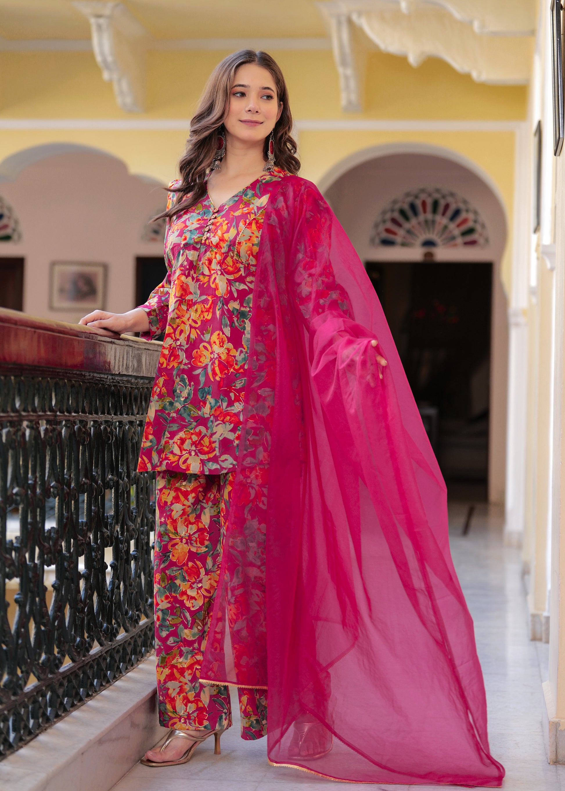 Brighten up your festive wardrobe with this vibrant pink floral co-ord set. Crafted from soft, chanderi fabric, this set features a V-neck peplum-style kurti with statement puff sleeves and a front tie-up detail for a flattering fit. The matching straight pants add a modern edge, while the solid pink organza dupatta with delicate lace detailing brings balance and elegance to the look. Perfect for daytime festivities or intimate gatherings, this ensemble blends comfort and style effortlessly.