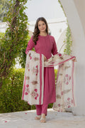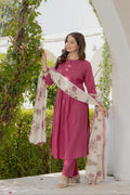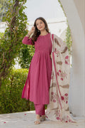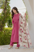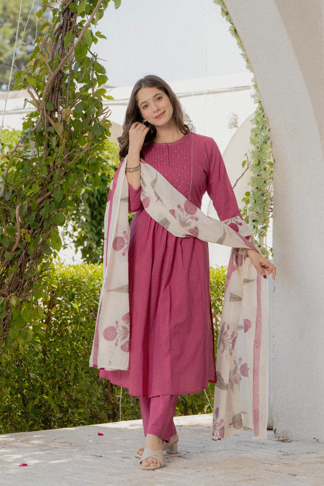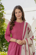 Grace in every detail, this elegant Pink cotton suit set features delicate pintuck detailing on the yoke paired with a beautifully hand-block printed dupatta. A perfect blend of simplicity and sophistication — ideal for festive gatherings or daytime elegance.