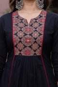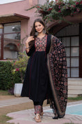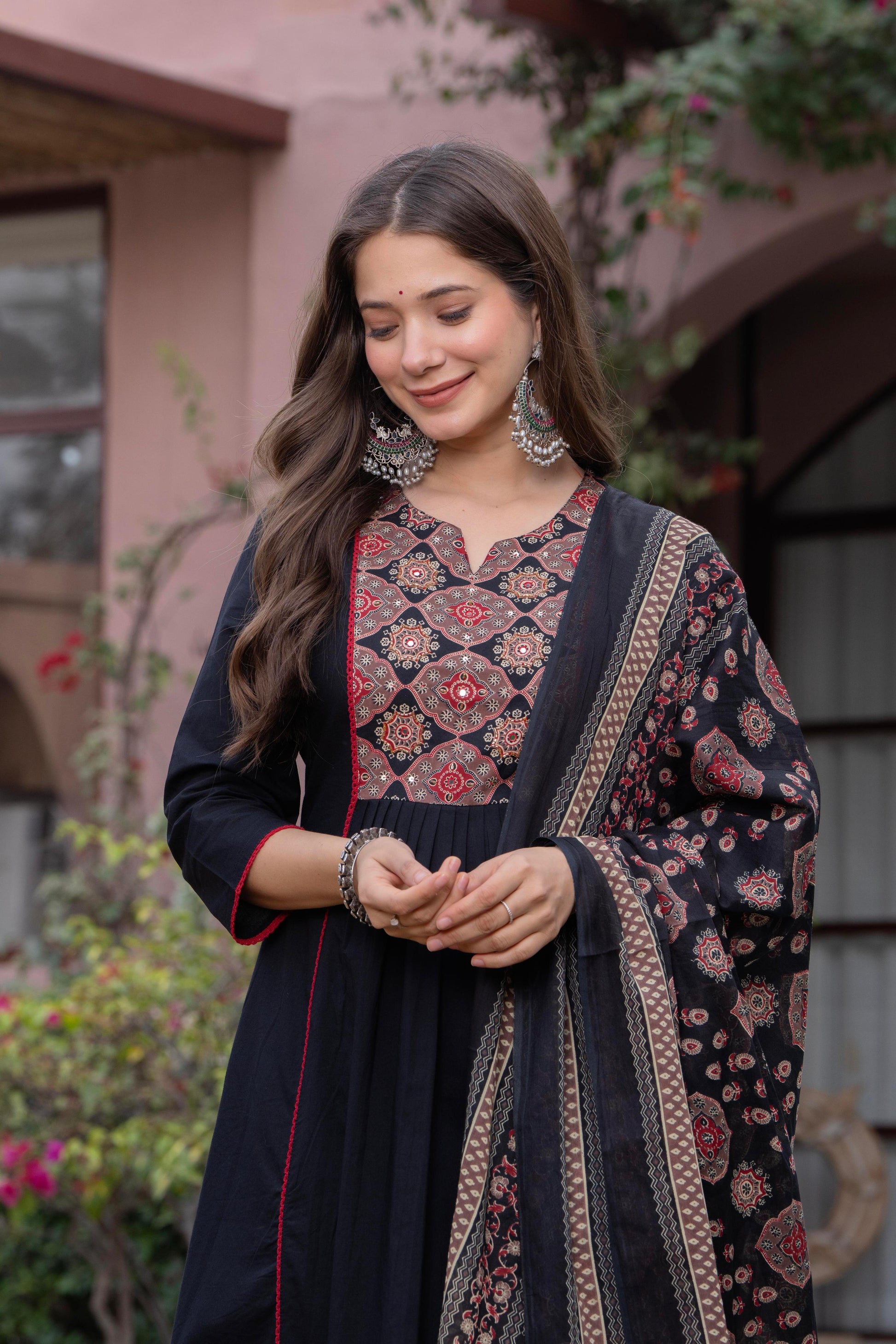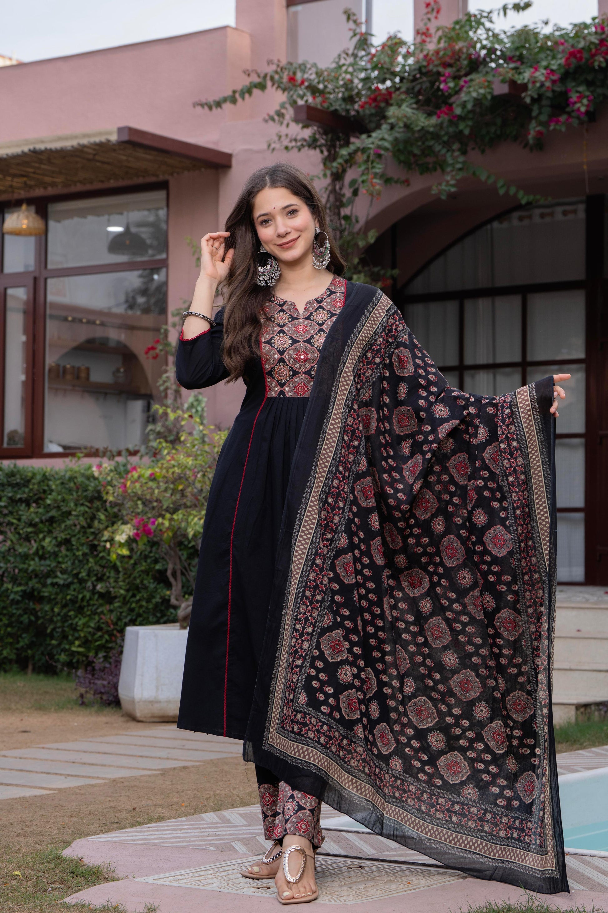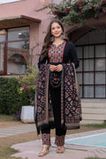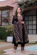 Step into timeless elegance with our pleated Ajrak Black Suit Set, a perfect blend of tradition and contemporary charm. Crafted in a rich black base, the pleated features intricate Ajrak-inspired motifs on the yoke, enhanced with delicate detailing that adds depth and character.