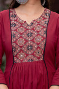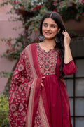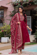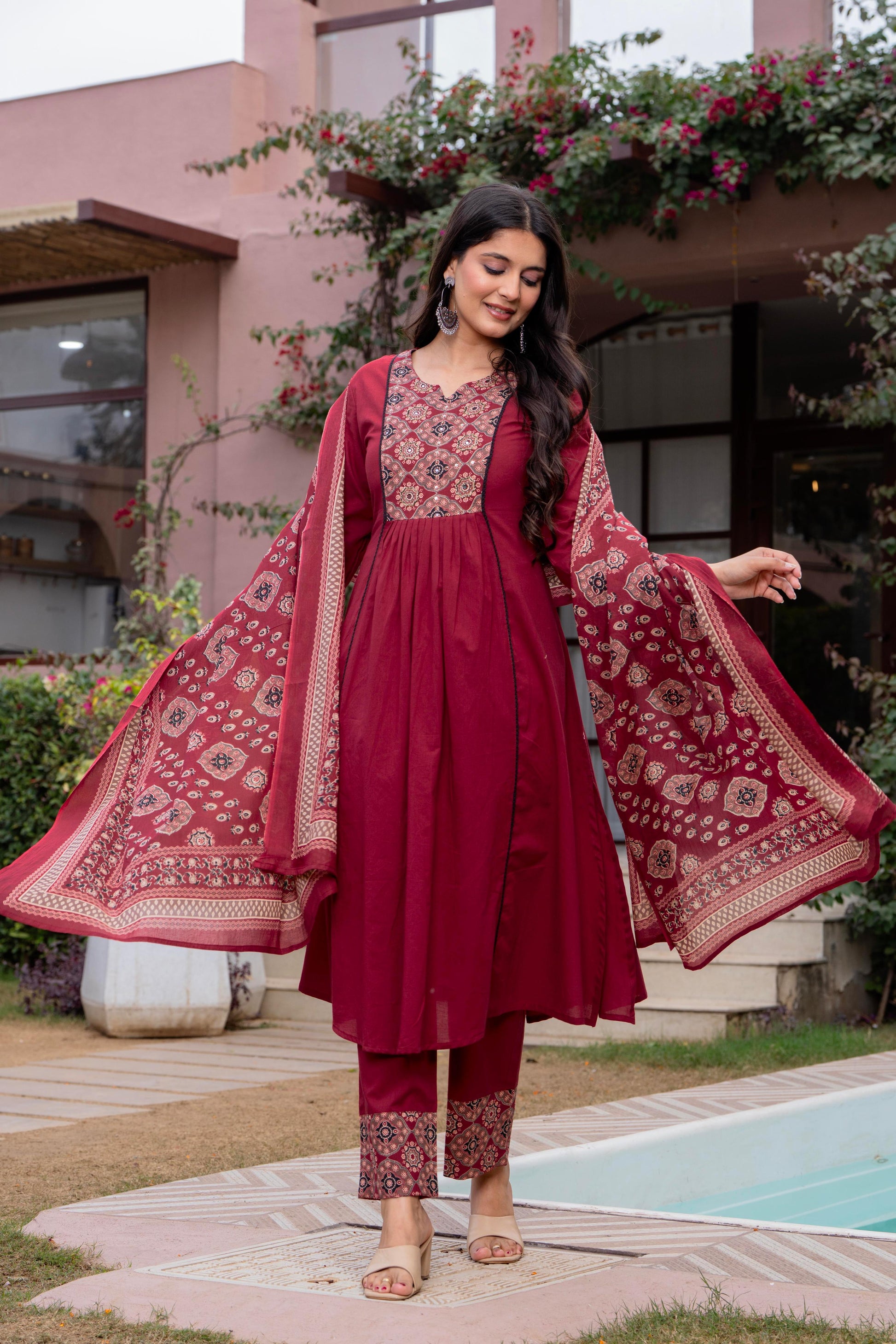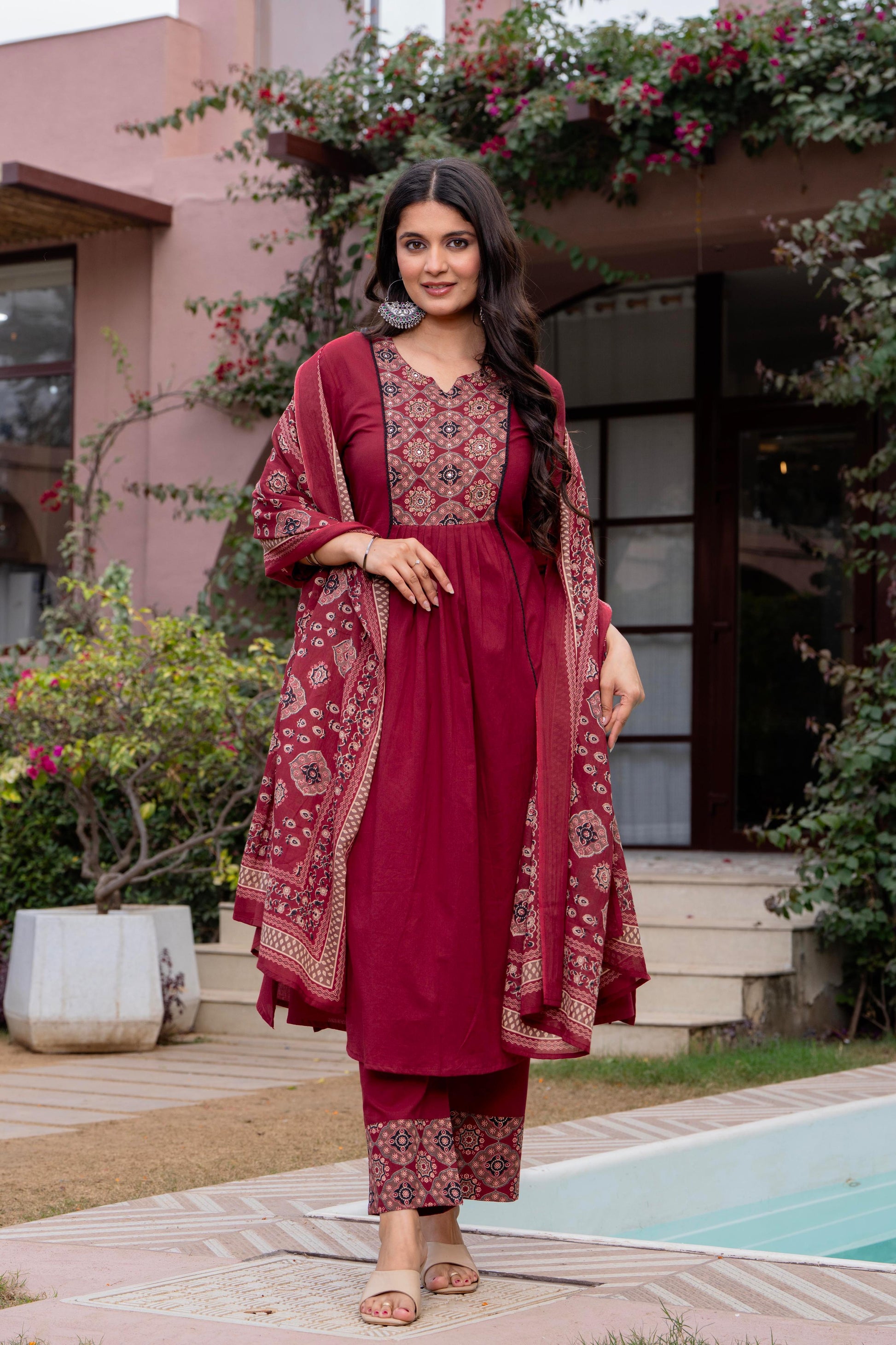 Step into timeless elegance with our pleated Ajrak Maroon Suit Set, a perfect blend of tradition and contemporary charm. Crafted in a rich maroon base, the pleated features intricate Ajrak-inspired motifs on the yoke, enhanced with delicate detailing that adds depth and character.