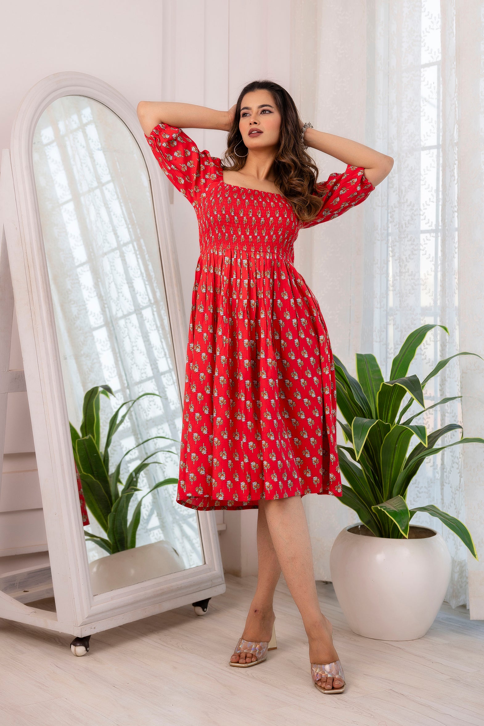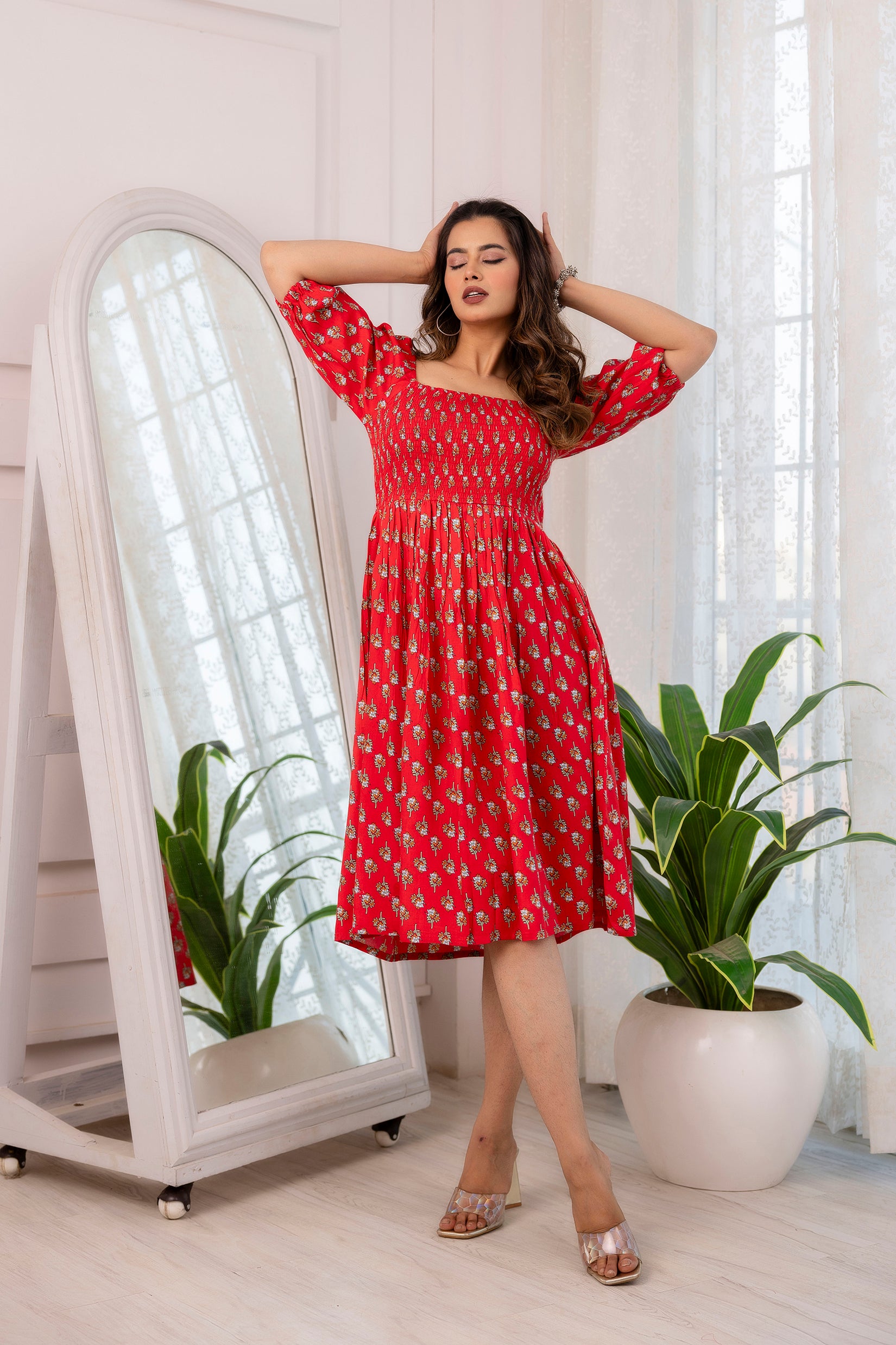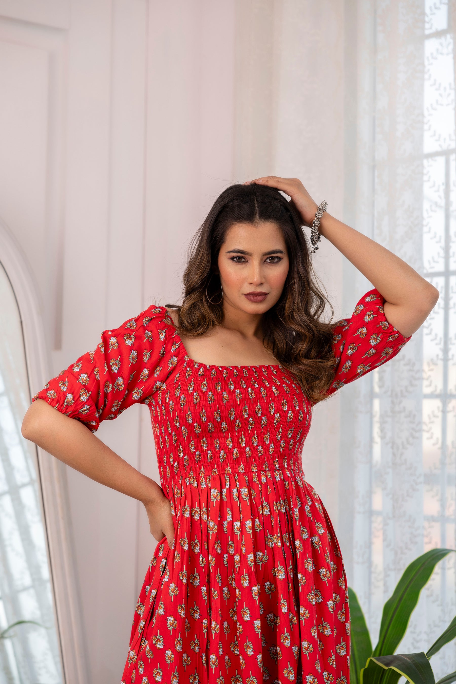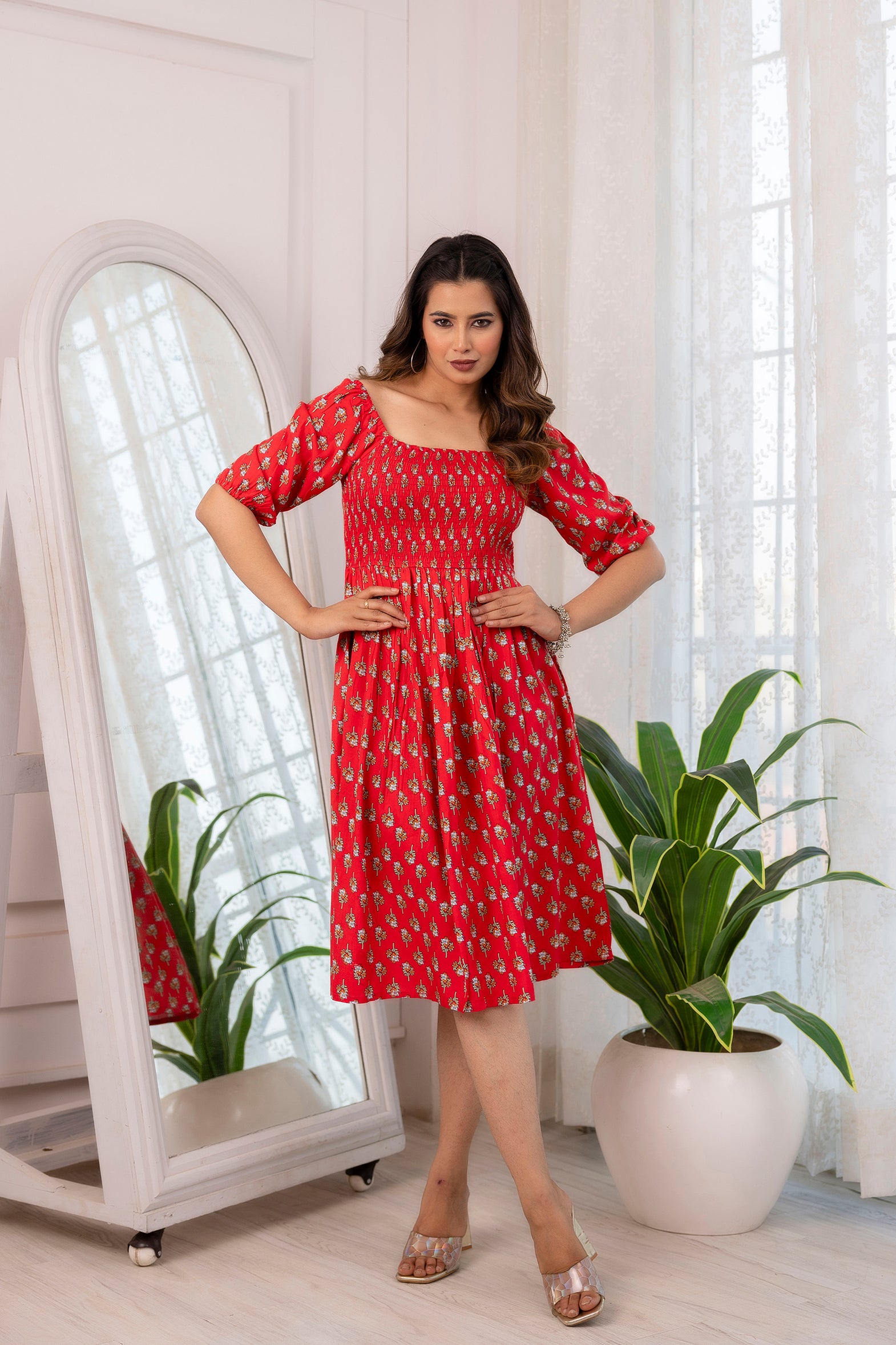 Step into effortless style with this vibrant red smocked dress.Featuring a flattering square neckline and smocked bodice, this dress is designed to accentuate your silhouette while offering all-day comfort. The puffed half sleeves add a touch of femininity, while the flared knee-length hem creates a breezy, playful vibe. Adorned with delicate all-over prints, this dress is perfect for casual outings, brunches, or holiday getaways.