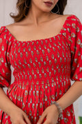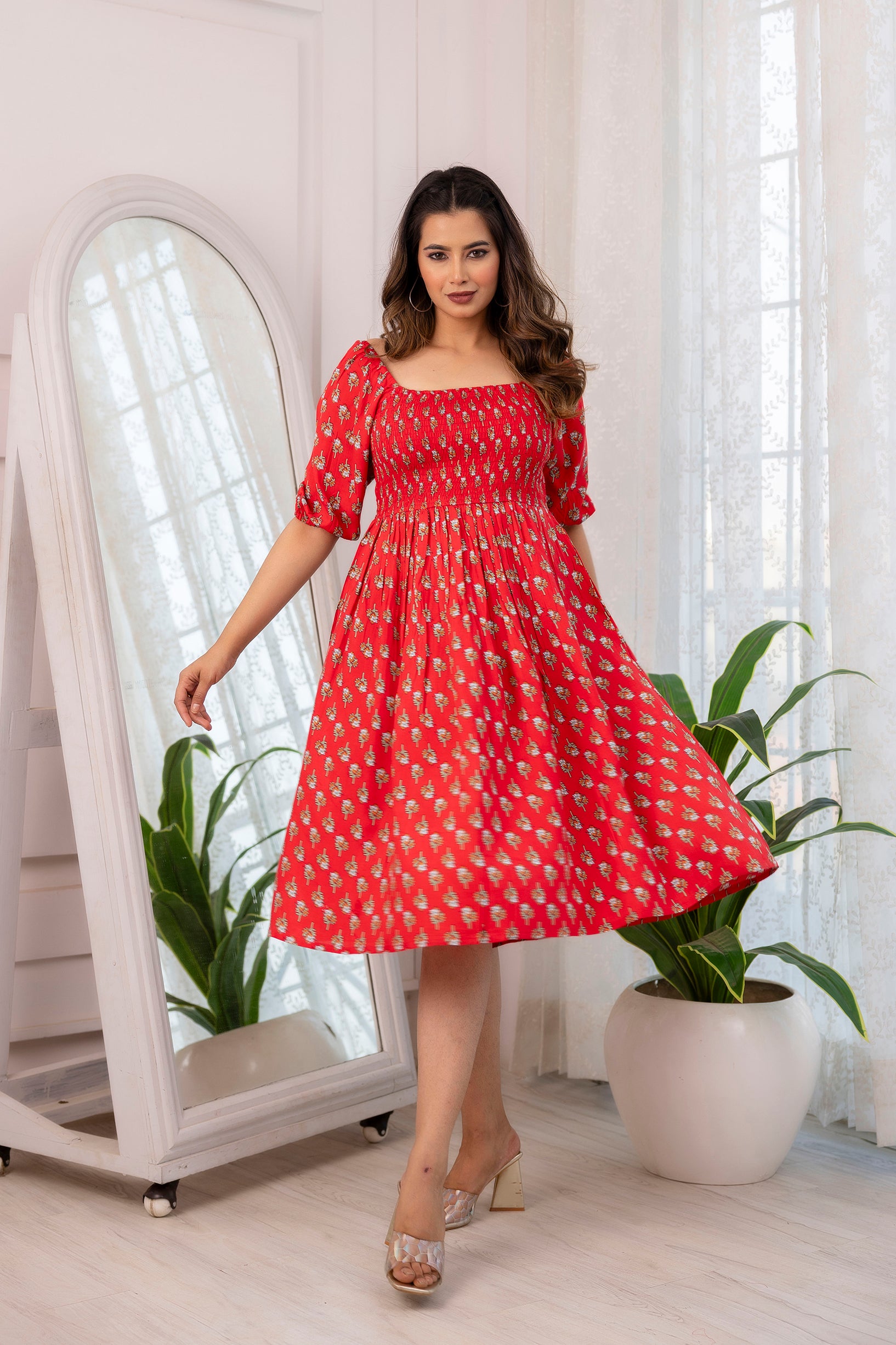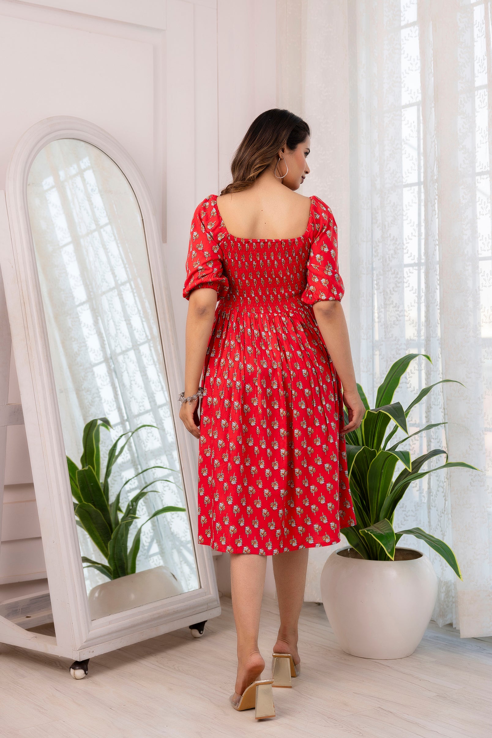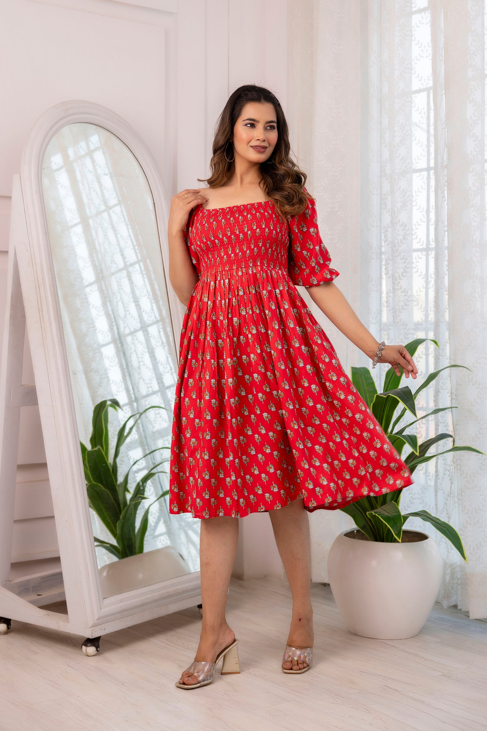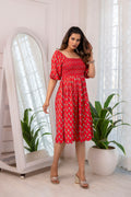 Step into effortless style with this vibrant red smocked dress.Featuring a flattering square neckline and smocked bodice, this dress is designed to accentuate your silhouette while offering all-day comfort. The puffed half sleeves add a touch of femininity, while the flared knee-length hem creates a breezy, playful vibe. Adorned with delicate all-over prints, this dress is perfect for casual outings, brunches, or holiday getaways.
