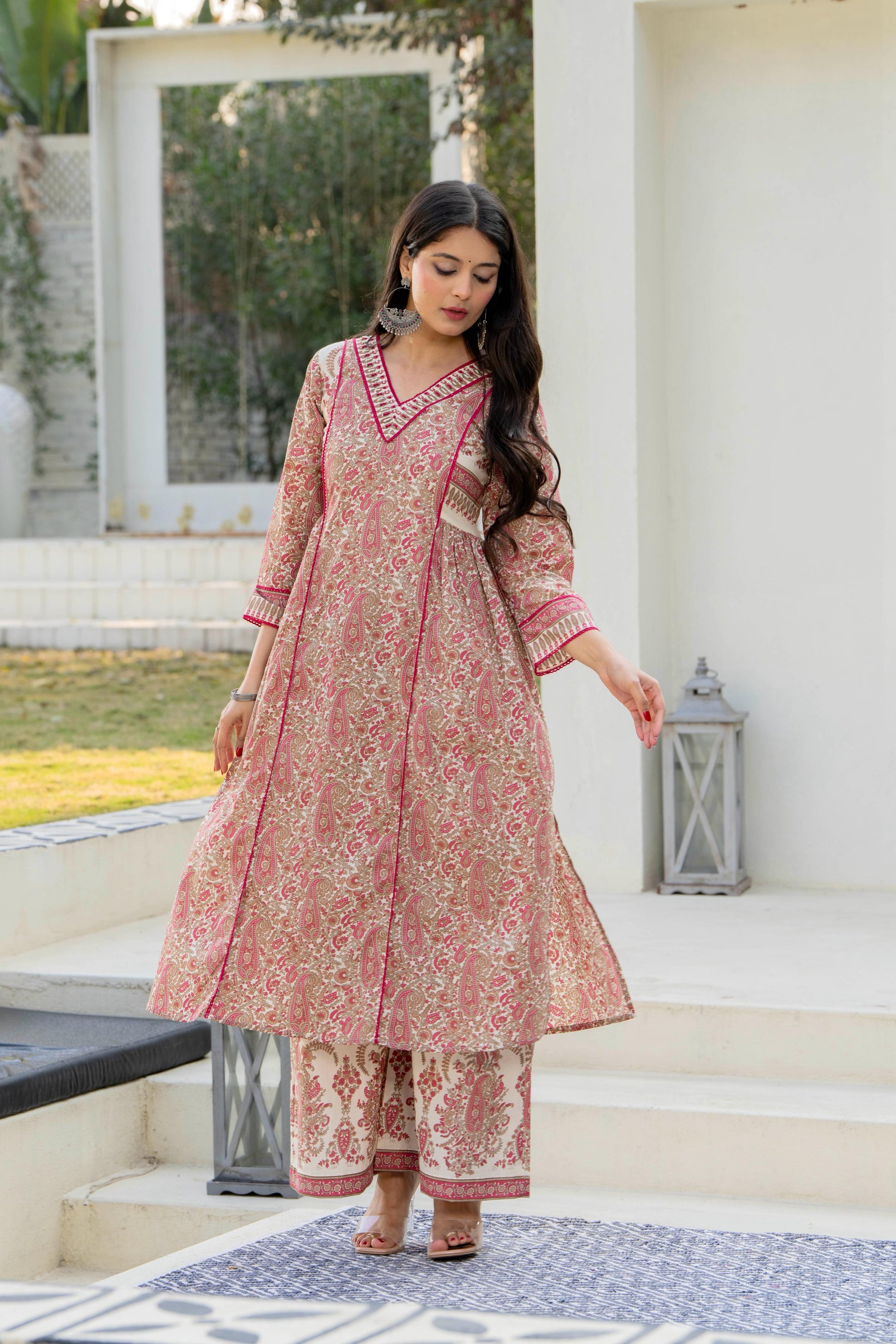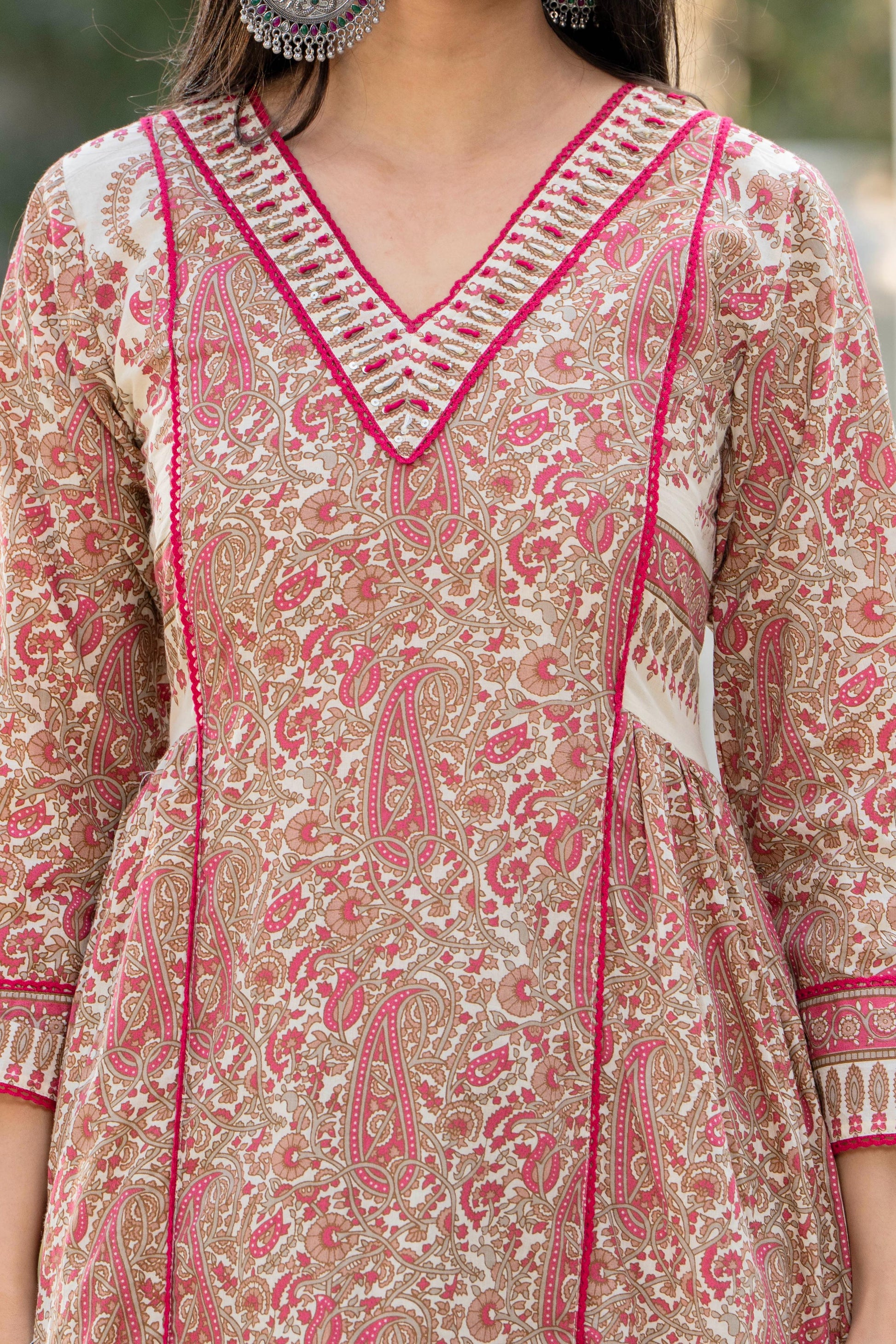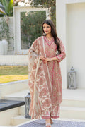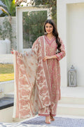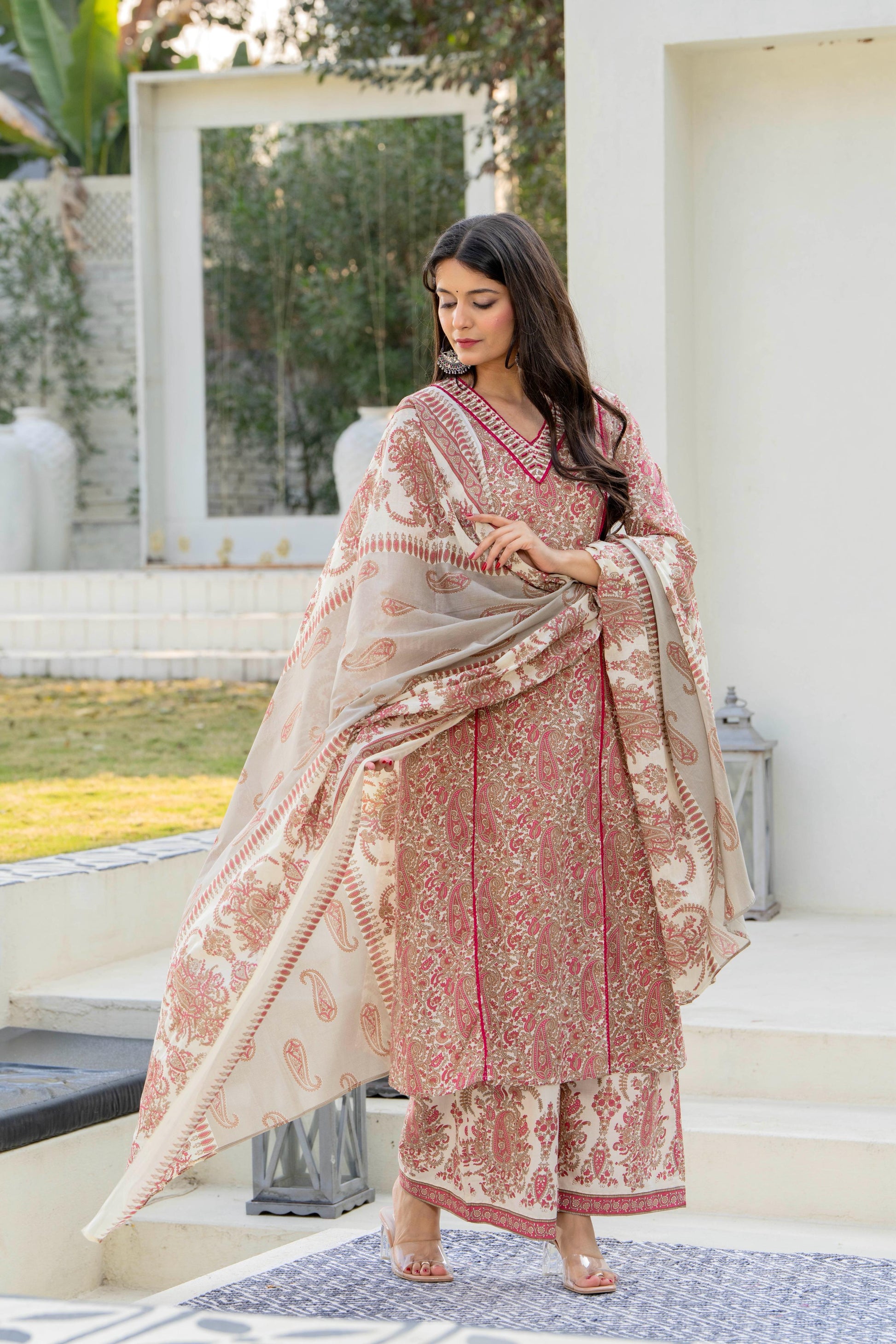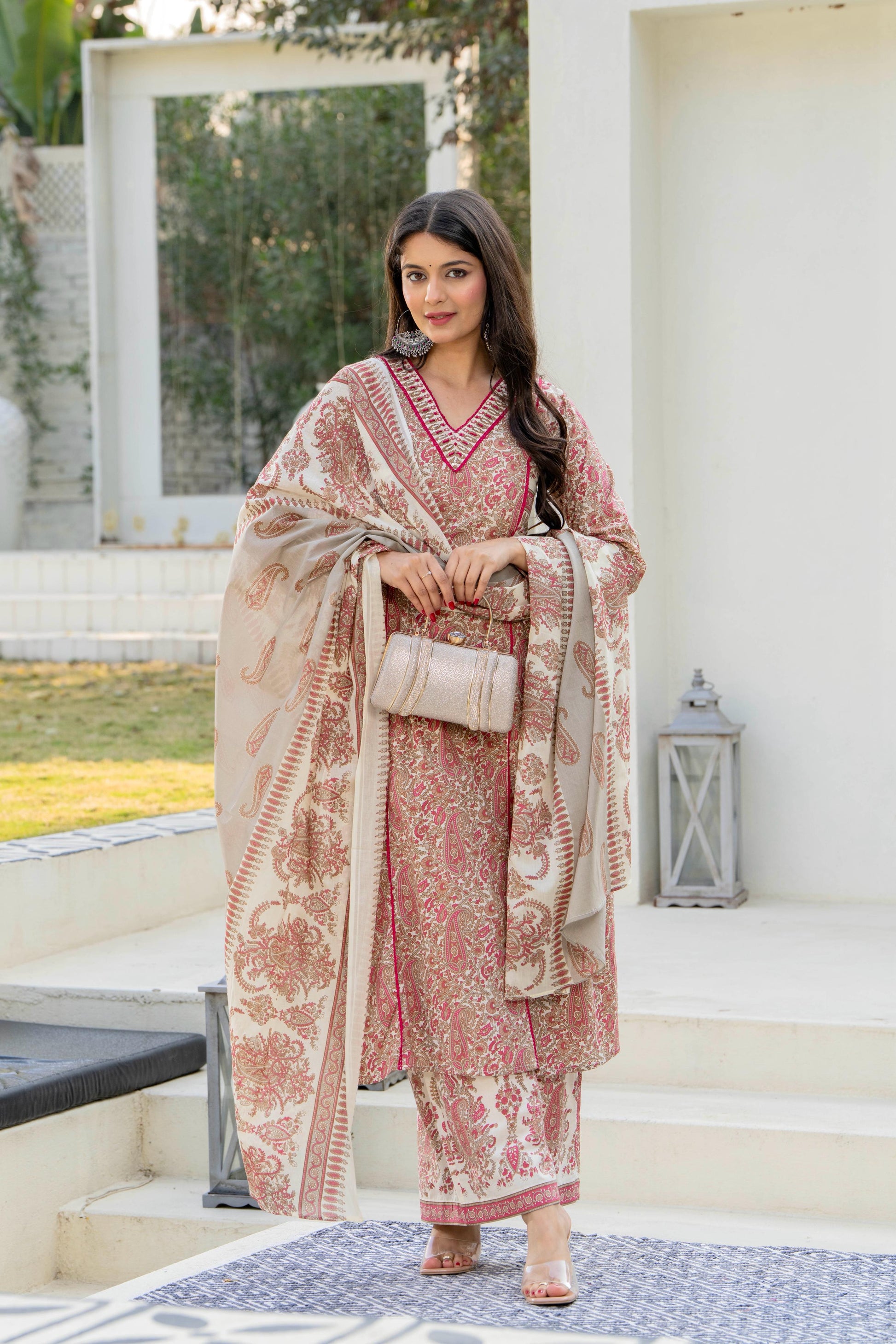 A timeless blend of grace and tradition, the Rose Paisley Suit Set features intricate all-over paisley prints in soft blush and ivory hues. The straight kurta is highlighted with a delicately embroidered V-neckline, paired with coordinated printed straight pants. Completing the look is a lightweight dupatta adorned with classic motifs, adding effortless charm. Perfect for festive gatherings, daytime celebrations, and elegant occasions.